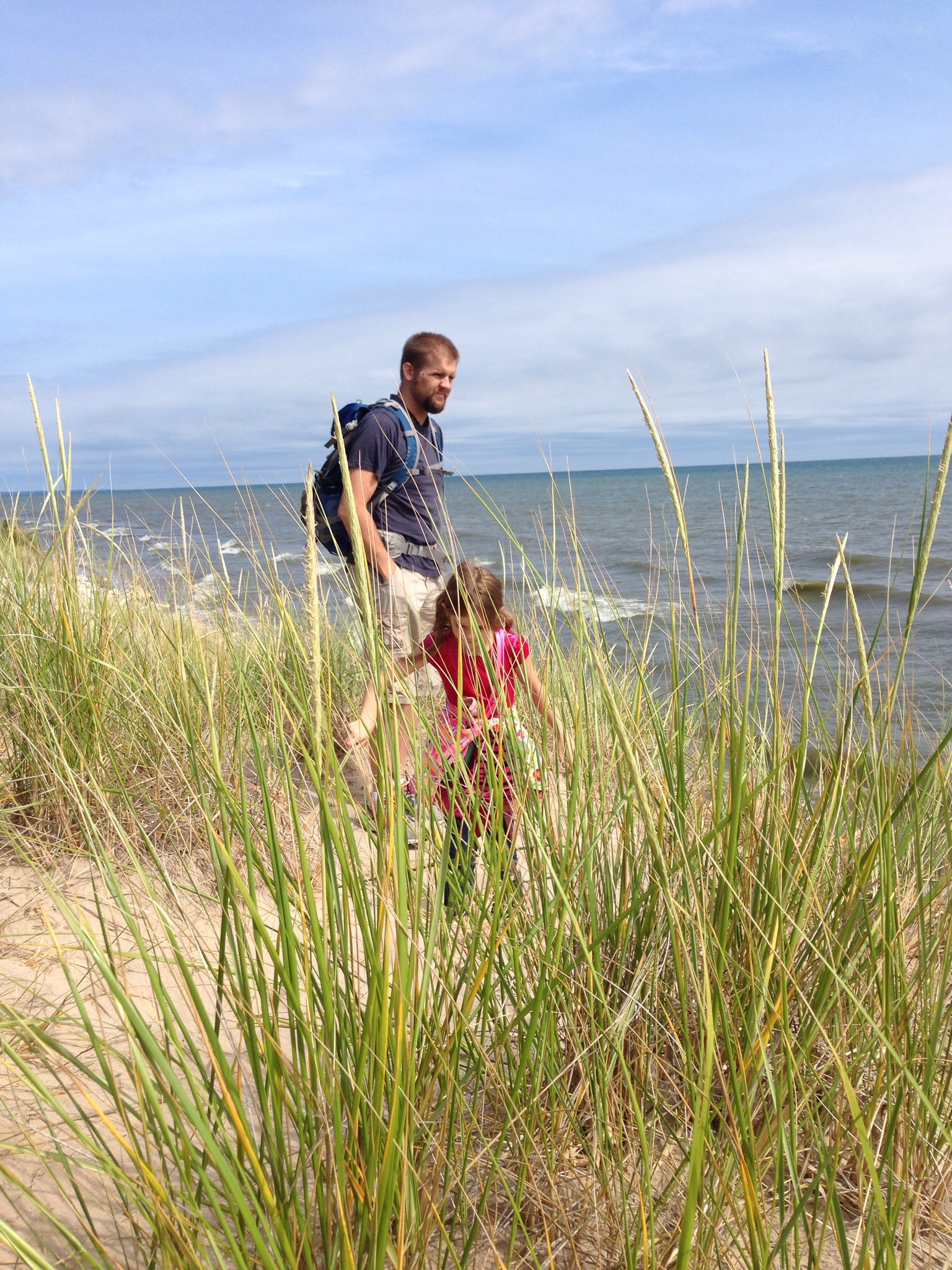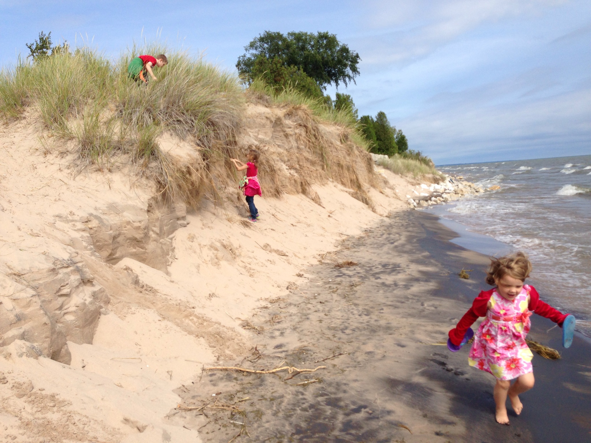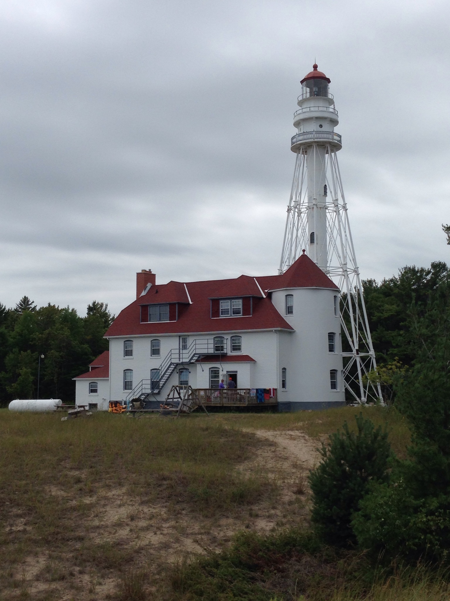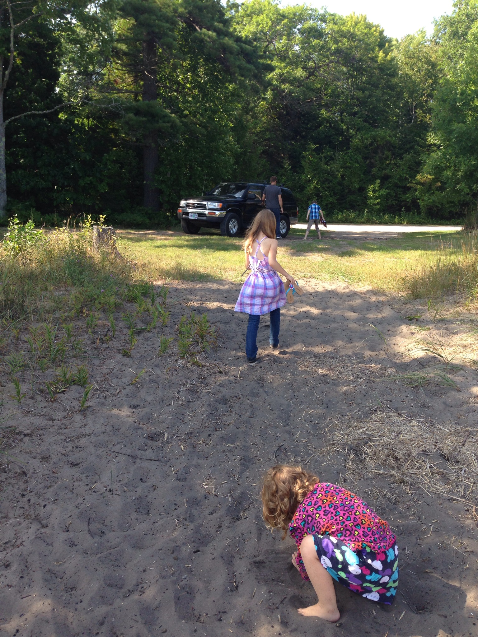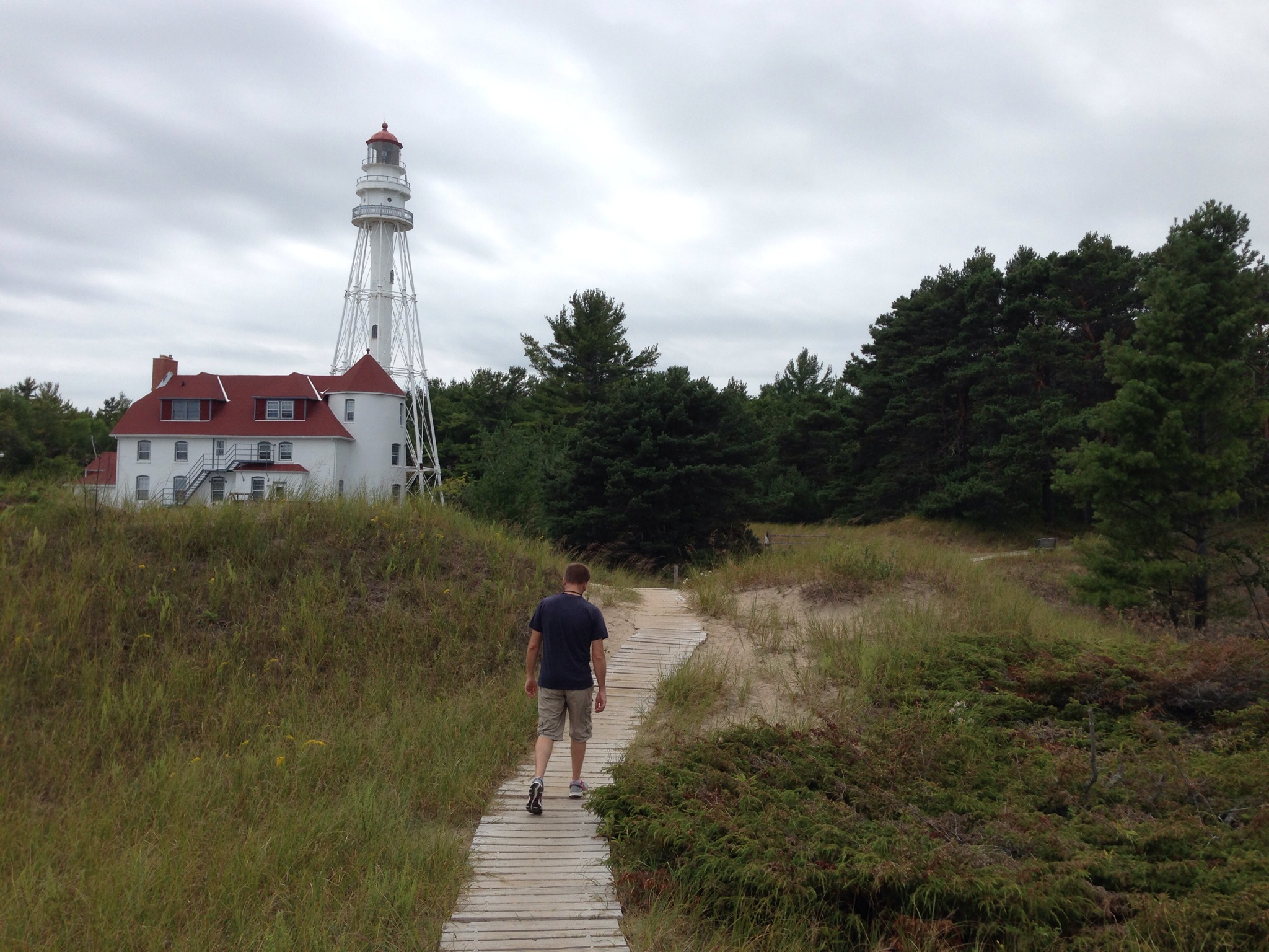 After our late lunch Chad walked up the beach to find the light house while the kids and I continued to play and soak in the sounds of the wind and waves. I was pulled from my happy place by a strange sound coming from the parking lot. I turned, it was a ranger and he was addressing me. “Ma’am no dogs allowed on the beach!” I looked around, and down the beach. Chad was out of sight with the car keys. All three kids were in the water. I couldn’t leave them unattended. I finally got their attention and got them up on the beach. I had the big kids sit by our stuff, and Eve walked with me up to the car (it was a ways and meant the big kids were unattended while I did this which I guess was less worry some to the officer than the dog being on the beach). Then having no keys to put Myra in the car, I tied her to the bumper and quickly returned to the 7 and 9 year old. I looked around and saw no signs that prohibited dogs on the beach in case I had missed something the first time. As soon as Chad returned I had him check on Myra and put her in the car half expecting that he would return and say that she wasn’t there only a note saying the ranger had taken her because we had been negligent in leaving her tied to the bumper of our car in the parking lot. He didn’t, she was still there and fine. We knew that you couldn’t have a dog at the public parks in Wisconsin but it didn’t cross our minds that she couldn’t be at the beach either. I sometimes have trouble with letting one little thing ruin my whole day and it had been such an amazing day. I have let it go now, and some day I will be better at not letting these things get to me. I do feel like Wisconsin is such a beautiful state it is too bad that it’s so dog unfriendly it has been a total turn off. We will still thoroughly enjoy our time here but hopefully living here long term is not in our future. We didn’t stay too much longer after Chad got back. But we couldn’t leave without seeing the light house.