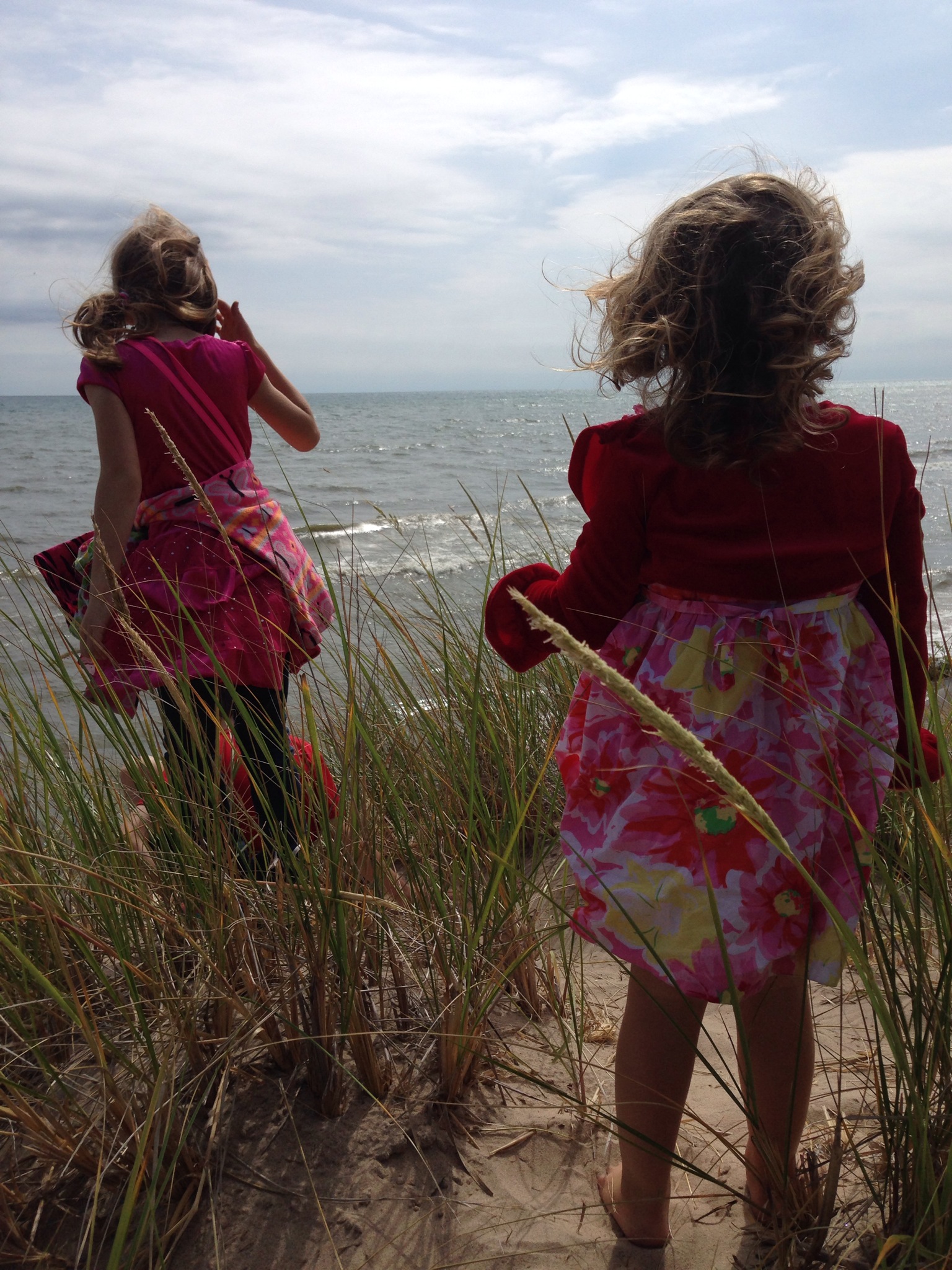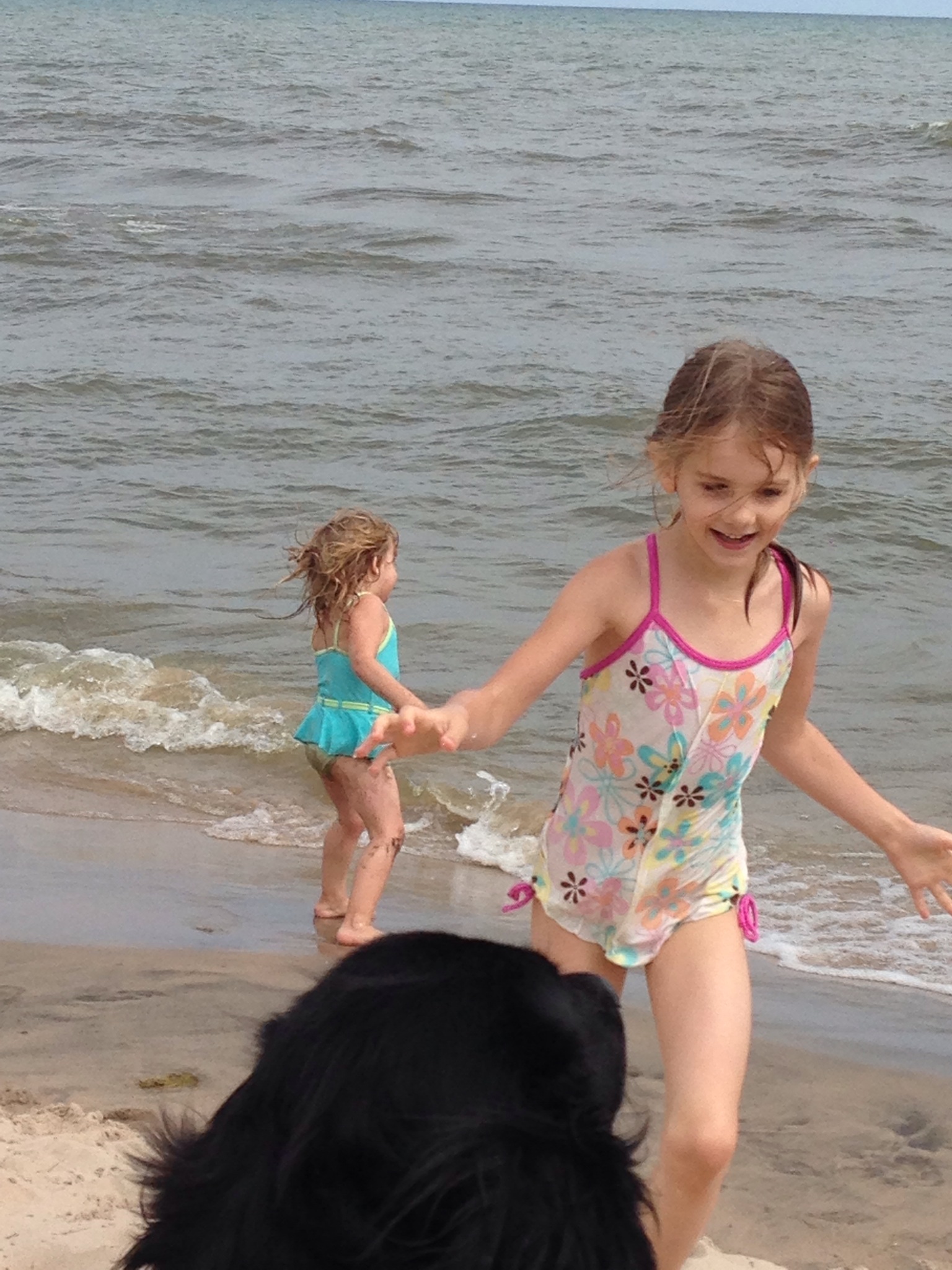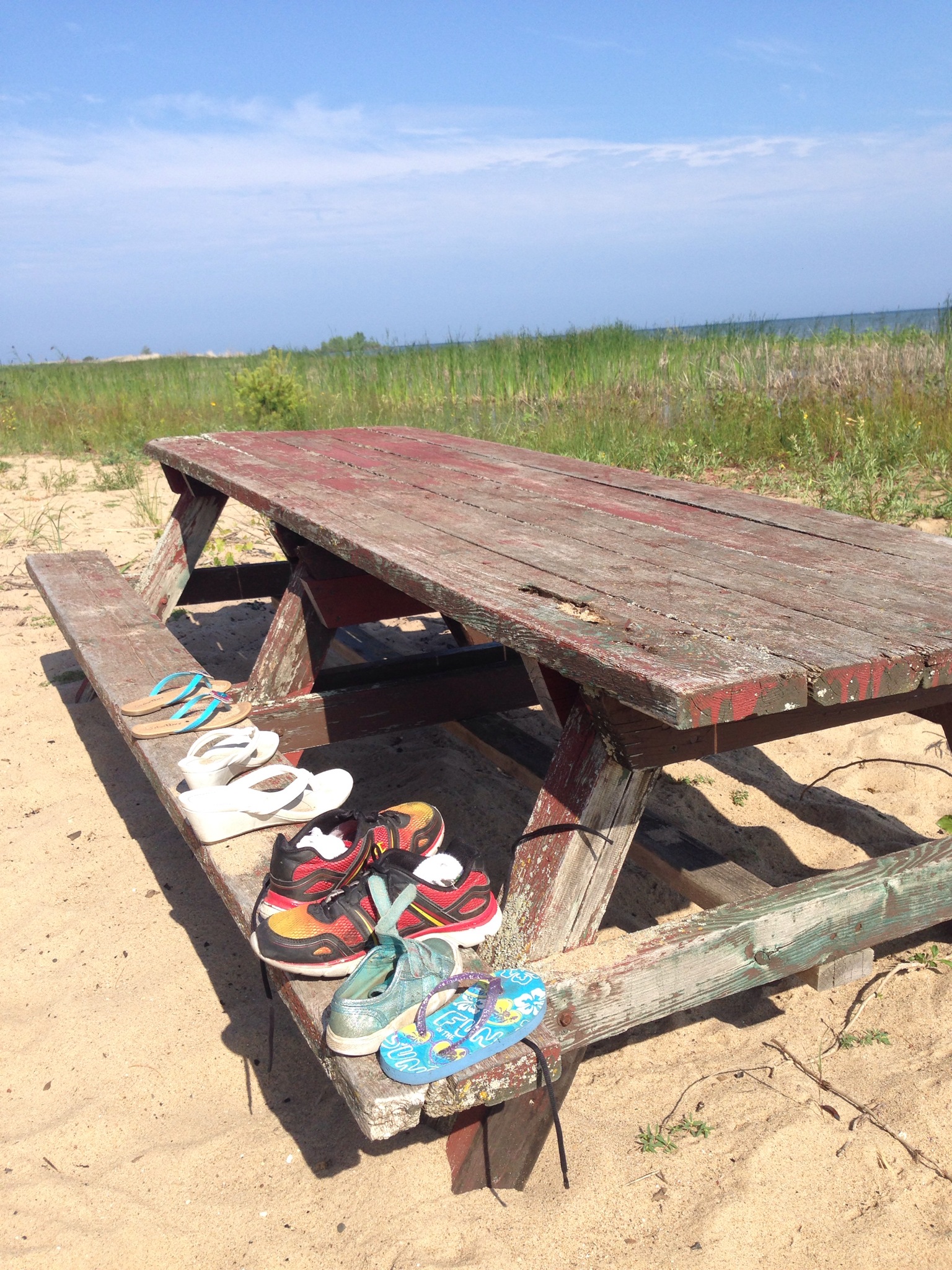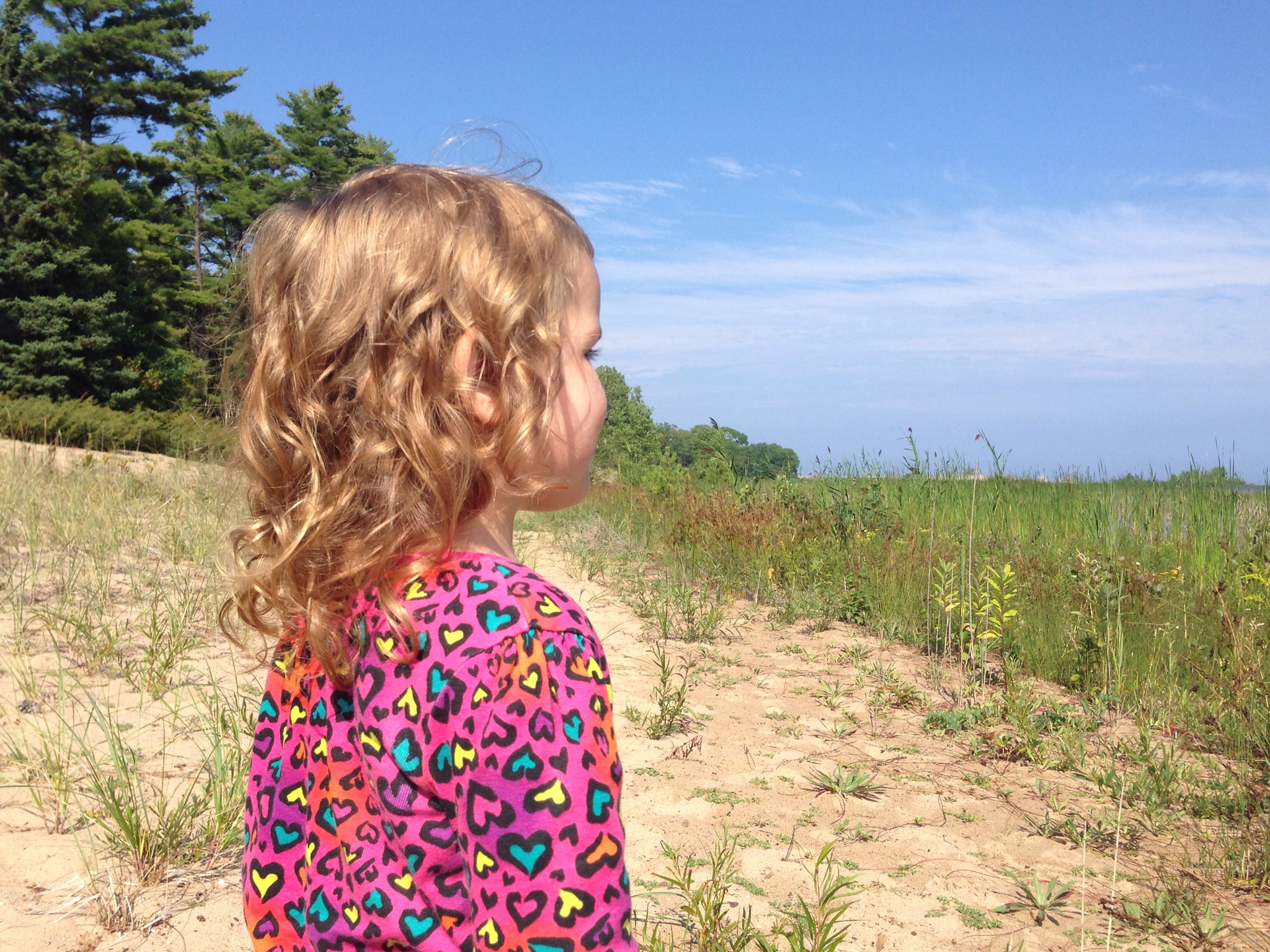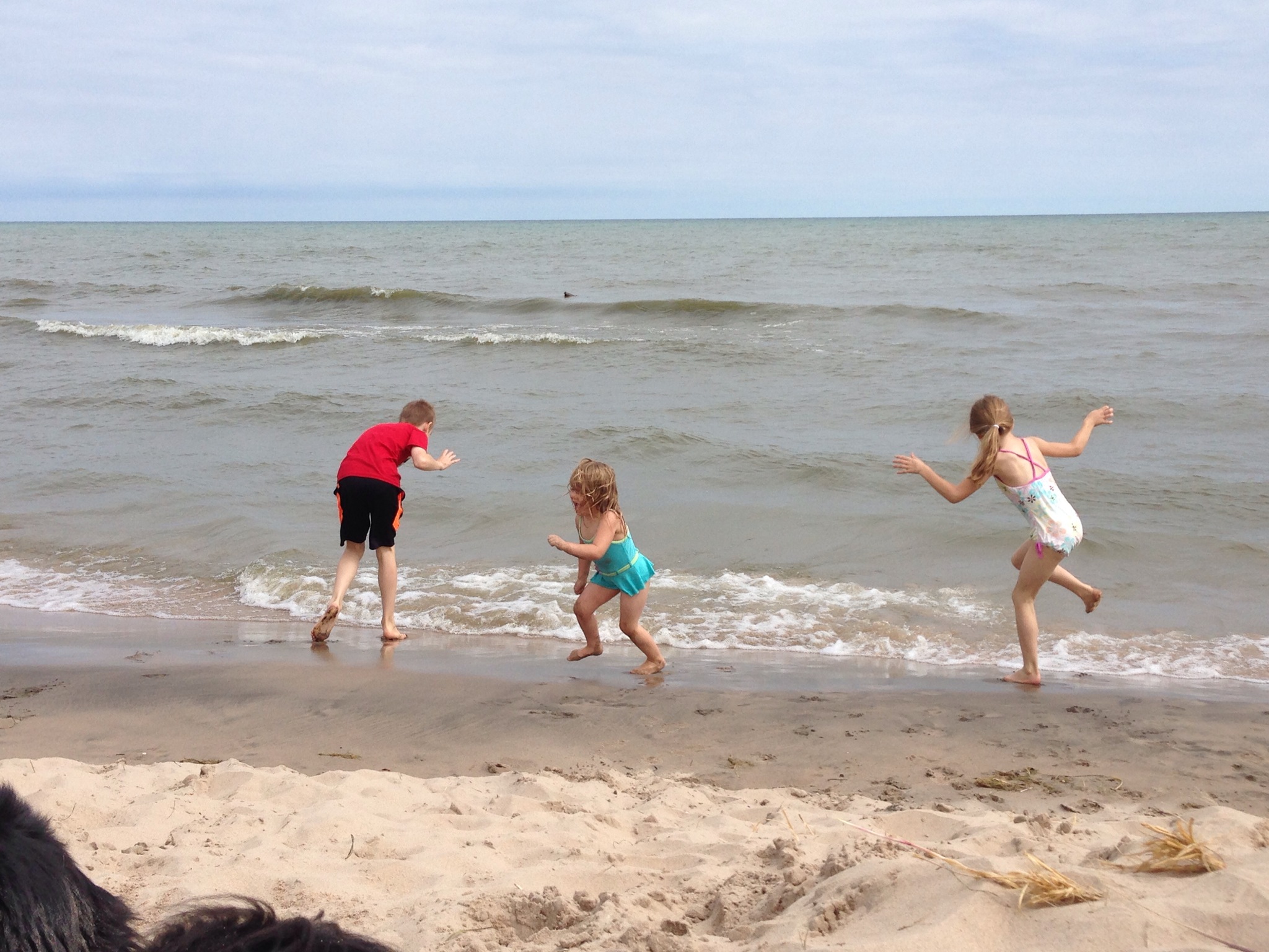 After our late lunch Chad walked up the beach to find the light house while the kids and I continued to play and soak in the sounds of the wind and waves. I was pulled from my happy place by a strange sound coming from the parking lot. I turned, it was a ranger and he was addressing me. “Ma’am no dogs allowed on the beach!” I looked around, and down the beach. Chad was out of sight with the car keys. All three kids were in the water. I couldn’t leave them unattended. I finally got their attention and got them up on the beach. I had the big kids sit by our stuff, and Eve walked with me up to the car (it was a ways and meant the big kids were unattended while I did this which I guess was less worry some to the officer than the dog being on the beach). Then having no keys to put Myra in the car, I tied her to the bumper and quickly returned to the 7 and 9 year old. I looked around and saw no signs that prohibited dogs on the beach in case I had missed something the first time. As soon as Chad returned I had him check on Myra and put her in the car half expecting that he would return and say that she wasn’t there only a note saying the ranger had taken her because we had been negligent in leaving her tied to the bumper of our car in the parking lot. He didn’t, she was still there and fine. We knew that you couldn’t have a dog at the public parks in Wisconsin but it didn’t cross our minds that she couldn’t be at the beach either. I sometimes have trouble with letting one little thing ruin my whole day and it had been such an amazing day. I have let it go now, and some day I will be better at not letting these things get to me. I do feel like Wisconsin is such a beautiful state it is too bad that it’s so dog unfriendly it has been a total turn off. We will still thoroughly enjoy our time here but hopefully living here long term is not in our future. We didn’t stay too much longer after Chad got back. But we couldn’t leave without seeing the light house.