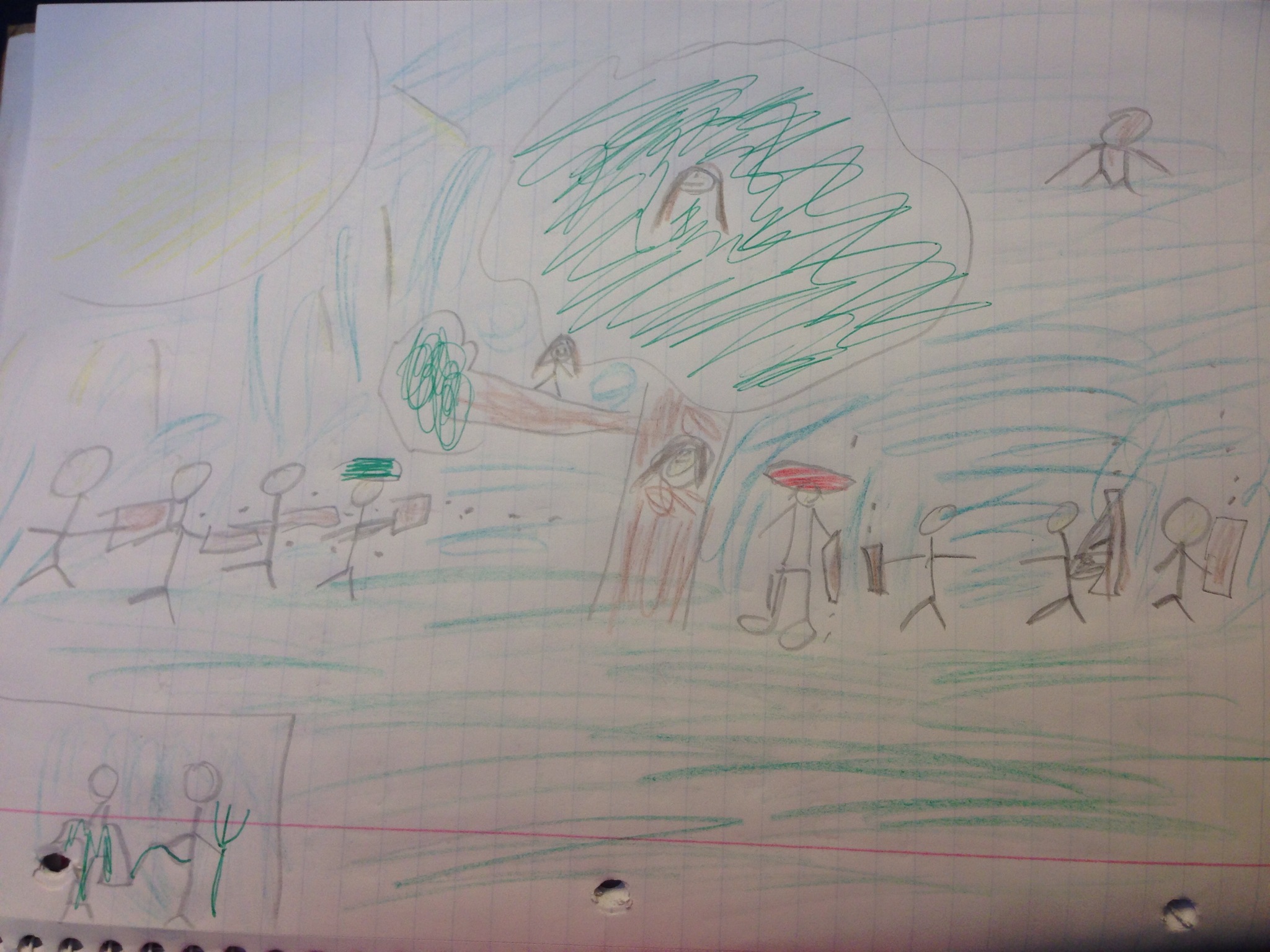 Notice the girl spies in the tree and the slave and his owner in the lower left corner. I both love it and find it interesting that she did not use color to indicate the person who was a slave in this picture.