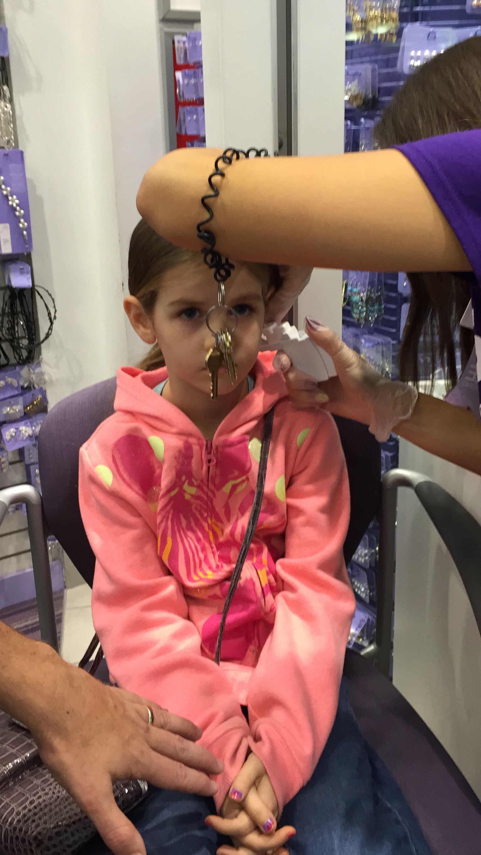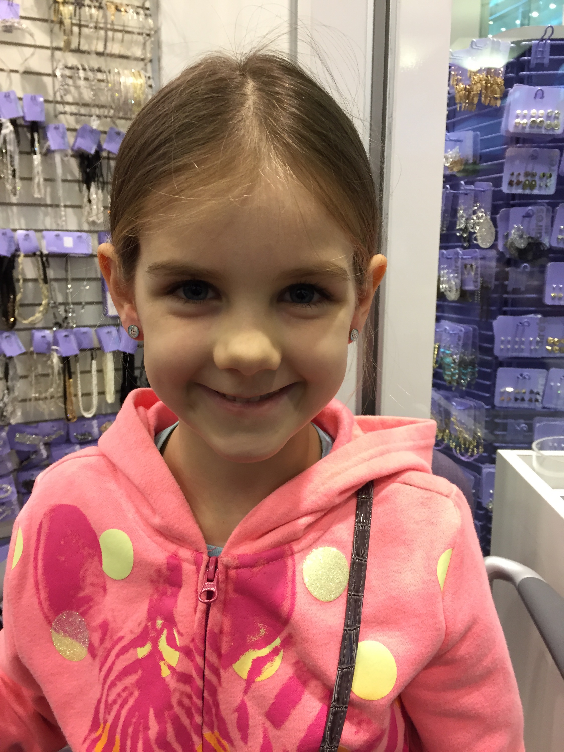 ‘Twas the day after Christmas and we had one gift to make good on. Hannah Banana has wanted to get her ears pierced for quite some years now and today was the day. I guess a lot of little girls got ear piercings for Christmas because there was quite a line and the employee doing the piercings said that she had been doing only that her whole shift, one right after another. Hannah had asked how bad it would hurt and I had explained that it felt like a brief pinch but that when Aunt Stephanie went to get her ears pierced I had told her it was like shooting pains that start at your ear and goes throughout your whole body. I think she liked the story and did not appear to be too nervous. She got a second opinion from Samantha on what to expect that set her at ease she watched the girls ahead of us in line who didn’t even flinch and were about her age. They had about 50 choices of earrings for piercing studs way more than the five options they had when it had been my turn. She picked Elsa and is very pleased with how it turned out.
