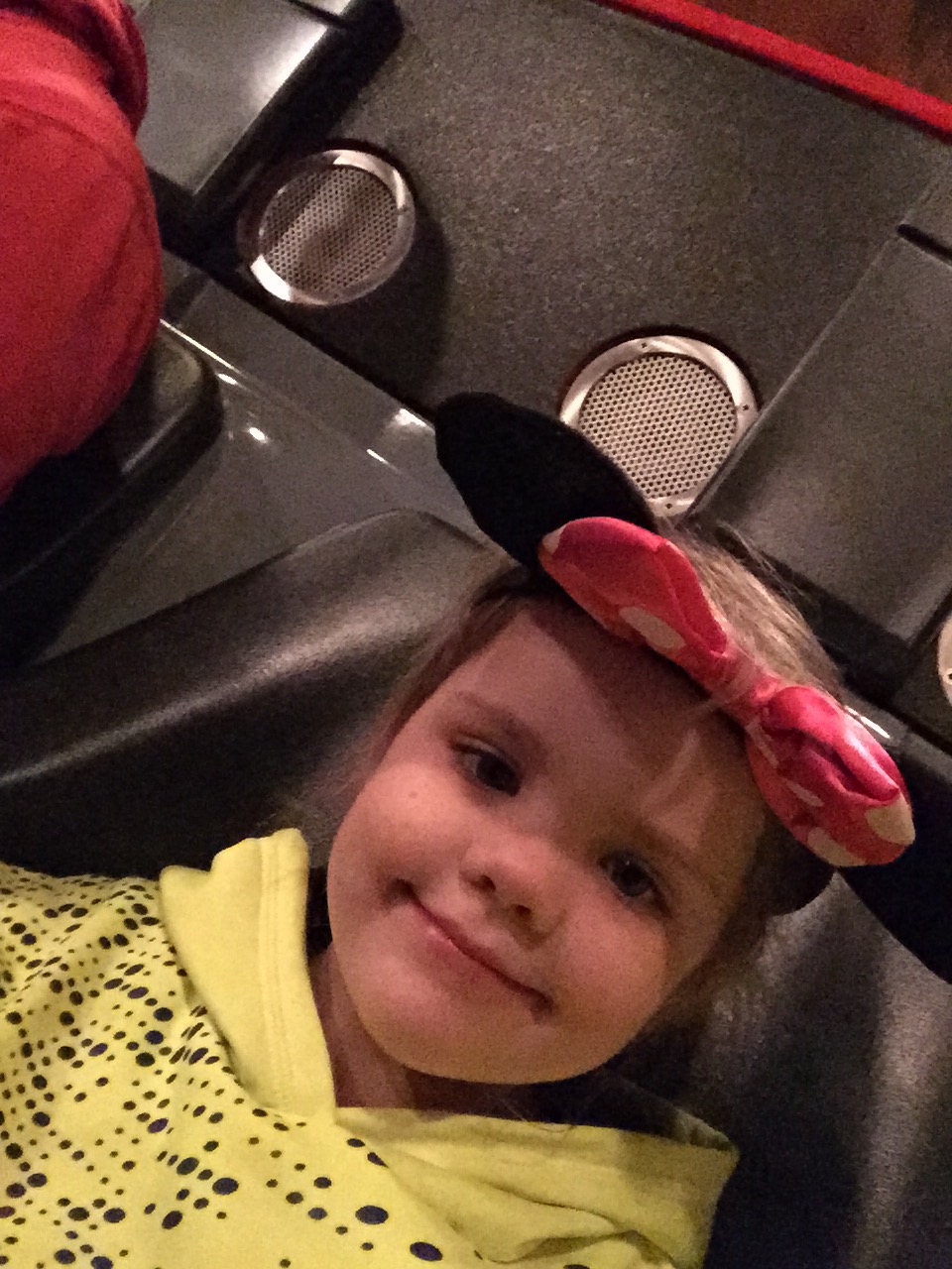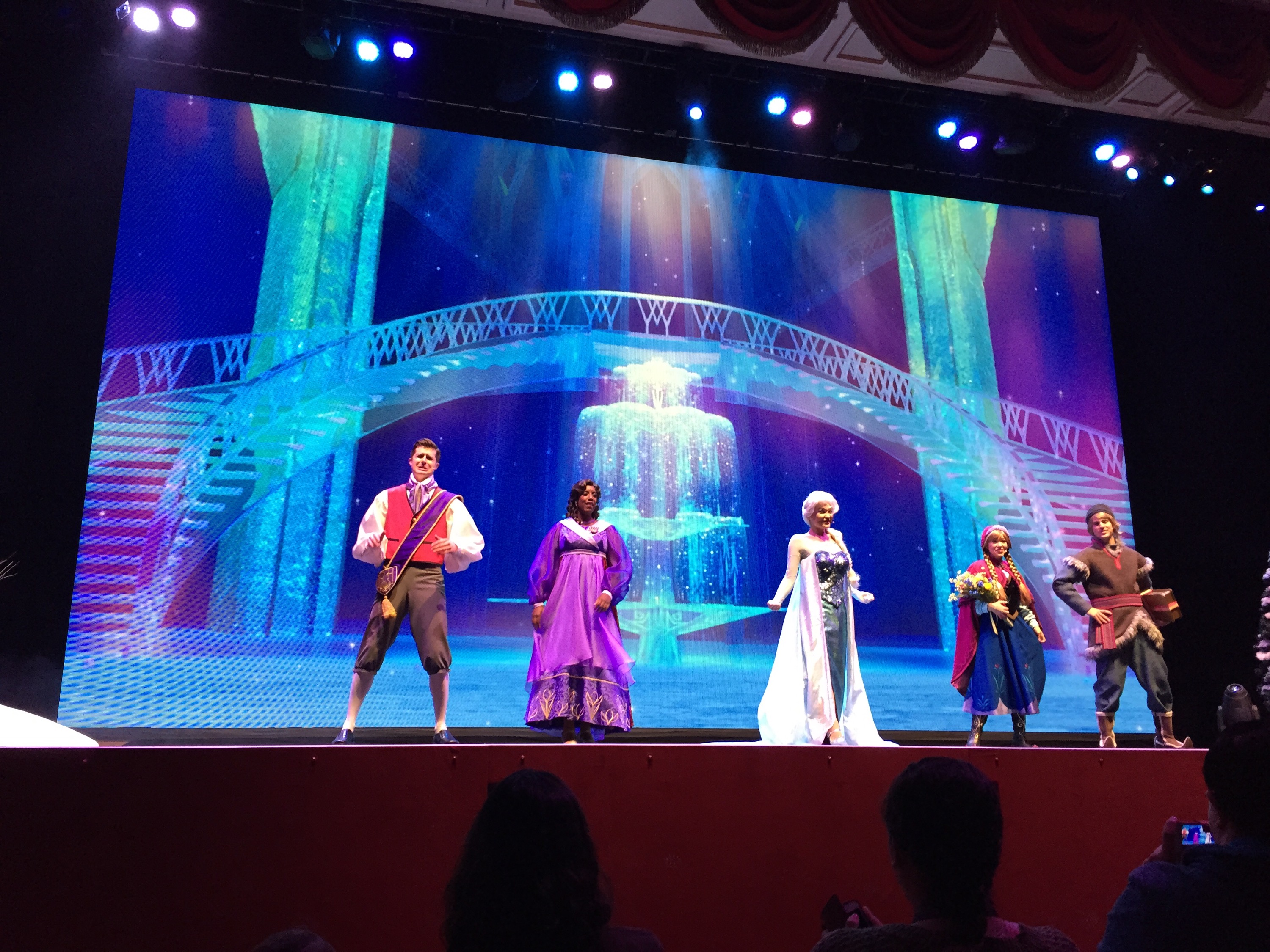 Eve wore the ears that grandma got for her at the hotel gift shop. The first segment of the park, Donna referred to as movie land, had advertised a frozen show. With the bugs life show closed and the girls being such big fans of Elsa and Anna we decided to do that first. The line was short for the 10:30 showing. We loved all the little Elsas and Annas dancing around the room where we waited to be seated. Our own two joining in on the fun. The show was a sing-a-long/play with the main non animal characters from frozen. The show was a hit.