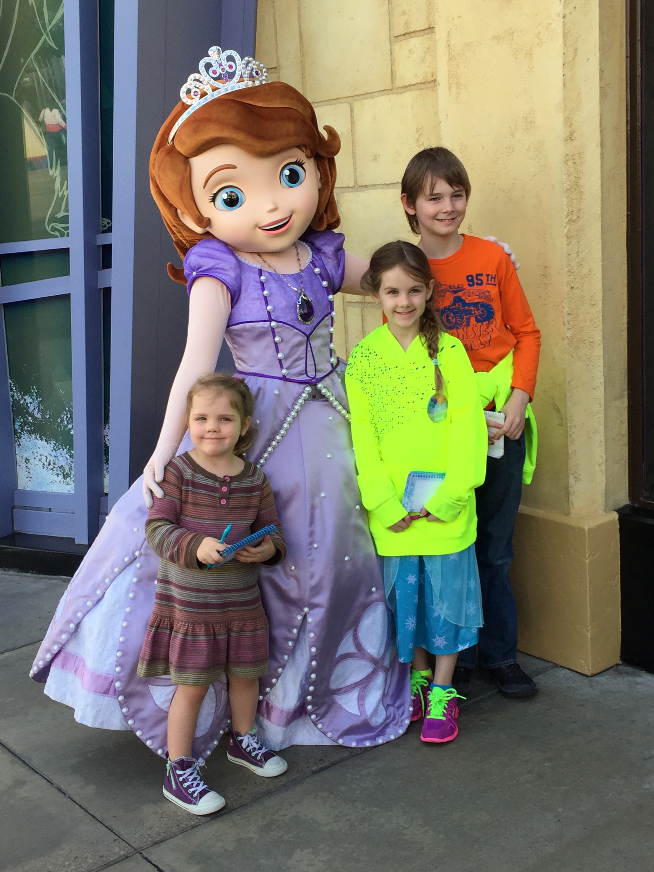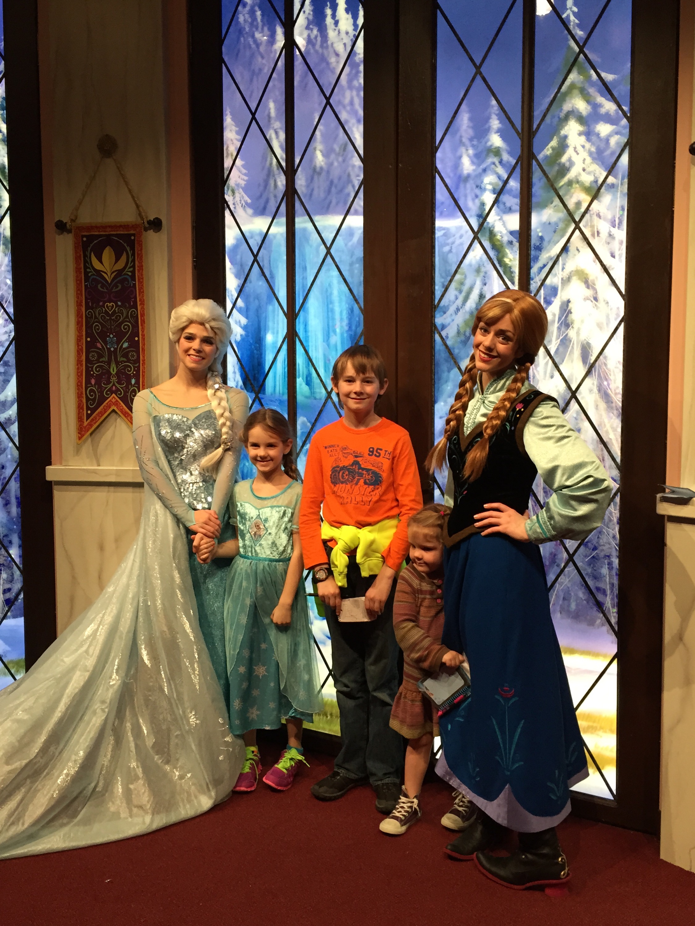 We split up for a few rides with the guys and Caleb doing tower of terror. Later Caleb said he shouldn’t have done that ride, it scared him and now he will probably have night mares. I told him that is why you have to protect yourself from seeing those things because once you have you cant just get the images out of your head. Maybe he learned something about himself. Of course then I should feel bad for making Eve go on some of the story rides with us just because we all wanted to go together. A parenting fail :0(. We loved Turtle Talk with Crush where he interacts with the crowd and ask us some questions while we ask him some questions. He picked Caleb for a question and he asked Crush what is the answer to the question of life the universe and everything. He answered “42, doesn’t everyone know that? And since you seem like such a smart guy maybe you can tell me something. I found this in the the beach the other day and have been trying to figure out what exactly it is.” (Holding up a bikini top) Caleb answered that it was some thing some girls use to cover their eyes when they are sleeping. Gotta love that kid. Then the kids met Elsa and Anna and got a few autographs.