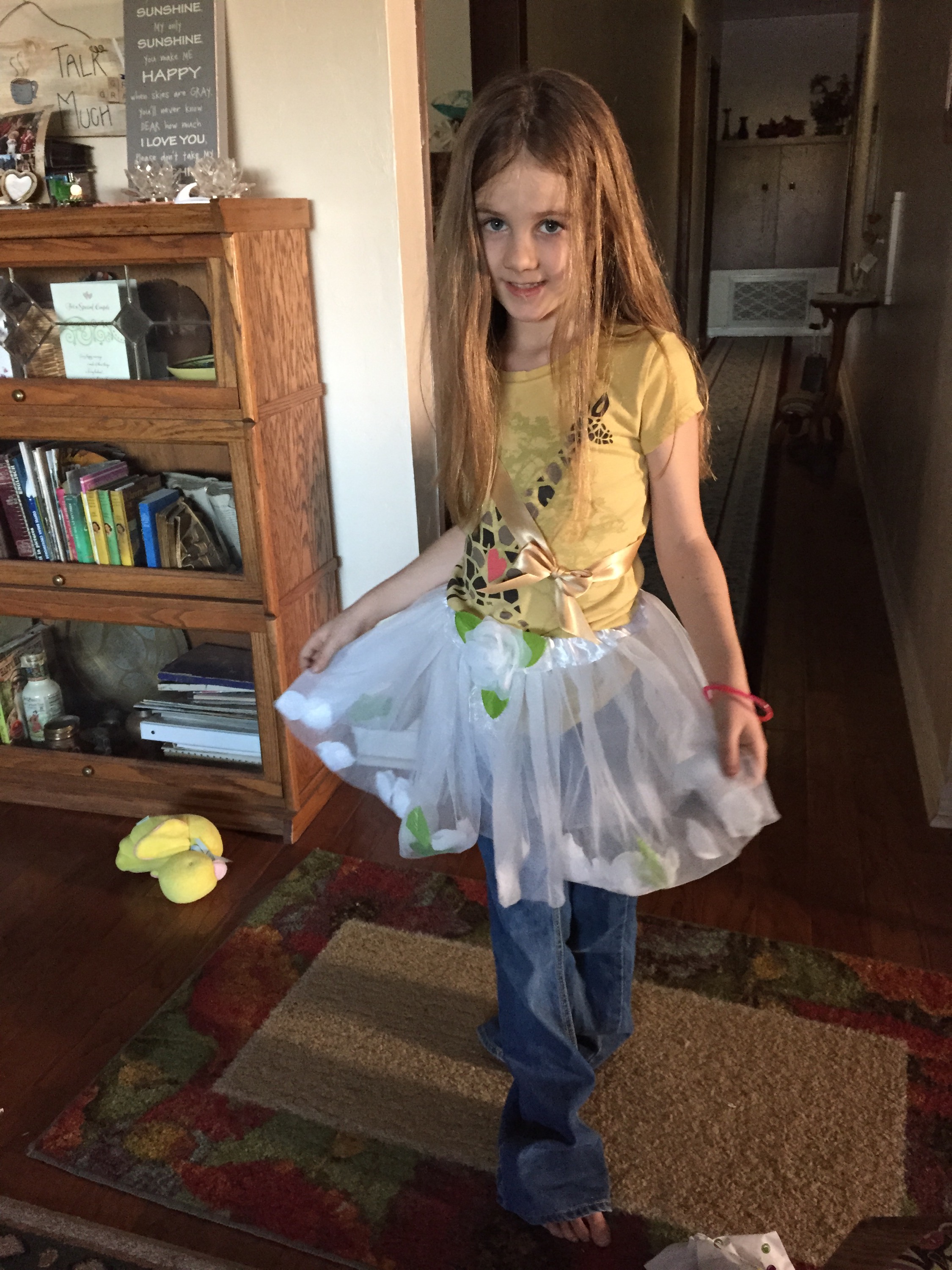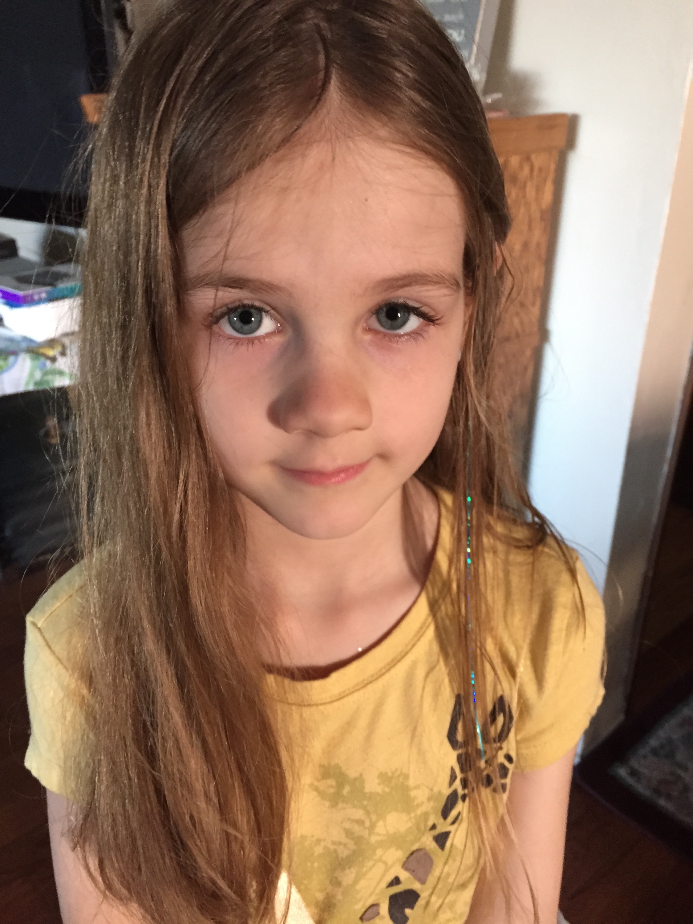 The hairdresser gave the girls each one strand of tensile tied into their hair. Eve’s was purple (she has already pulled it out) Hannah’s is turquoise but is hard to see with the length of her hair.