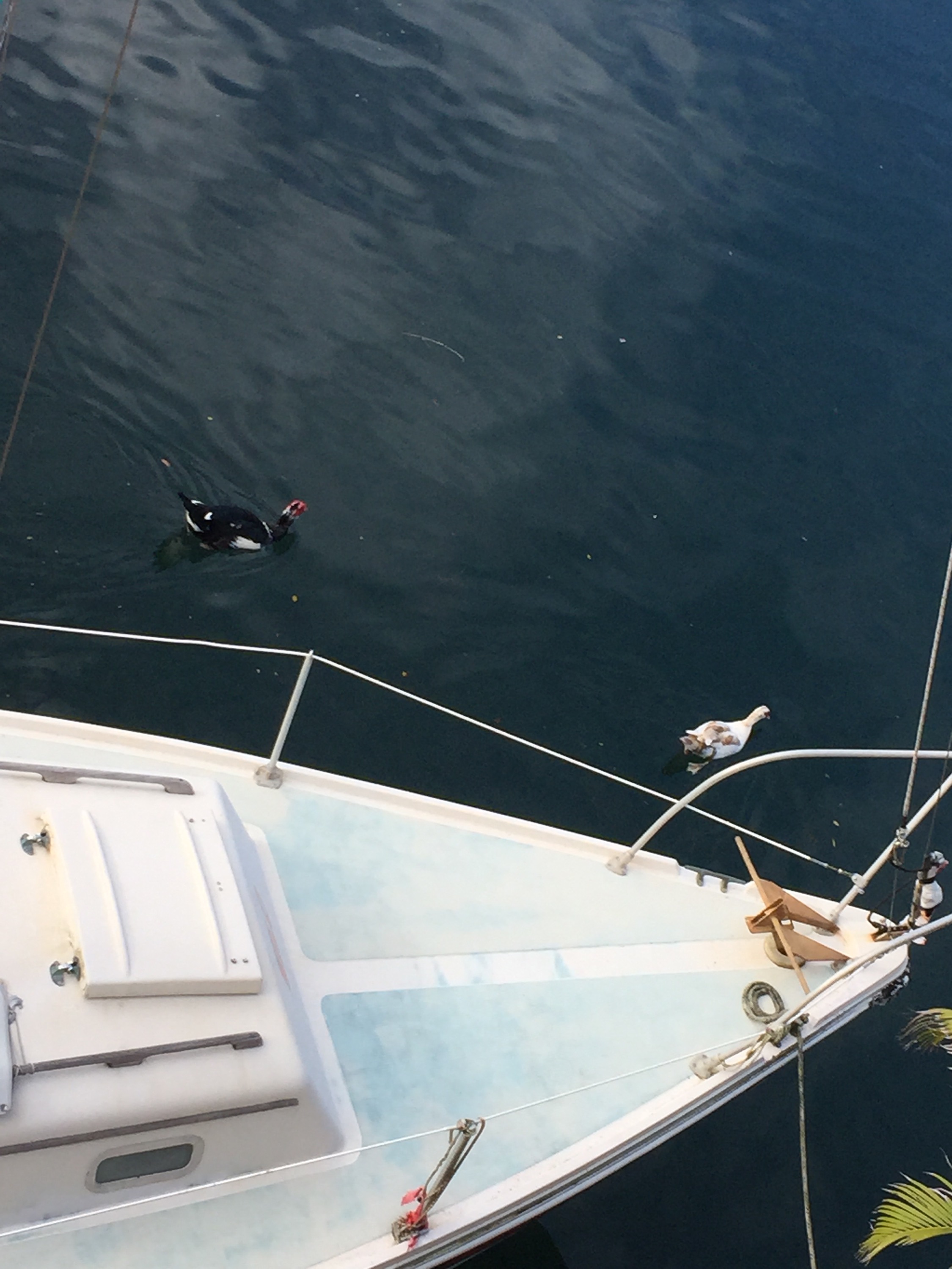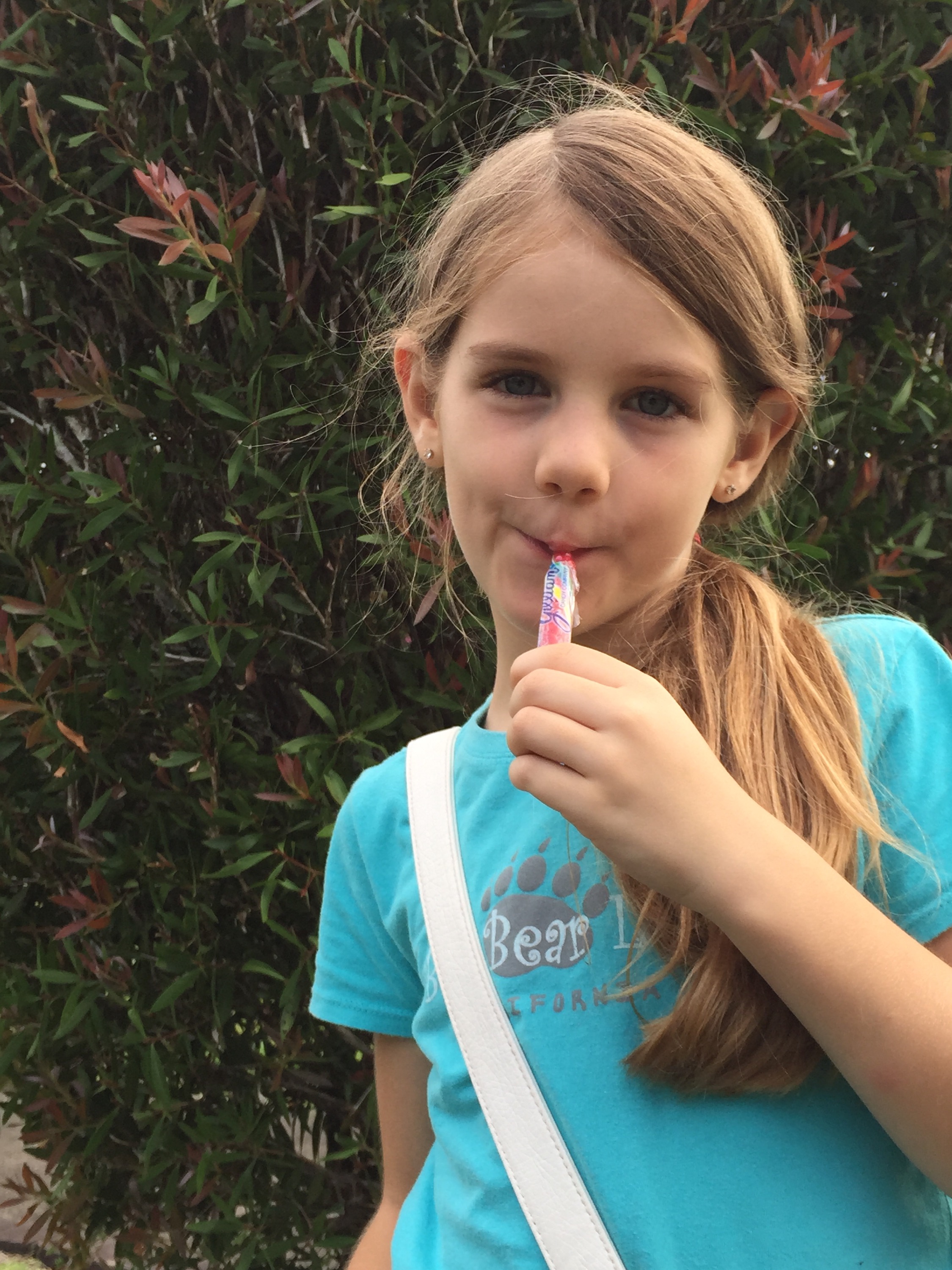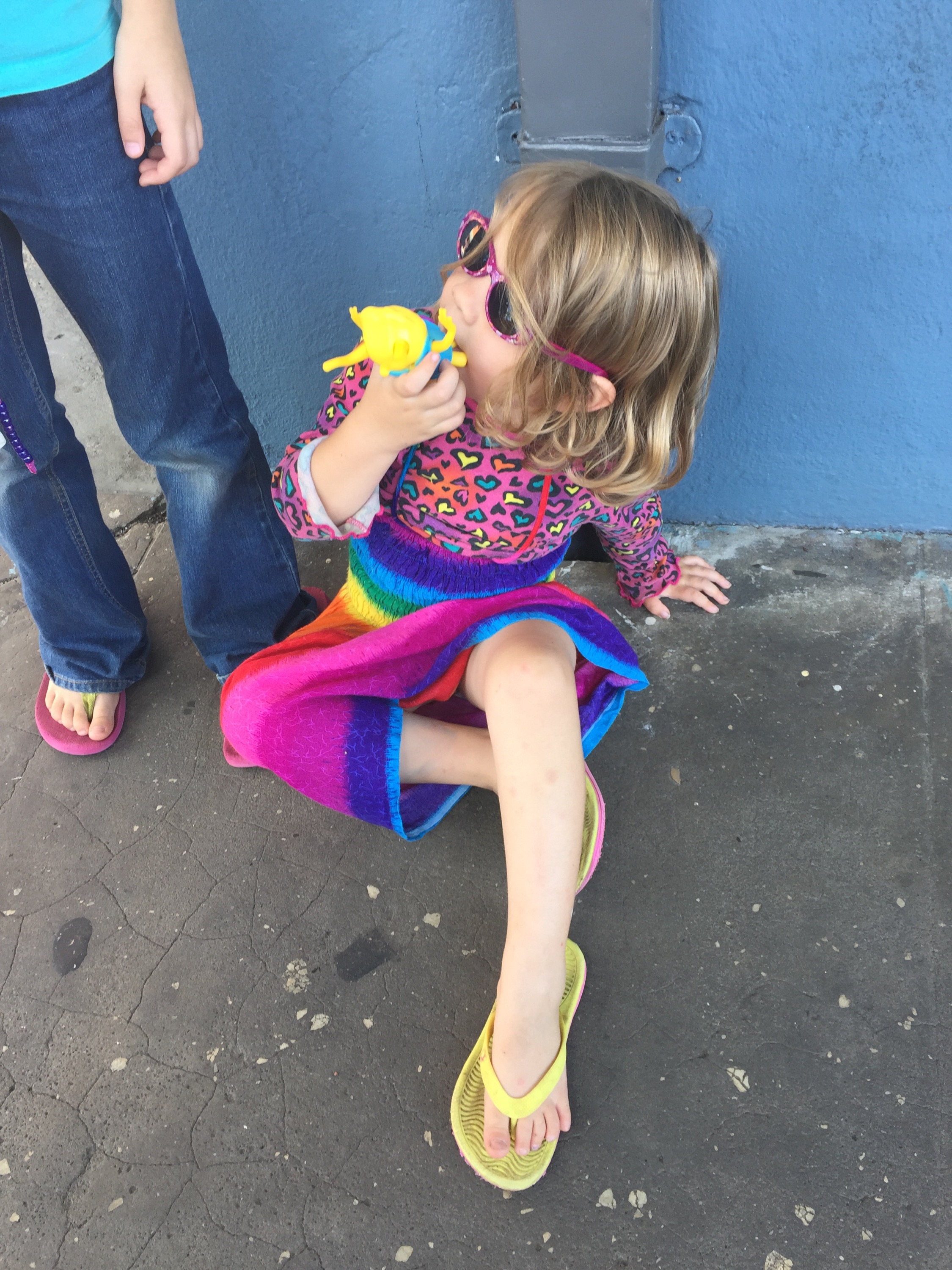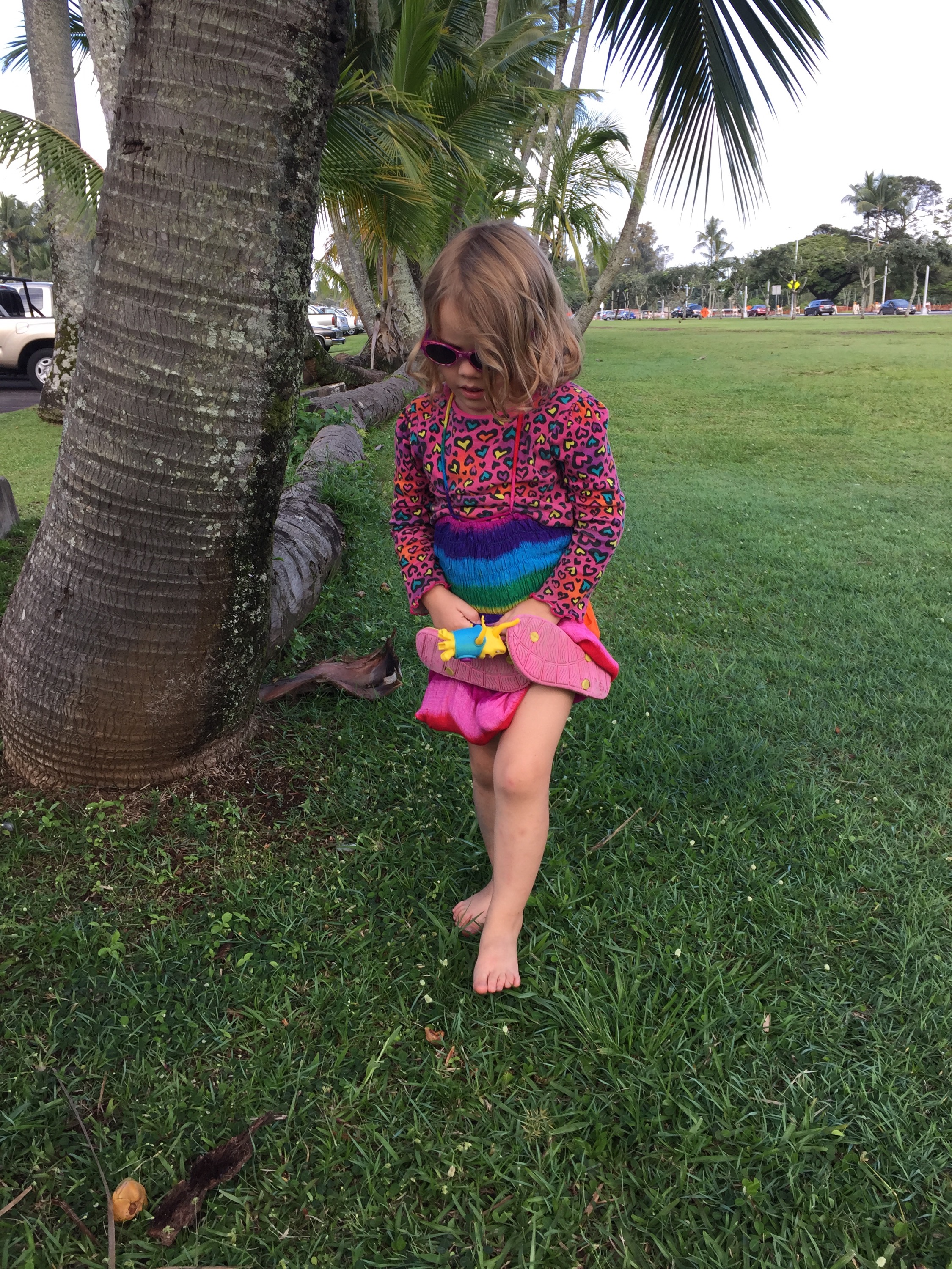Eve with her skirt filled with baby coconuts she found in the grass.