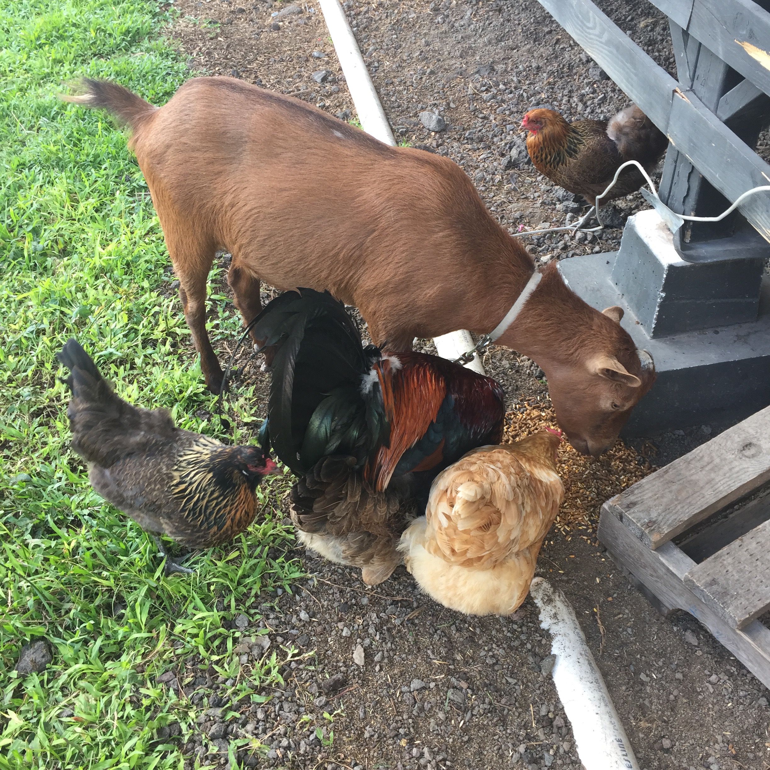 The chickens preffering the goats food, the poor goat was eating as fast as he could.