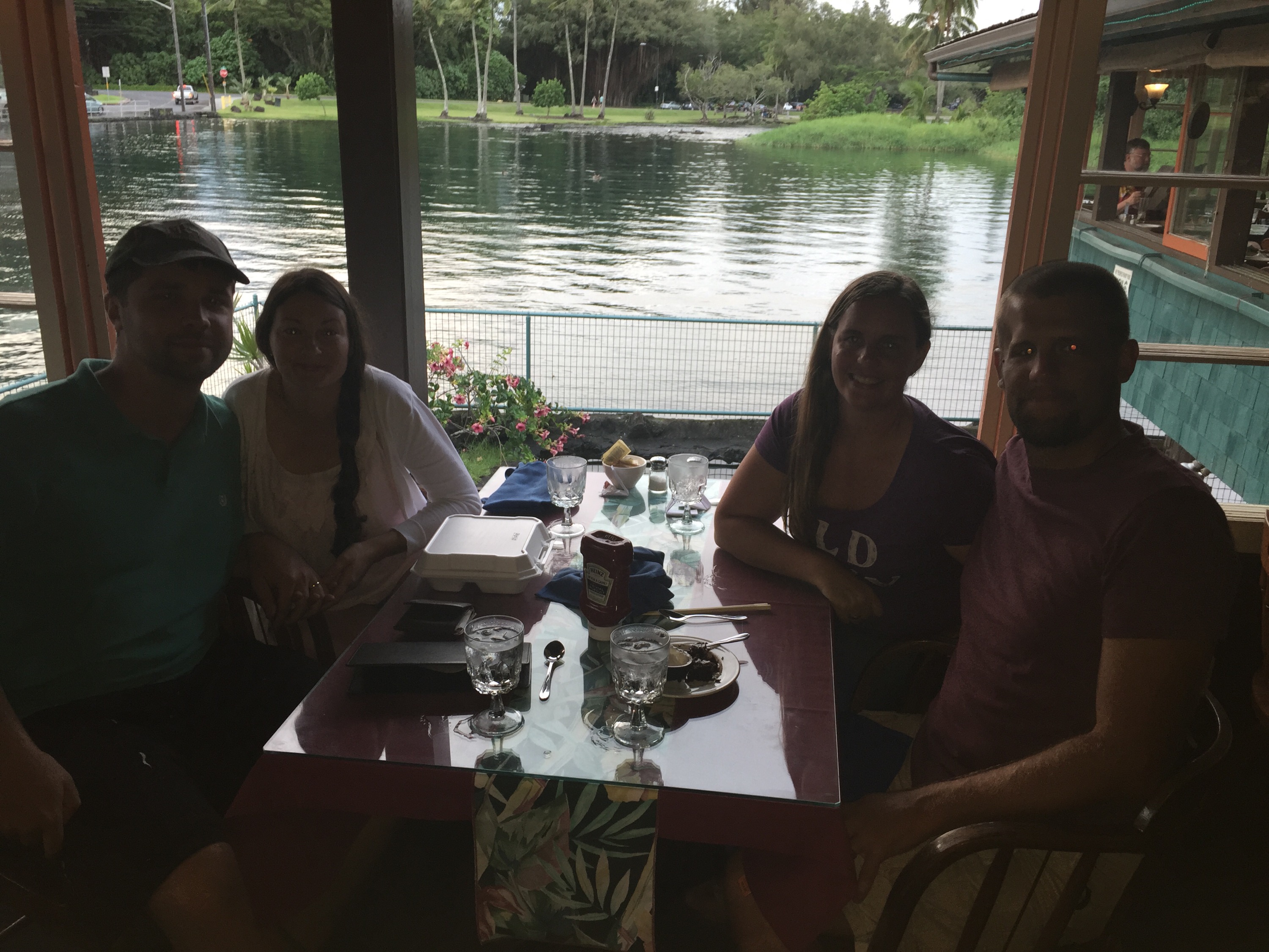 I have been thinking about how we can make this last day off in Hilo what ever it needed to be to say goodbye to our friends and this beautiful place! With a one on one off one on one off three on schedule of day shifts that have been very busy do we rest and just enjoy the moment or try to fit in one more our our “list” items (the things on there are whole day excursions.). As bad as we wanted to do one more of our list items, the kids have been fussy and tired, and I knew we needed to save a little energy for this last kick to the finish line, so we decided to rest and just be together. Mom and I headed to the warm pools in the morning, getting some one on one time. Hannah must be coming down with the cold Eve had last week. She slept most of the morning away. Caleb cleaned the car out for us, and Chad and I headed out for a much needed date time. We had talked about a double date with Jesse and Isabel. Isabel was working on making leis for the Father’s Day service tomorrow so I helped her with that. We talked a bit, but mostly enjoyed watching our husbands being boys. In the first hour we were there they started a fire (to burn up a brush pile), examined Jesse’s knife collection, and set up targets and took turns practicing their aim with the shot gun. I think they were enjoying each other’s company. We finished the leis and made plans for dinner as a late celebration of Chad’s birthday. Yes we were a week late, but I worked the whole weekend and it hasn’t slowed down since. Ponds was recommended and reservations were made.