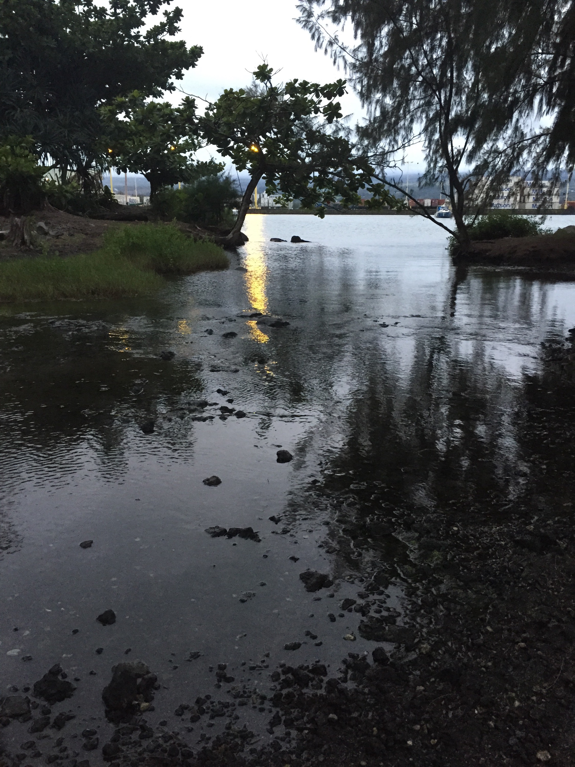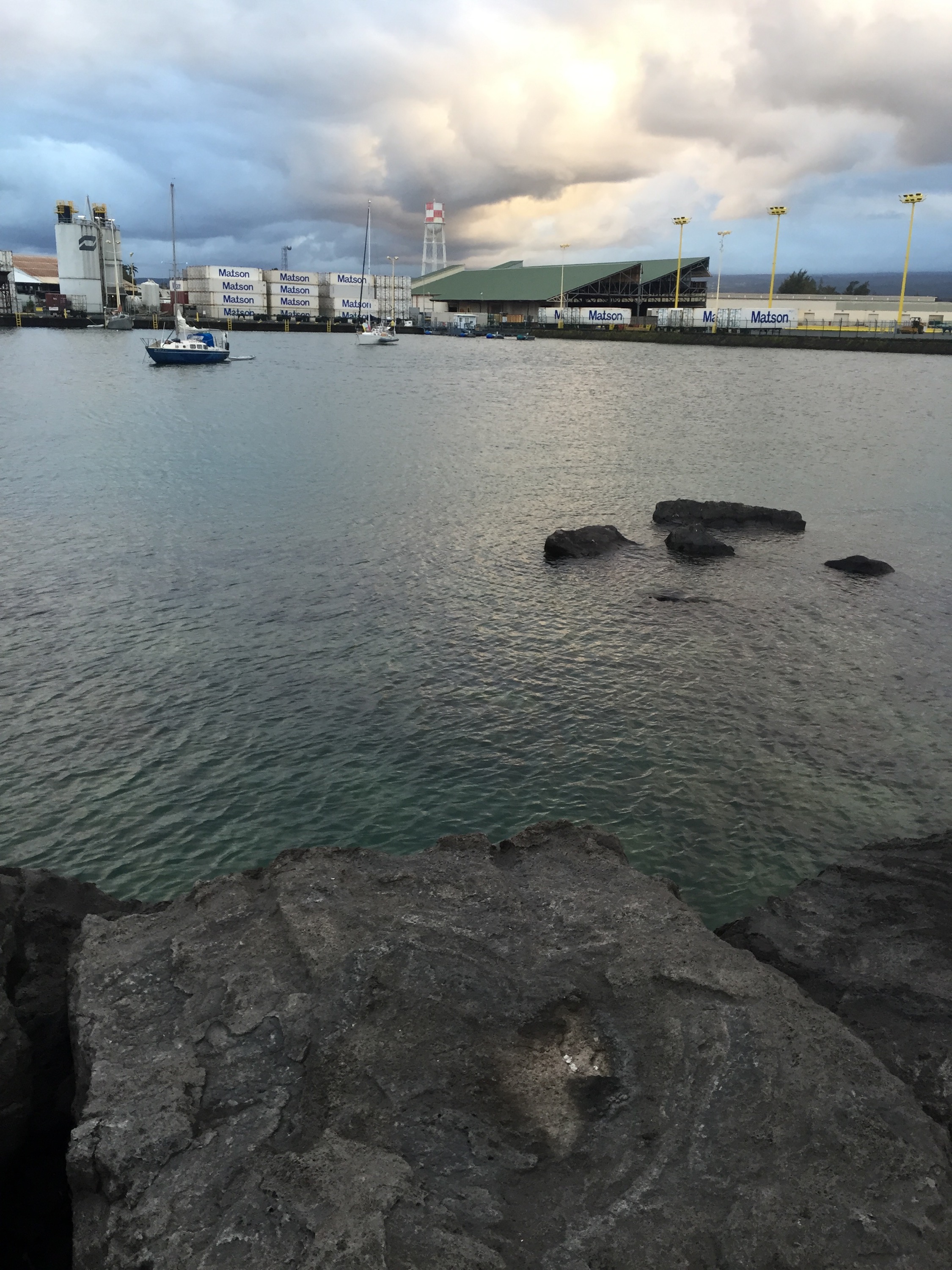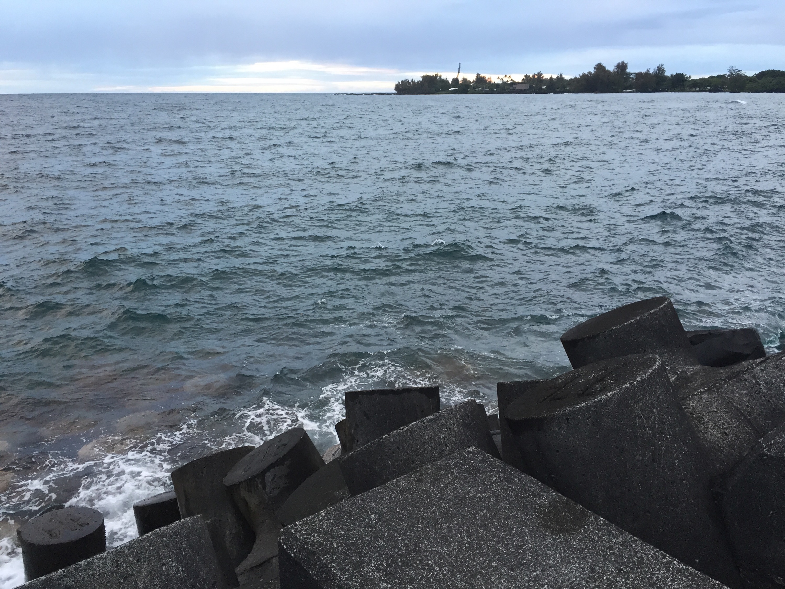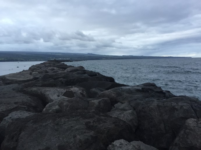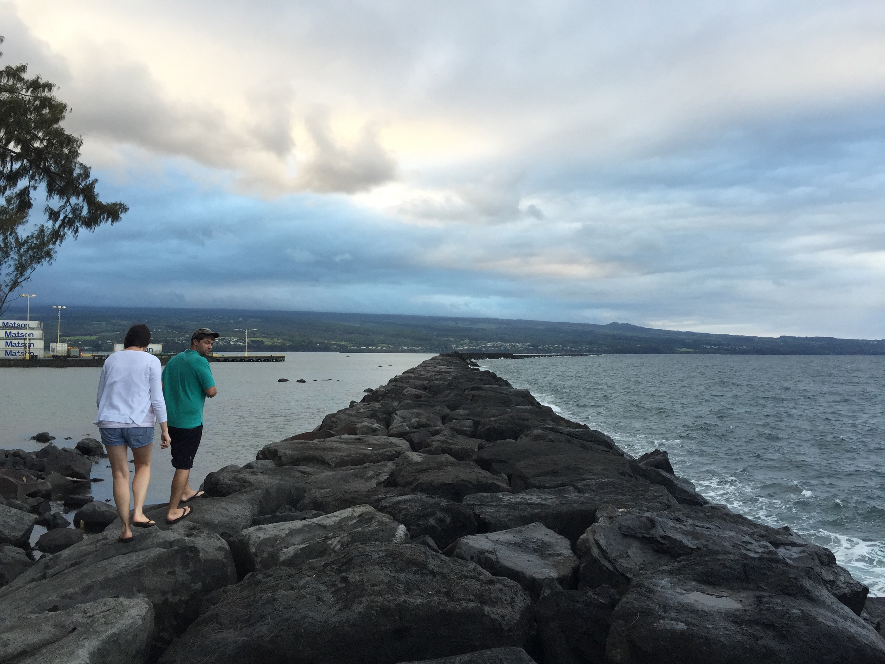 We loved watching the huge koi fish below and the red eared slider turtles who were dwarfs in comparison. After dinner we drove to where you can walk out on the wave break wall that protects the bay front of down town Hilo. So fun!!! I would have loved to walk to the end, but I don’t know that slippers (flip flops) are the best foot wear for that kind of venture.