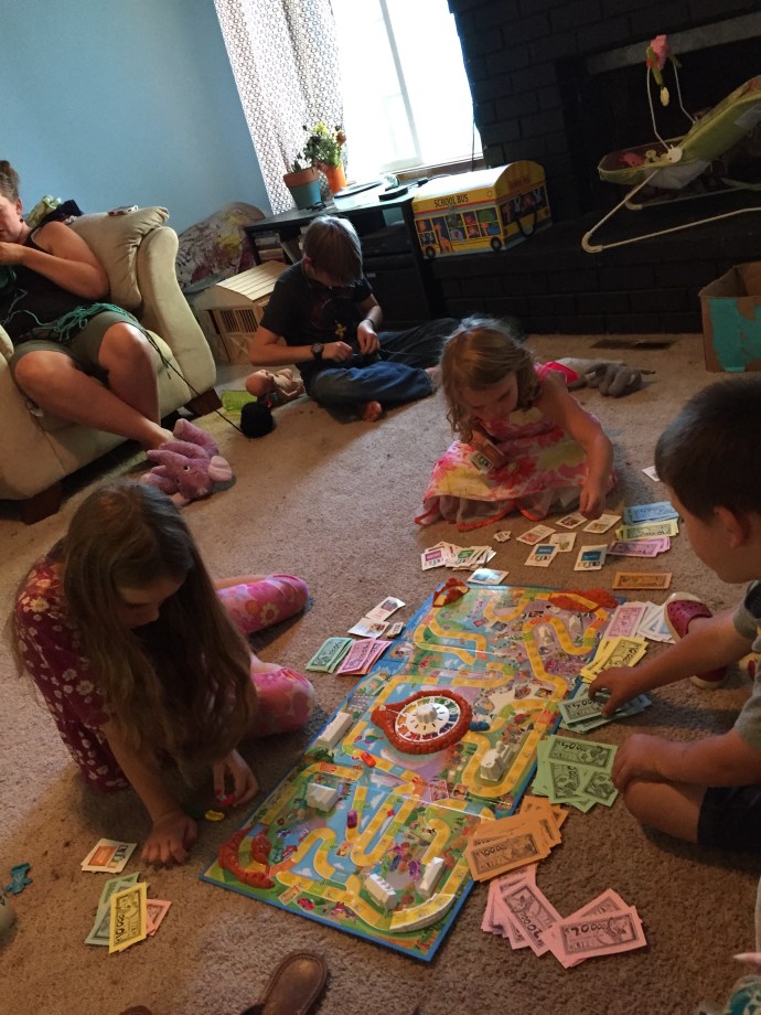 I can almost not believe it myself, but yesterday, Thursday, I did not do anything except some paperwork that was mailed out early and then sit on the couch and crochet all day. Well until 5:00pm at least. Those of you who have known me for very long know that my well earned nick name in college was “Grandma Sarah” due to my love of crocheting and the fact that I took it everywhere with me which I suppose is atypical of most 17-20 year olds. I have missed my hook and yarn therapy. The kids had fun just playing together too. We had a blanket fort early in the day then the game of life and even a visit from the mounted police.