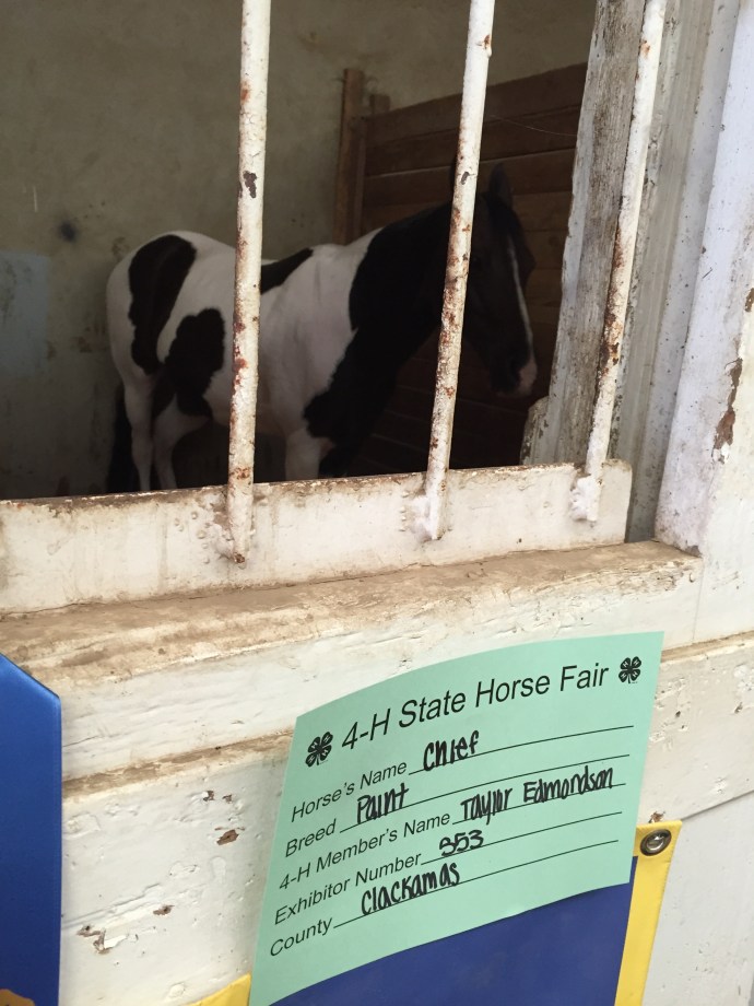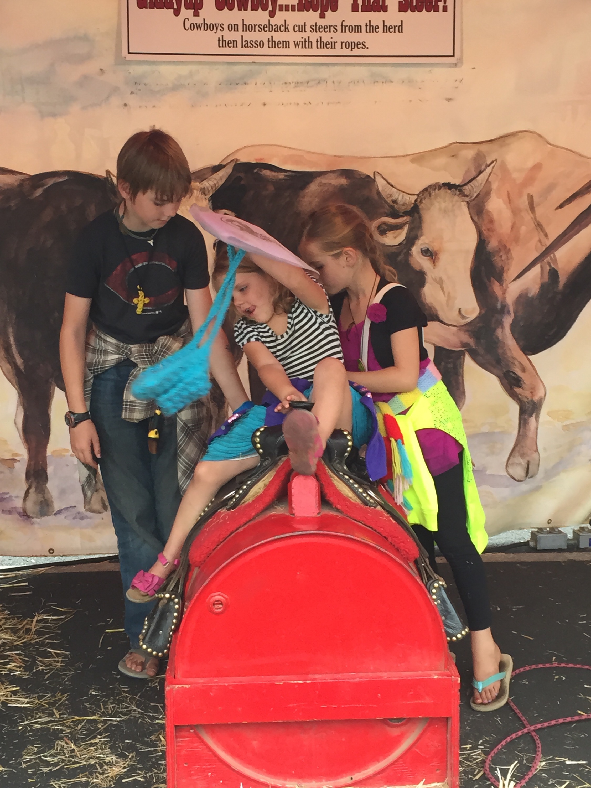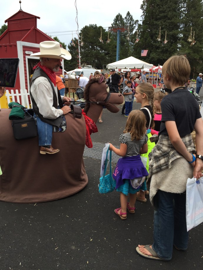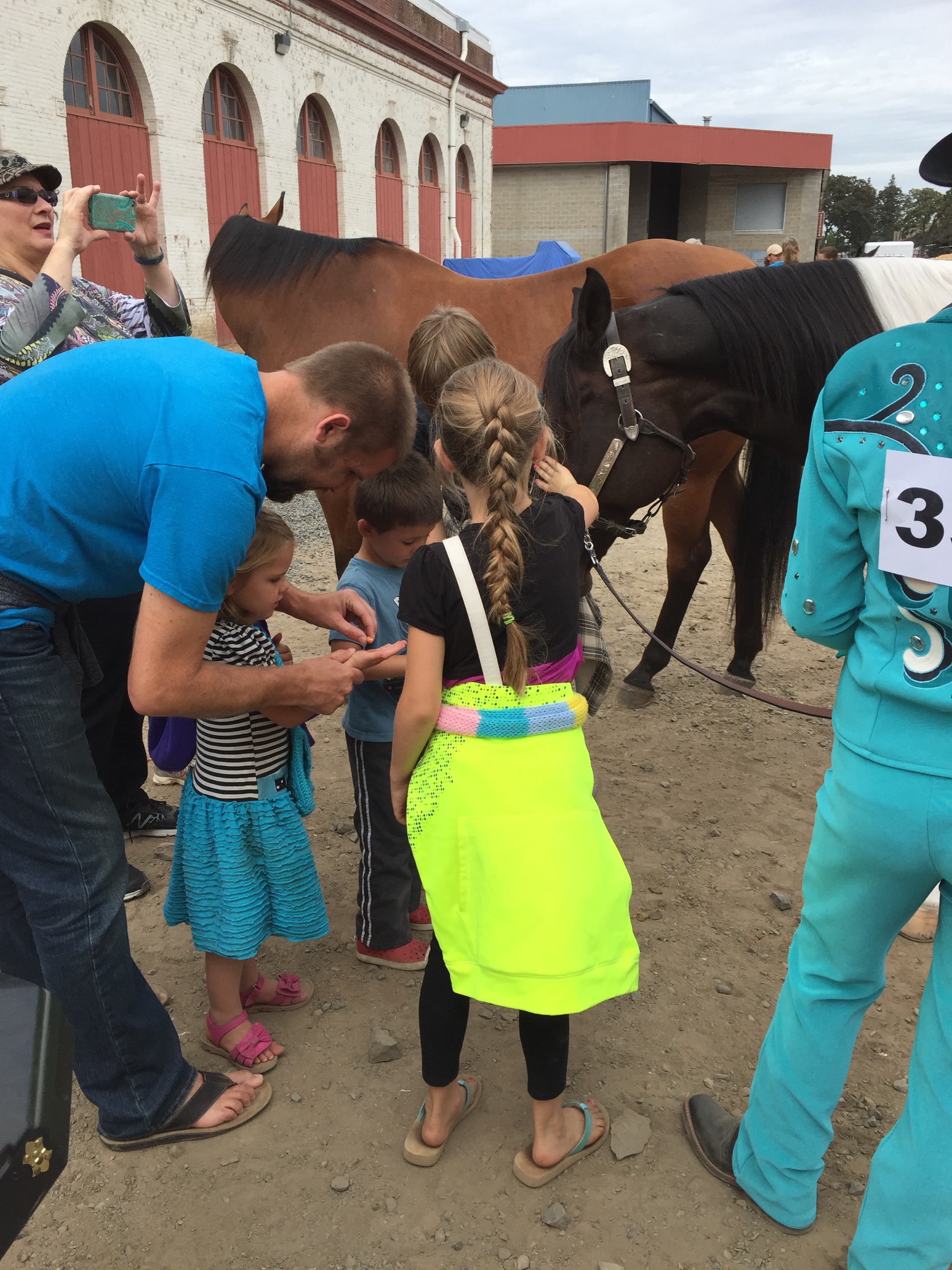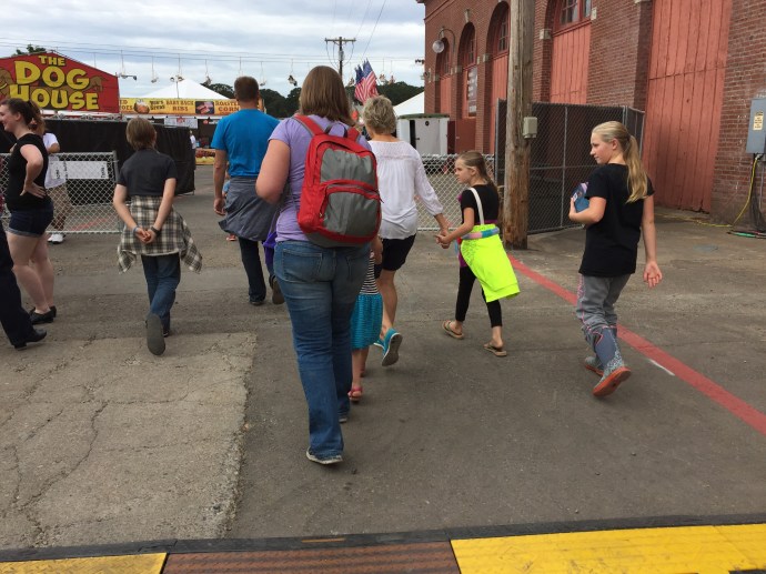$1.50 day today was in honer of it being the 150th year of the Oregon State Fair. At that rate we could save the tickets the kids earned at the summer reading program for another day and make this a two fair day year which we have never done before. The lines were shorter than we anticipated at the entrance and really over all less crowded. I wasn’t quite sure if the whole city of Salem would turn out because of the sweet deal. On our way past the horse pavilion Aunt Stephanie who had beat us to the fair waved us down and told us that she had run into Aunt Bonnie and Tate and that Taylor would be showing her horse in the arena sometime soon. Well perfect we wouldn’t want to miss that. We headed into the pavilion and found seats up a bleacher or two from the rest of the crowd so our restless kids wouldn’t disturb anyone’s peace. We enjoyed watching the two or three groups of kids/horses before Taylor, but it was especially fun watching someone we knew. Maybe more so because we got to enjoy the company of Aunt Bonnie, Tate and Tiffany while we did it.