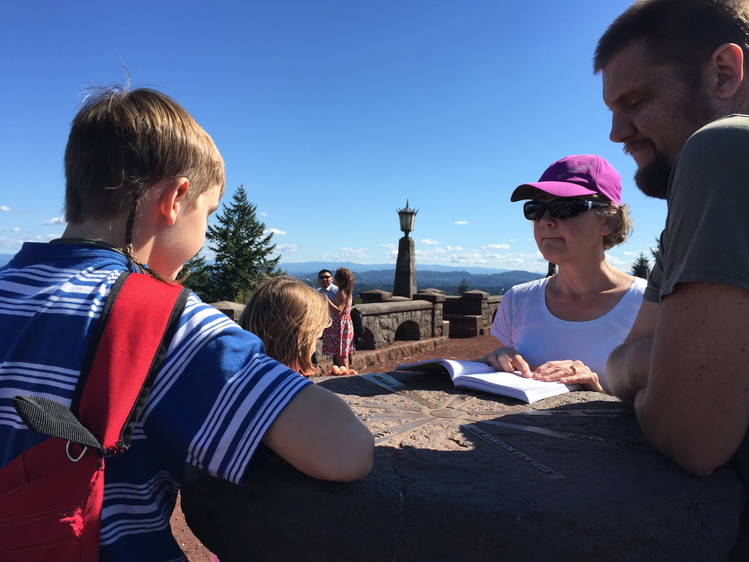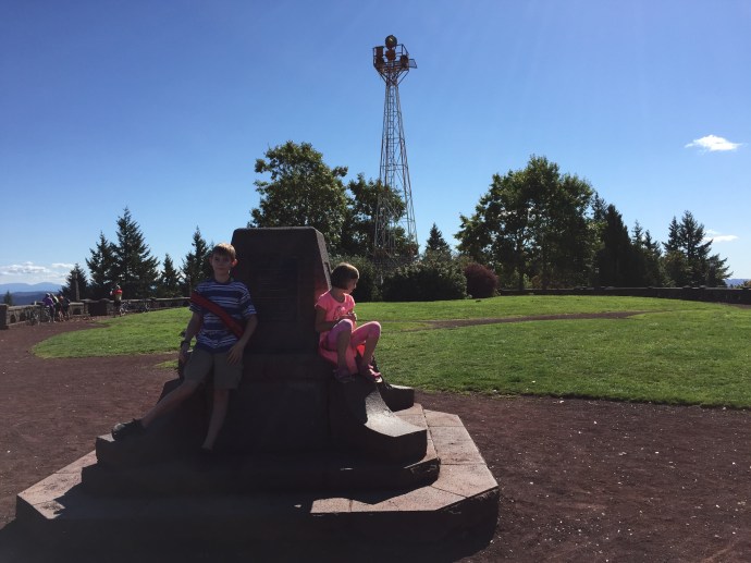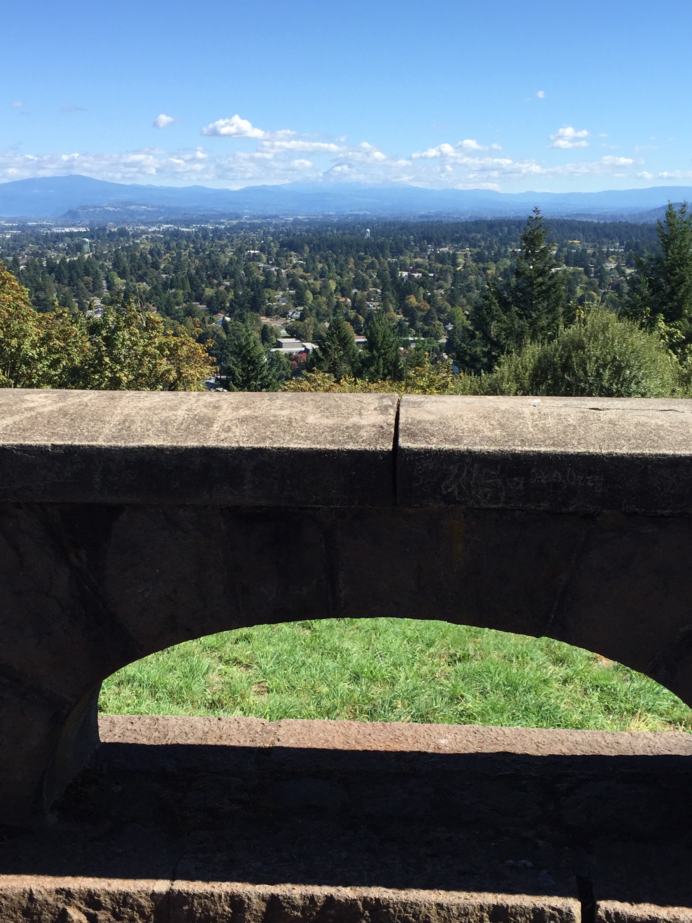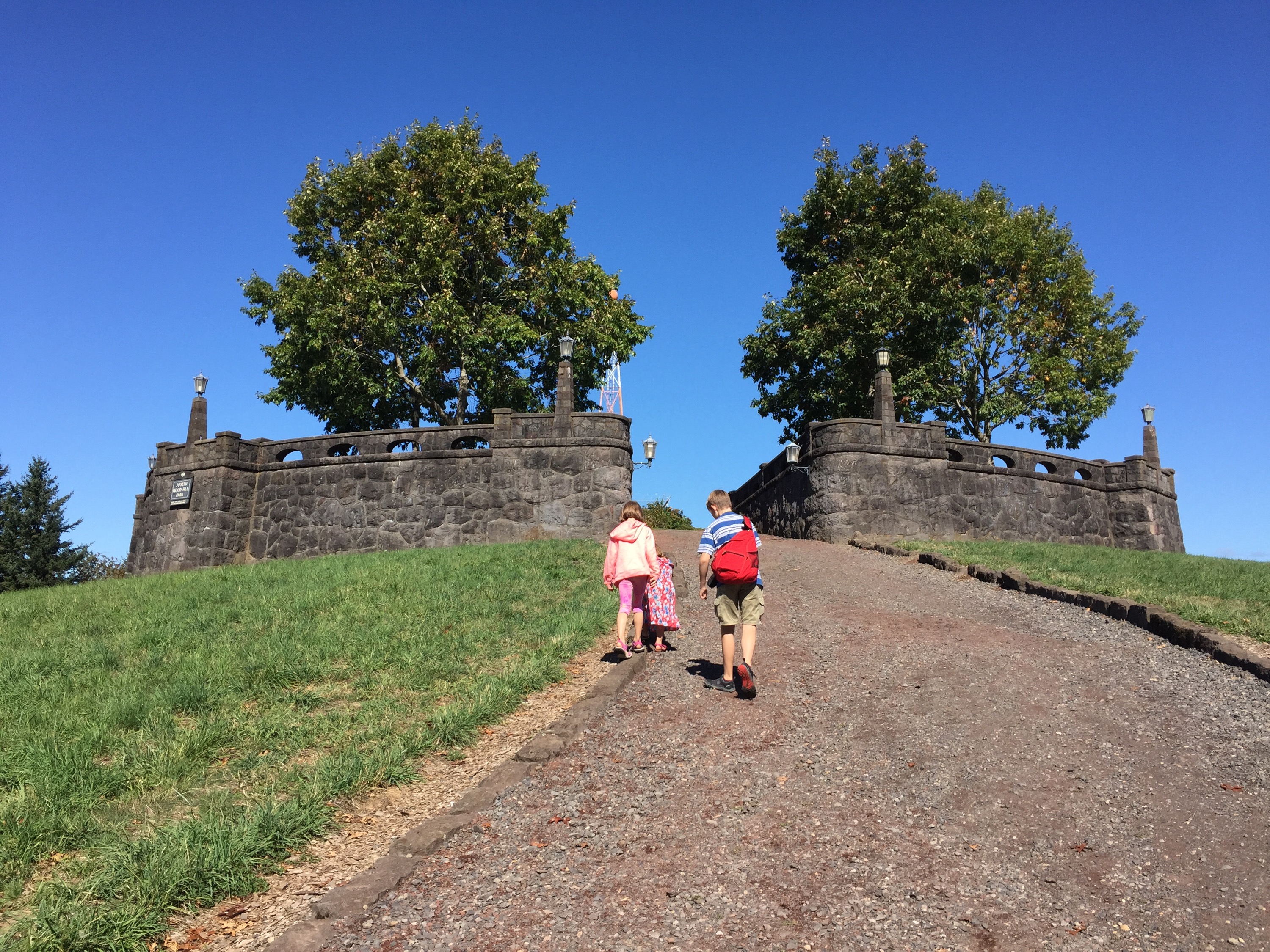 On Saturday we had planned a Portland hiking day with Grandma and Grandpa Owens. Grandpa had one job and would get off around noon or one so Chad started a hammock sewing project and I rotated laundry and checked email while the kids played outside with their friends. Grandpa’s job ended up adding some extr square feet and a bunch of furniture so the decision was made to head out to Rocky Butte with Grandma and Grandpa would meet us at Pieology for dinner. We didn’t end up finding the trail head instead we found ourselves on the top of the very scenic butte. We checked it out while we waited for Grandma. It may have been poor planning on my part, but I didn’t realize there would be no bathroom facilities there when I chugged the liter of water on the way to Portland. So quickly the plan of hiking backwards down the trail then back up turned into a let’s check out the park again then head down and check out the Grotto just below. The view of the whole valley was AMAZING!
