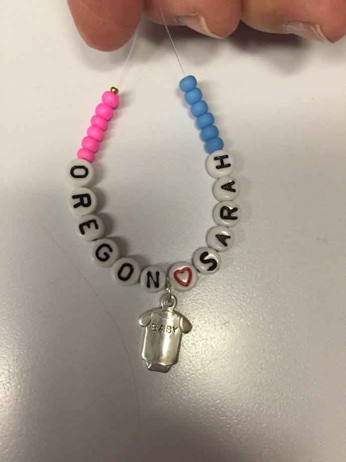 I have been avoiding any kind of countdown as of yet because I will be very sad to leave Samaritan Pacific Communities Hospital at the end of the month. But alas it is going to be so abrupt I should at least give a shout out on up coming events as this speeding engine seems to have no brakes! I have two extra shifts four hours each (I thought they were 12 hours when I signed up for them and will most likely be on call) and then my three twelves for next week… that…is….it… š³ We have started our goodbyes. We have one more Sunday at church, a family holiday party, and a few other things planned that make the next 10 days look like a whirlwind. I recieved this sweet gift from a coworker last night a baby sized beaded bracelet. She said, “Oregon babies love Sarah because she takes such good care of them.” Such a beautiful gift that will put in my curio at home and cherish forever. Thank you Liz!