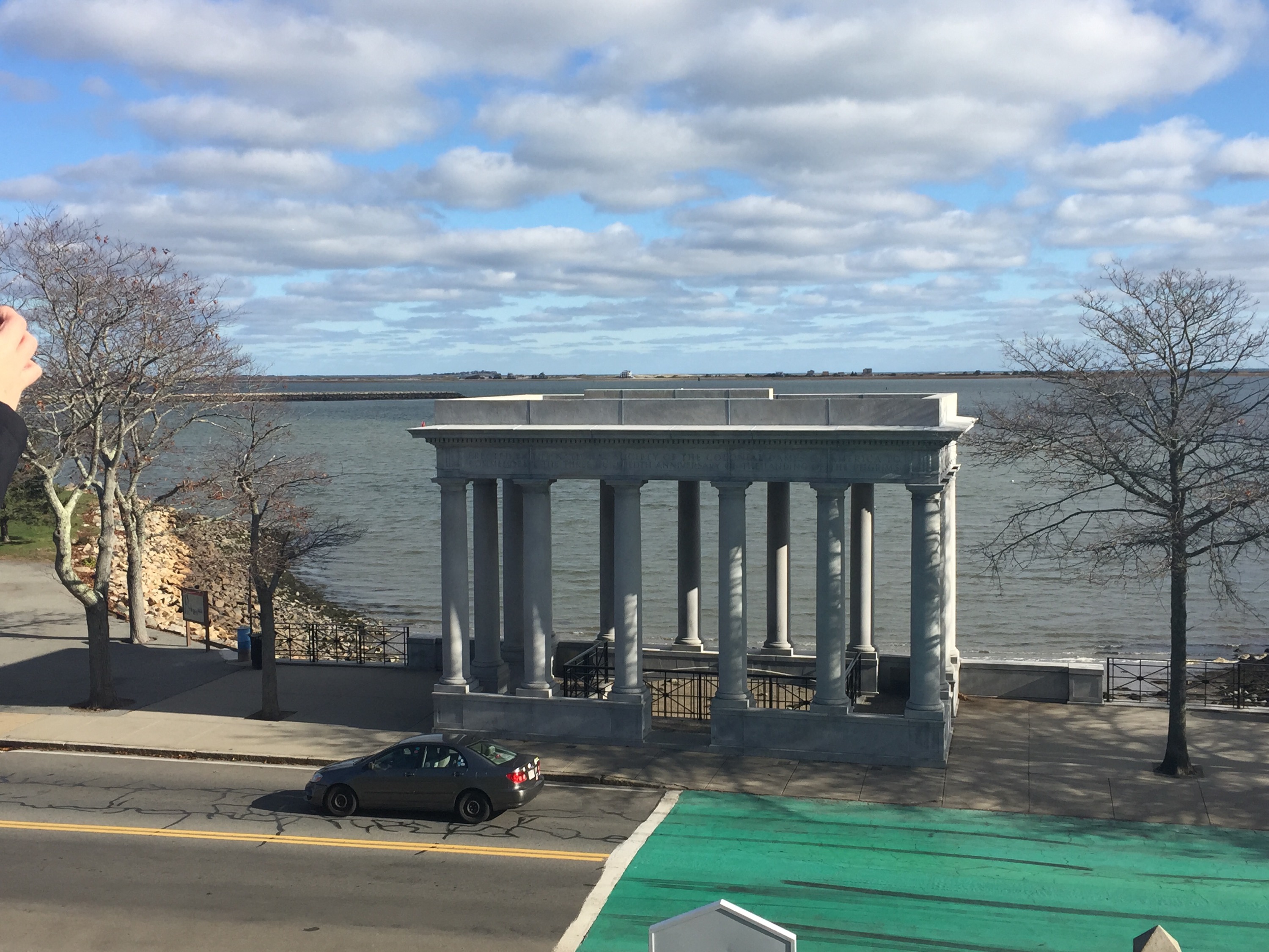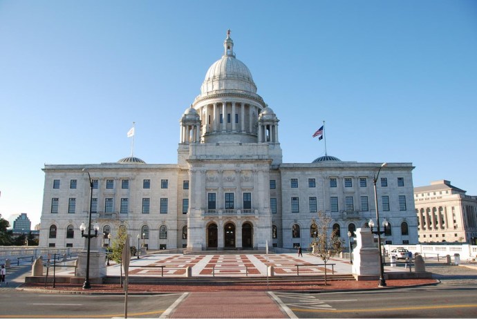 I have, for some reason, always wanted to go to Rhode Island. It looks so small on the map. How small would it feel in person? We drove 30ish miles of it in the dark last night so I was busy typing up our blog, looking around periodically when Chad announced that we were entering Massachusetts. Wait! What?!? That can’t be. I missed the sign for one and I didn’t take a single picture of Rhode Island. Chad took the first exit just for me circled back and let me take a few pictures before we headed back into Massachusetts. When we were passing through Providence we saw the dome of the Capitol down to the flags and wondered what it looked like so we looked it up on line finding the below picture on Wikipedia.