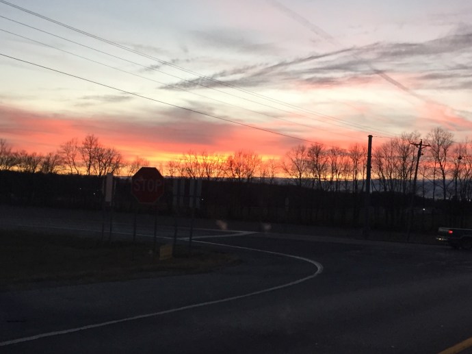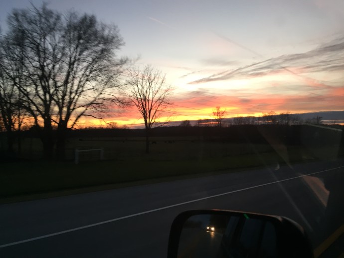I took a few naps, it just isn’t as restful sleeping in the car. Also Caleb is getting so big I hate to cramp his style too much by reclining my chair to what would be the most comfortable for me. The kids were listening to an audio book that we have been working on for quite some time now and actually finished it. We switched it over to “Pilgrims Progress” which is one of my favorites. I did however fall asleep after a few hours and woke up to Christmas music. It was the CD the church had given the kids to practice the songs they will be singing for the Christmas program this year. They have been in several programs as we travel. They were in the Christmas program last year in Victorville and then jumped right in to the Easter program in Curtistown. It seems we came to Charlottesville at just the right time for them to participate in the Christmas program this year here. The four songs played again and again as we sang to them. We lost interest in that and focused on on the ETA noted on the GPS as the sun started to set. Less than half an hour. We are so close. The sun set was beautiful!