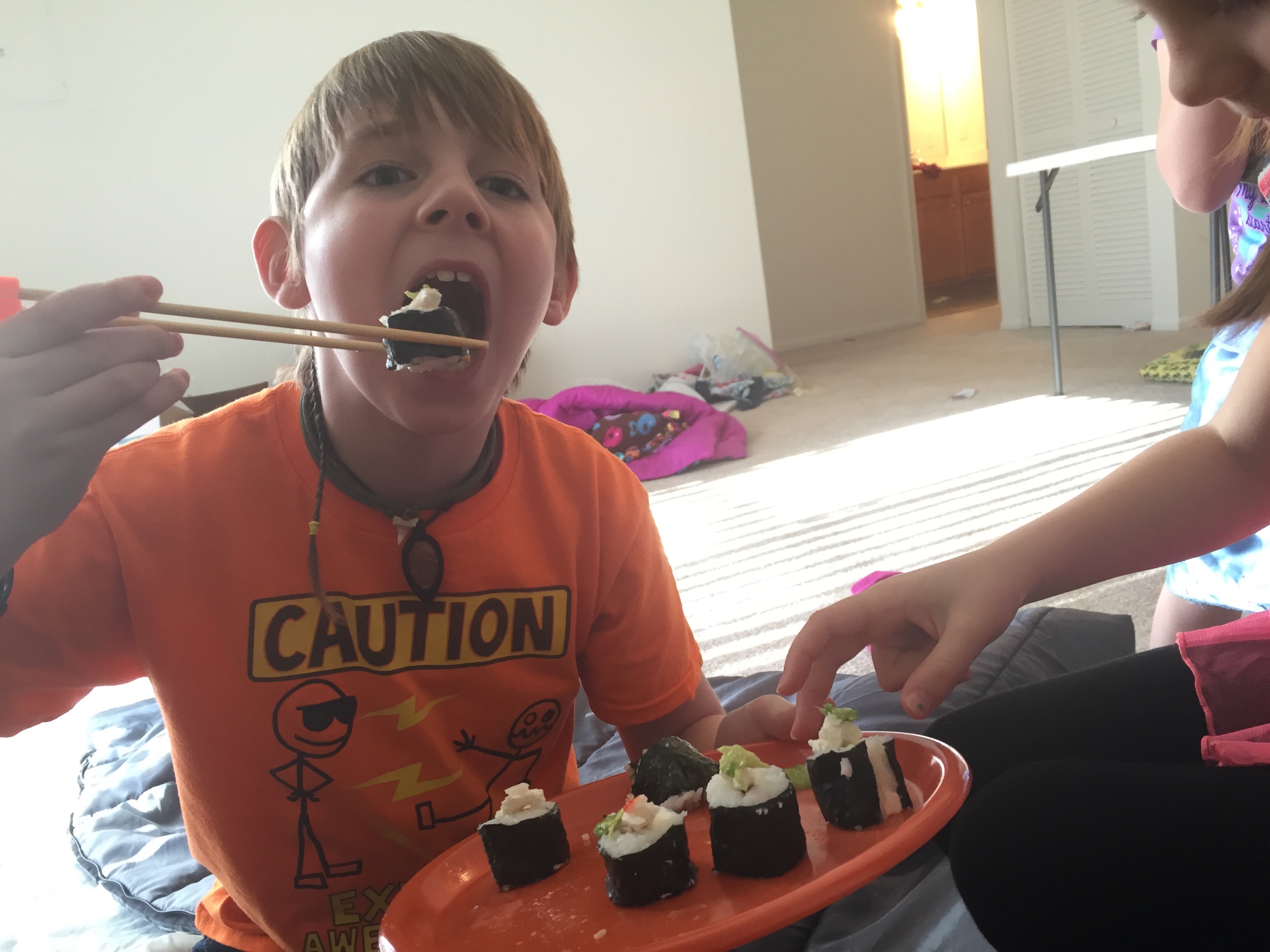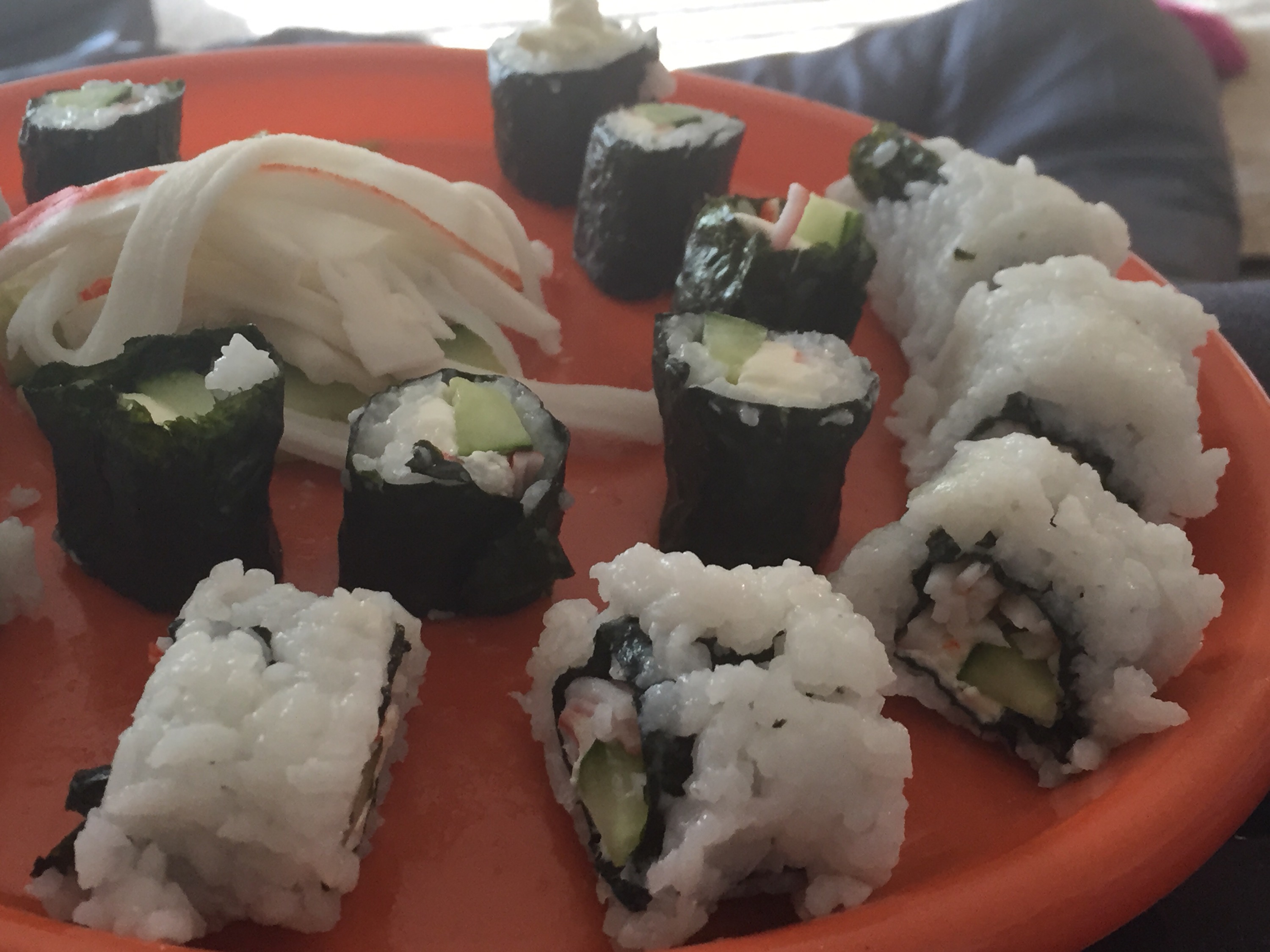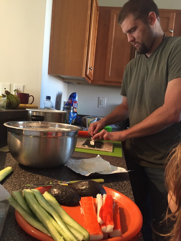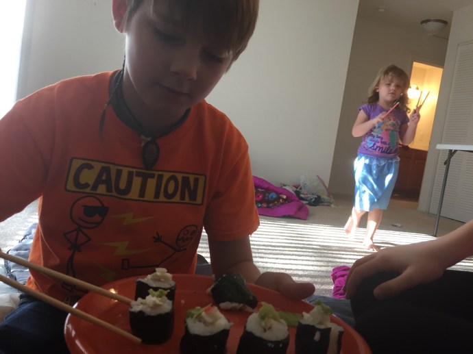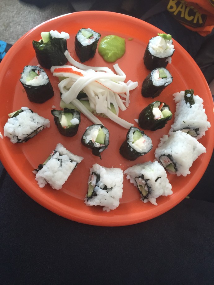 This post is for Aunt Jan. I love you Aunt Jan. We don’t want to go too many days with out posting as we know you and Great Grandma Brown worry about us when there is no news. The last three days have been mostly that of work and sleep. I have one more shift after tonight before we head to DC Tuesday morning for the flight west to San Diego for me to attend my grandmother’s funeral. Chad and the kids have purchased a sushi mat and have been practicing making their own sushi. I told Caleb that if he has that skill mastered by college his room will be the hang out room. I have to lay off the girls like a guy who can cook comments. I can get away with a few, but they totally embarrass him so I can’t over do it. Here is a few of the pictures. I have been happy to taste test them. My favorite ones are the spicy crab rolls.