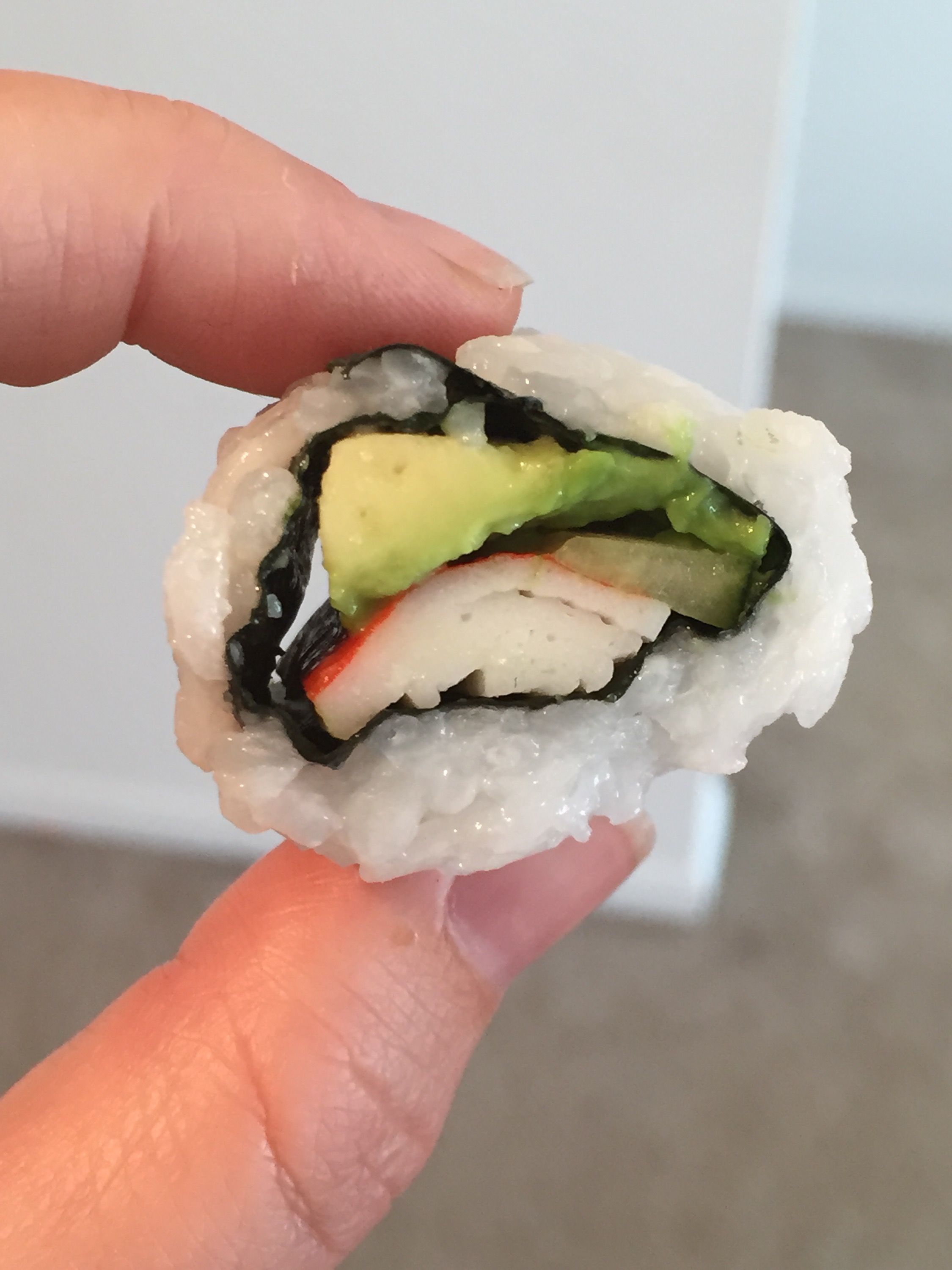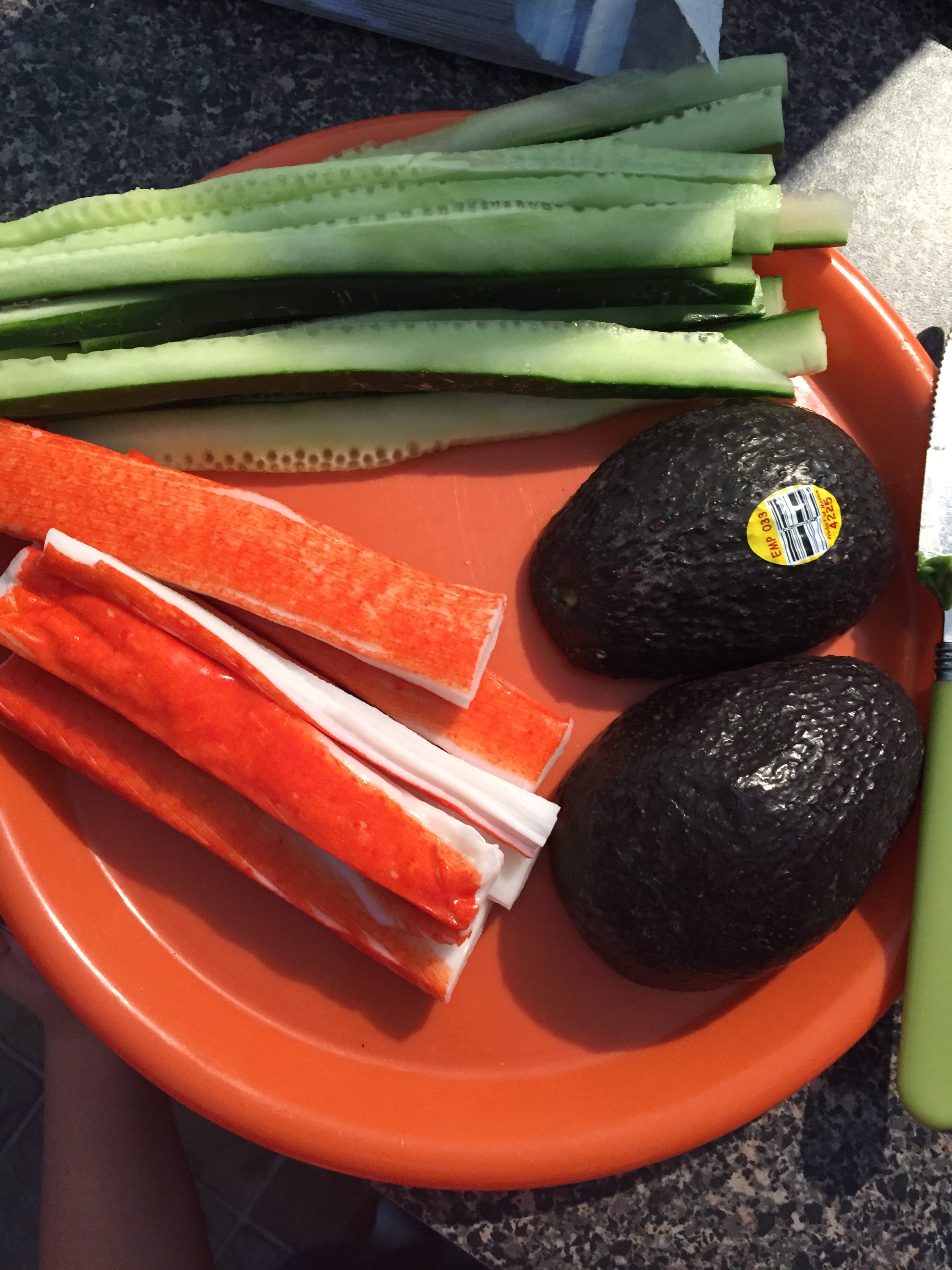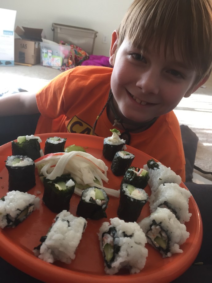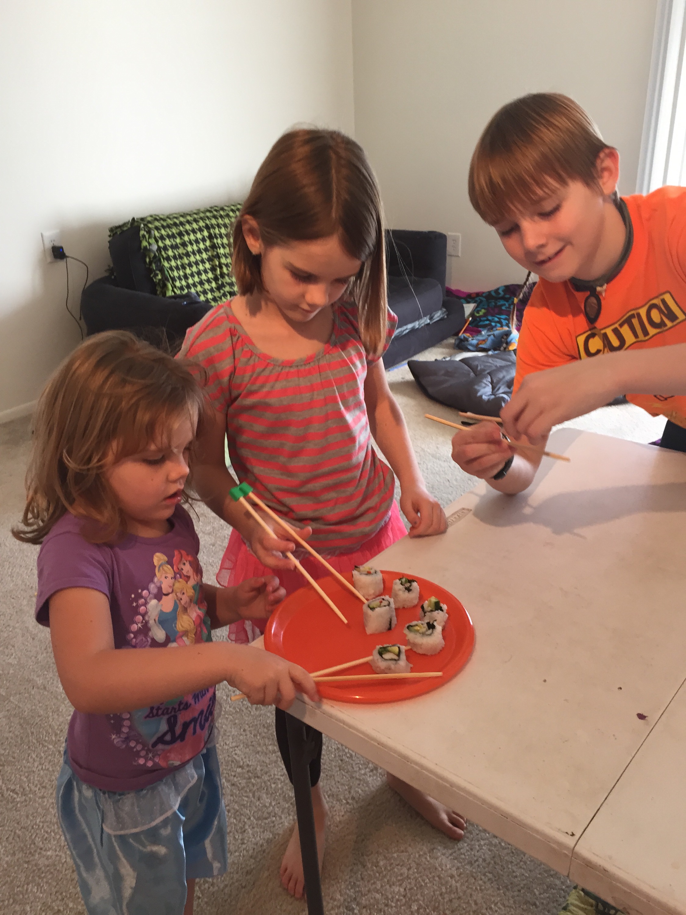 This post is for Aunt Jan. I love you Aunt Jan. We don’t want to go too many days with out posting as we know you and Great Grandma Brown worry about us when there is no news. The last three days have been mostly that of work and sleep. I have one more shift after tonight before we head to DC Tuesday morning for the flight west to San Diego for me to attend my grandmother’s funeral. Chad and the kids have purchased a sushi mat and have been practicing making their own sushi. I told Caleb that if he has that skill mastered by college his room will be the hang out room. I have to lay off the girls like a guy who can cook comments. I can get away with a few, but they totally embarrass him so I can’t over do it. Here is a few of the pictures. I have been happy to taste test them. My favorite ones are the spicy crab rolls.