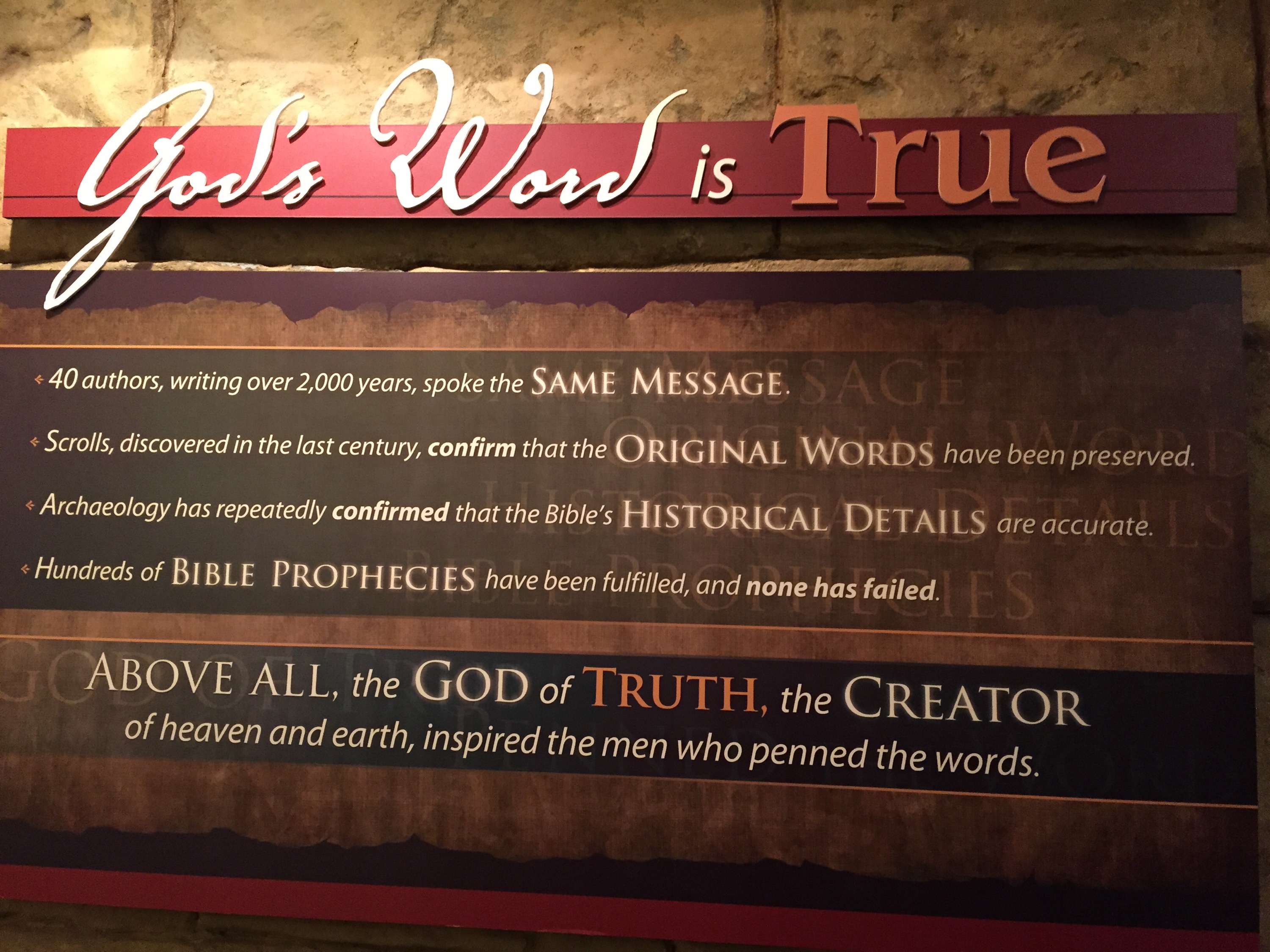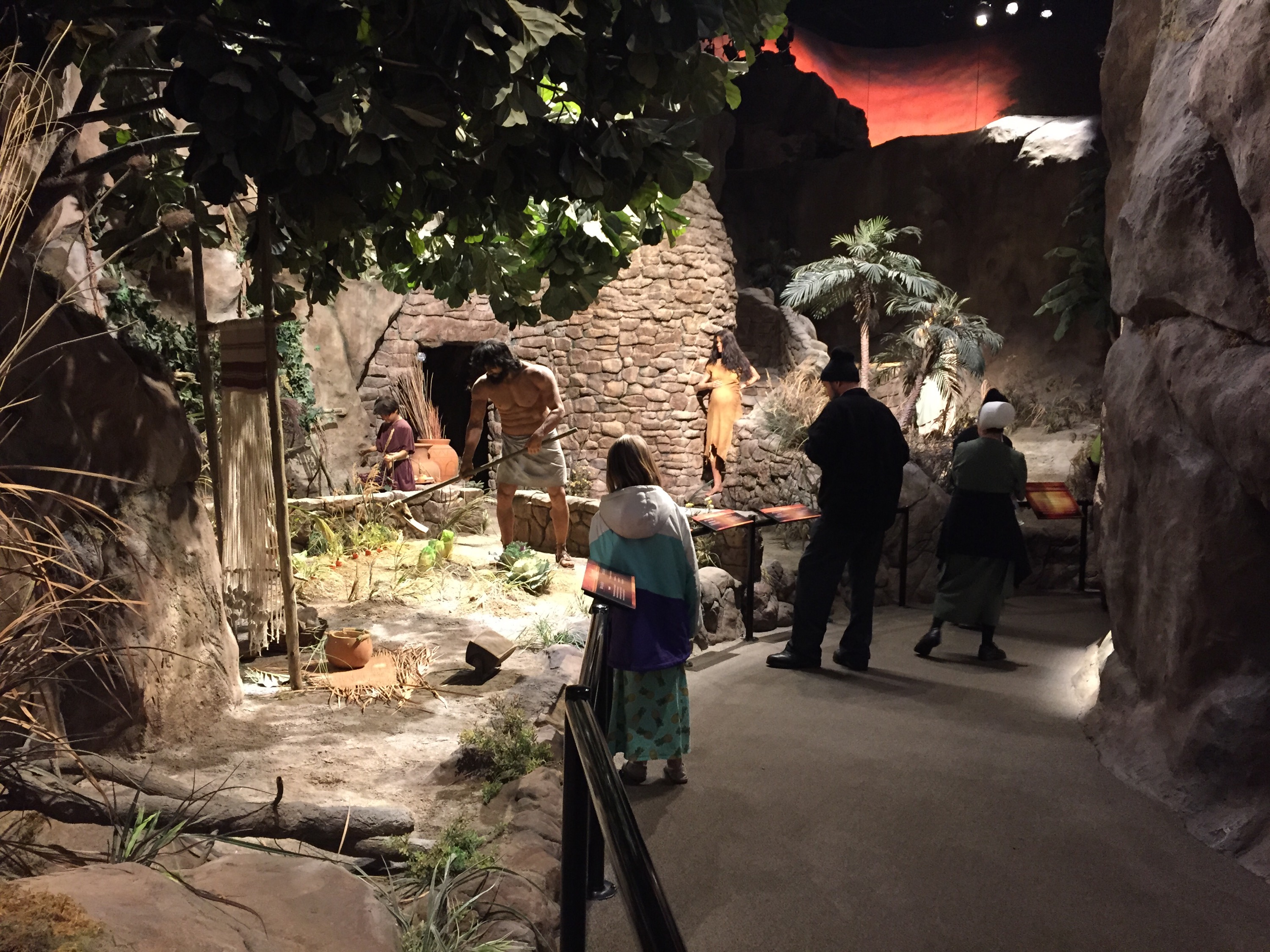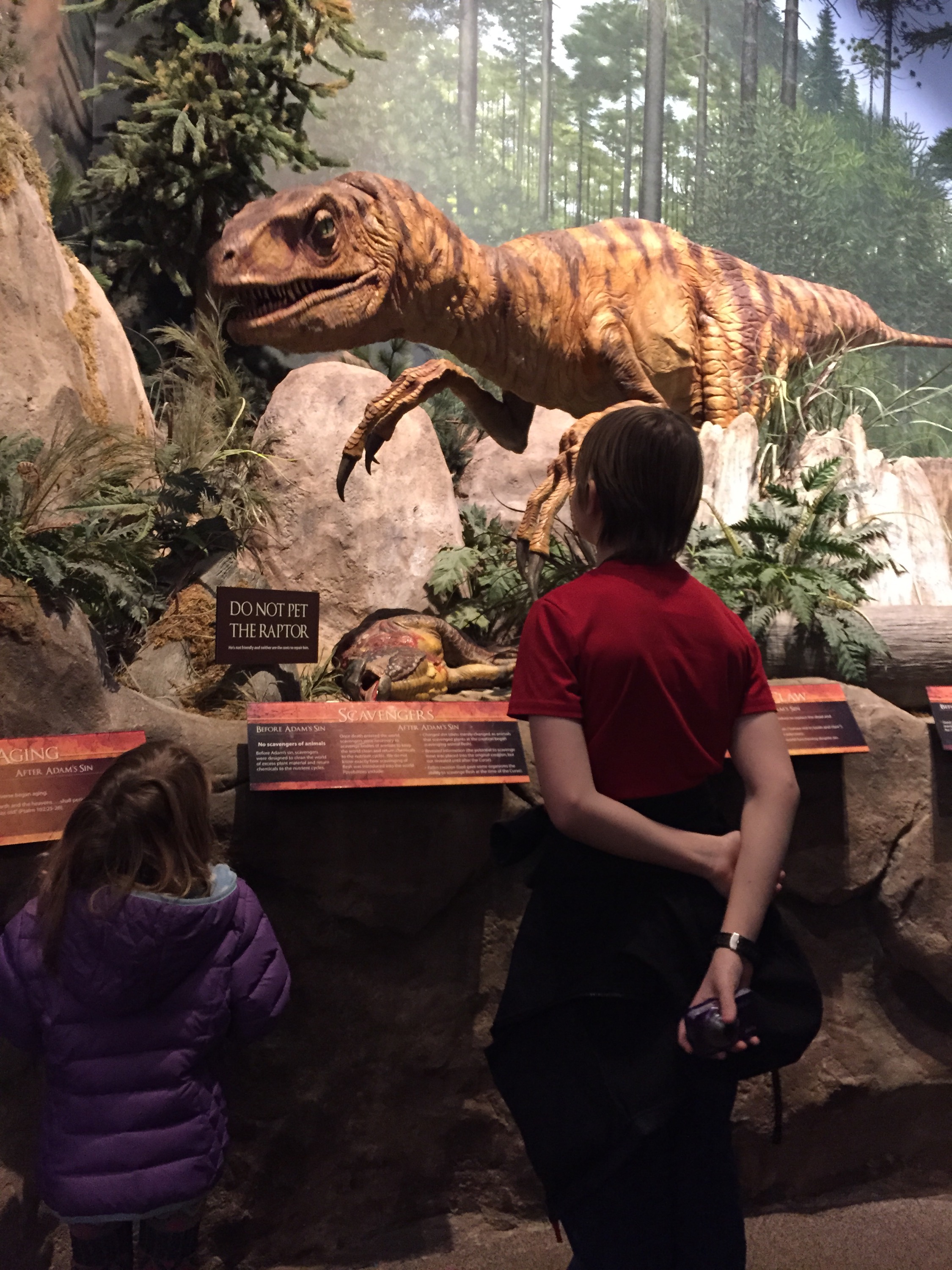 As we drove from our hotel to the museum I couldn’t help but feel like we were nearing the end of a several year pilgrimage. Wanting to visit the creation museum after taking little Caleb and baby Hannah to listen to Ken Ham speak in Beaverton. Man’s attempt to explain the existence of our world and universe with out a divine being had made for some interesting theorys but with creating so many more questions than answers. Just because you can make it sound good doesn’t make it true. Now we have visited a lot of museums and national parks and of course they are all required to take the millions of years theory as their stance. It was refreshing to visit a museum that is consistent with the biblical account of creation. The main two hour exhibit takes about two hours to walk through. It took us longer and we may go back through it today. There is so much reading that I found myself not taking many pictures.