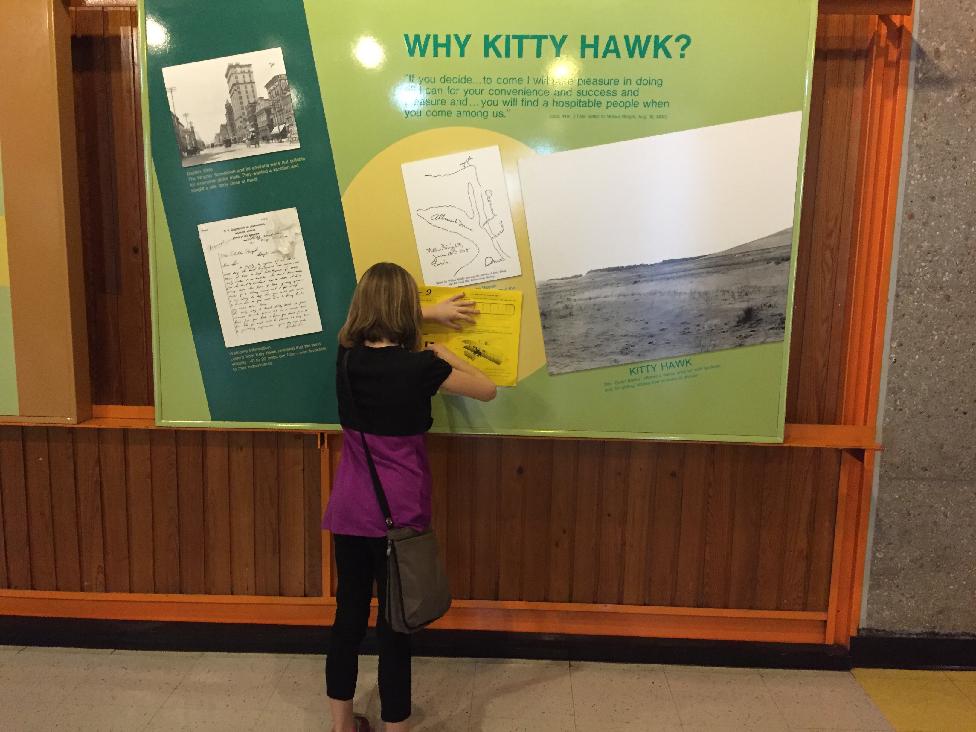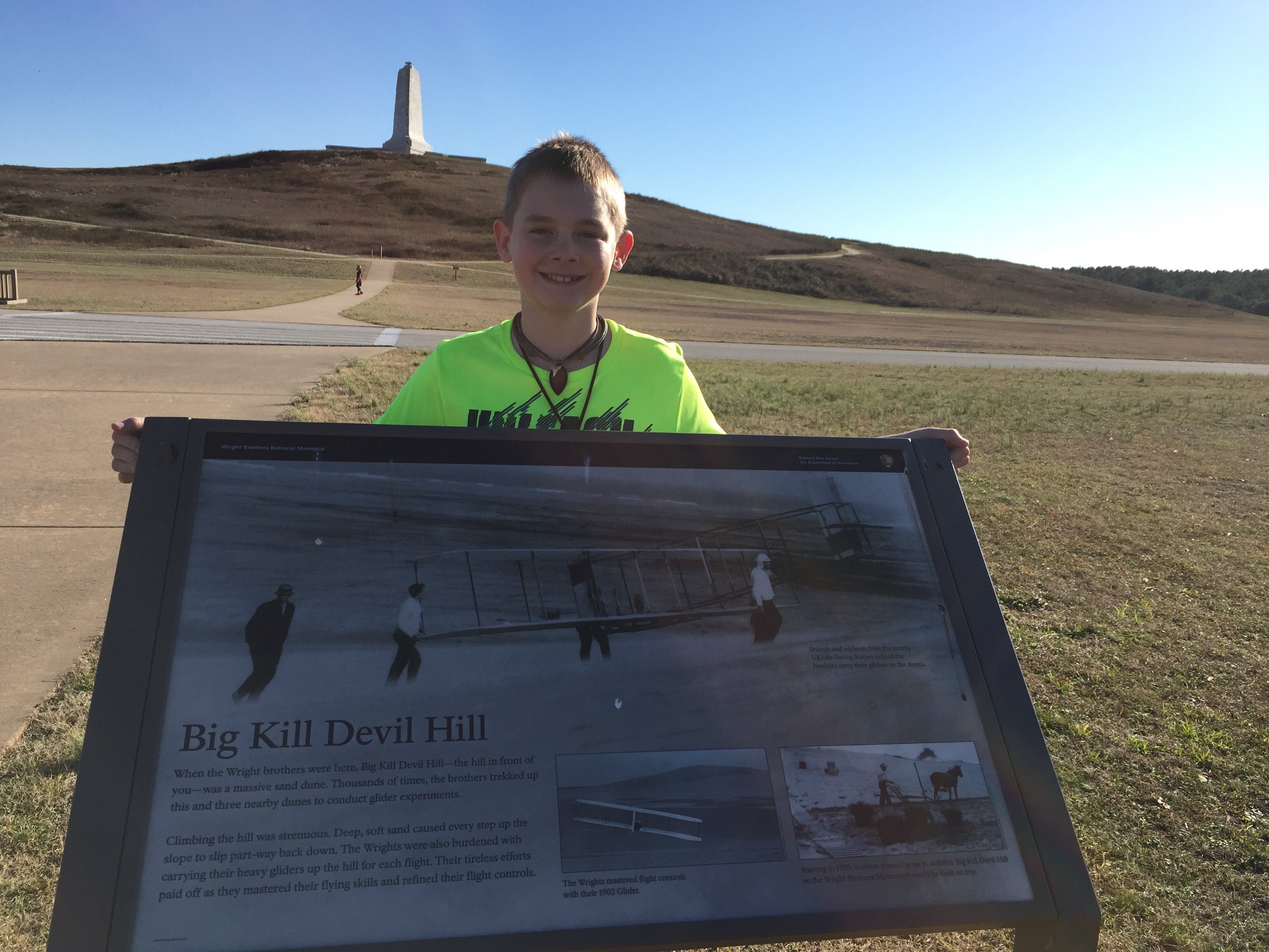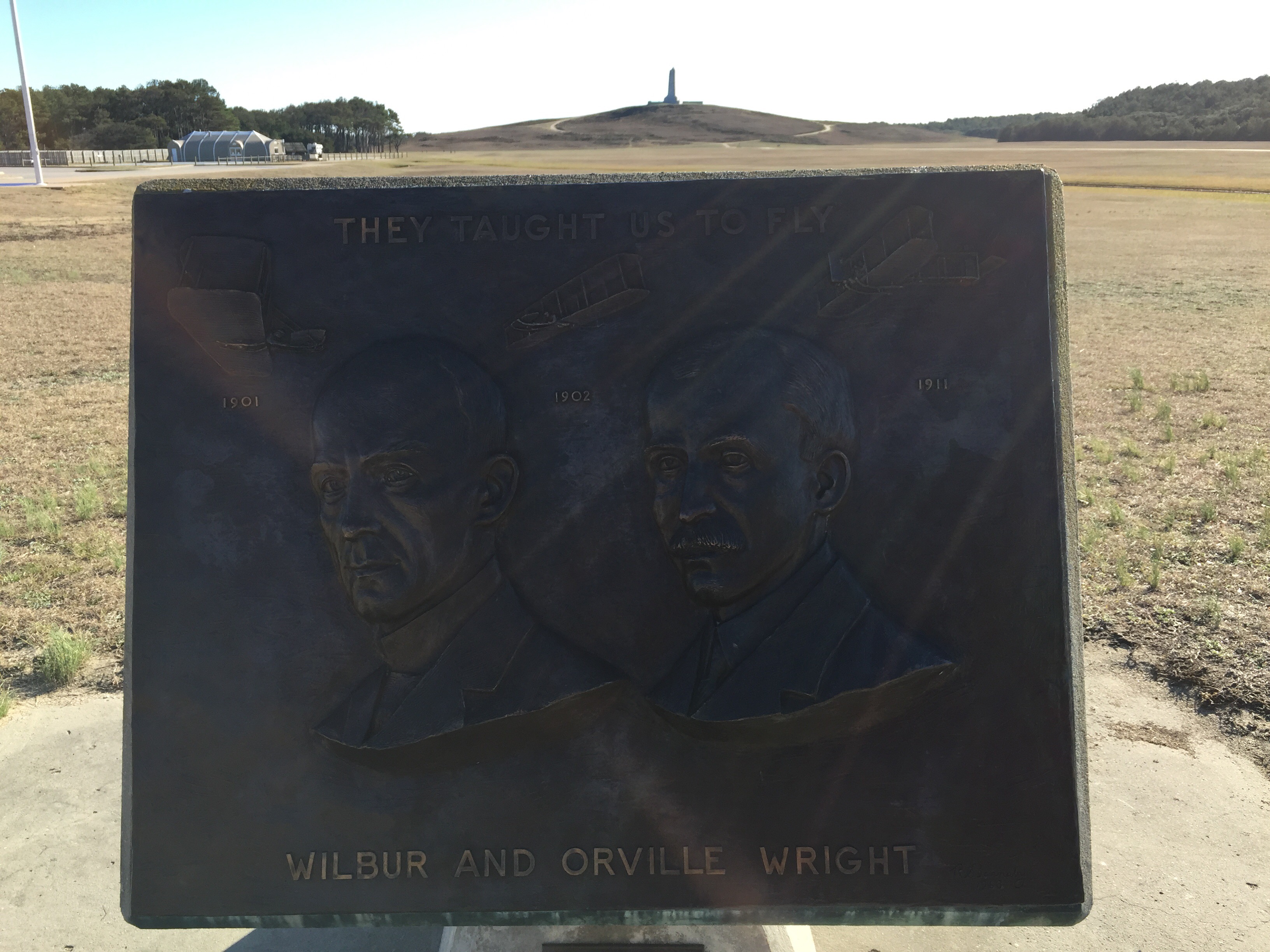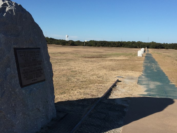 Above: the marker where the first airplane took off on flat ground. Below there are four makers beyond the starting point with numbers on them for the 1st, 2nd, 3rd, and 4th flights. The 4th attempt with the plane flying 800 ft.