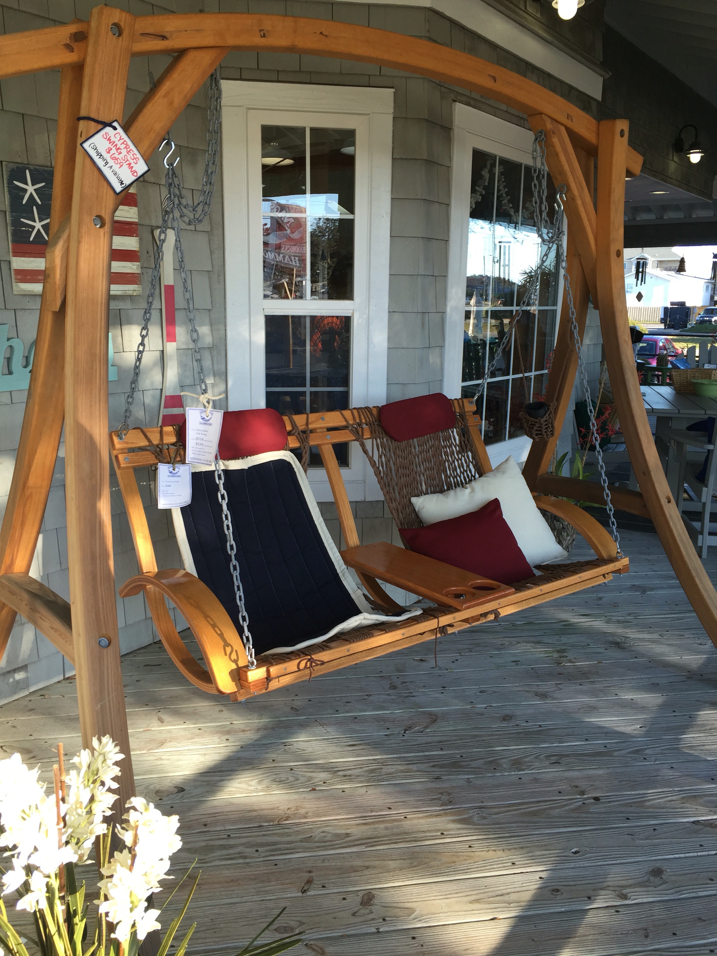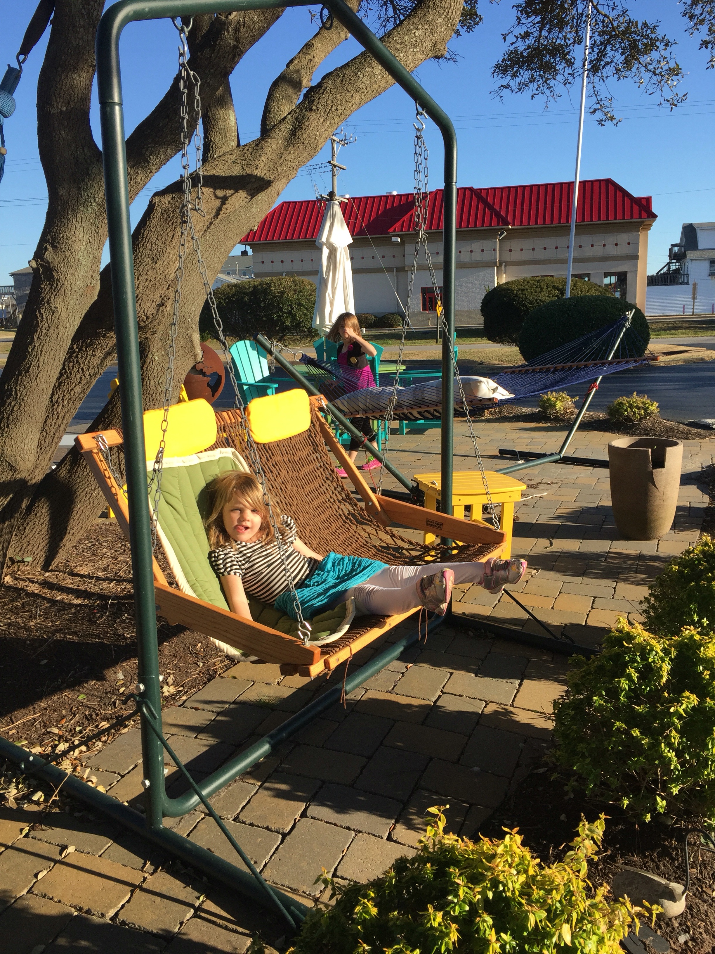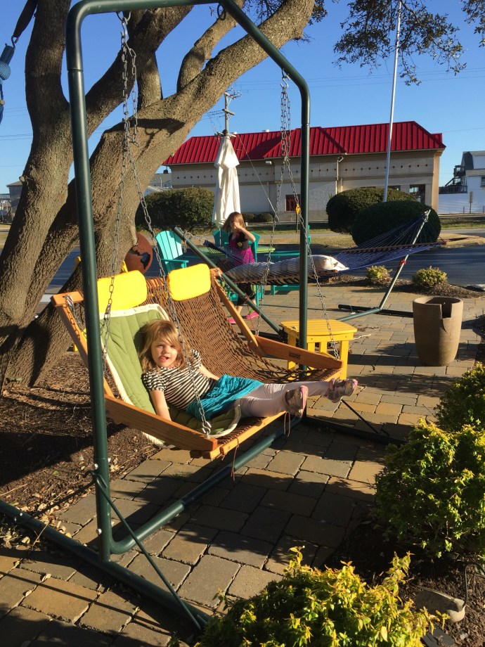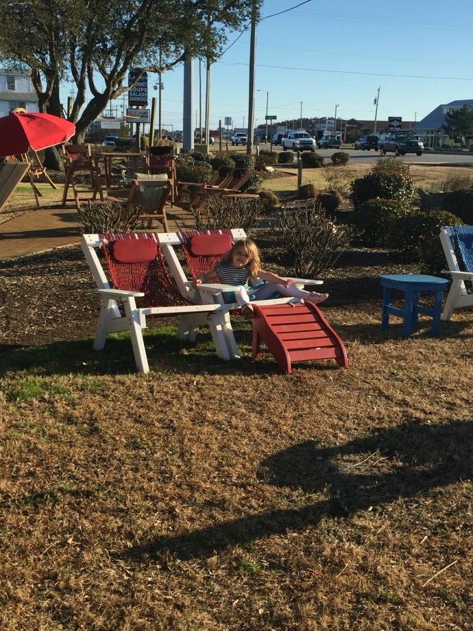 The breeze was perfect, and the 74 degree weather felt hot after last weeks blizzard. We decided it was nicer than most summer days on the Oregon beach and the kids bargained to spend just a little more time taking in the views from the monument that topped a sand dune and had an awesome view in all 360 degrees. We stayed a little longer then raced down the sand dune getting extra pent up energy out of our little ones. Hannah turned in her JR Ranger book for a badge and the volunteer gave her a badge for Eve as well even though she did not finish her book. The volunteer was telling us that she goes around working at national parks and living in her Motorhome all over the US. She asked the kids what their favorite parks were and Hannah told her that the Grand Canyon was pretty nice, and Hawaii. She said she had never been to Hawaii so we encouraged her to some day see if she can volunteer at Volcano national park in Hawaii. After the Wright Brothers National Memorial we headed towards Bodie Island Light house getting distracted about half way by a hammock shop.