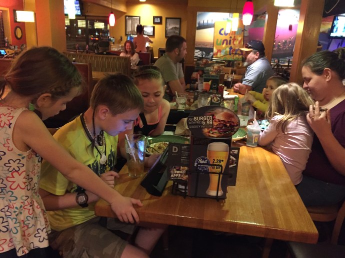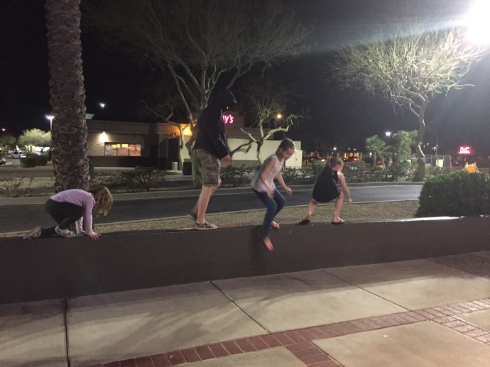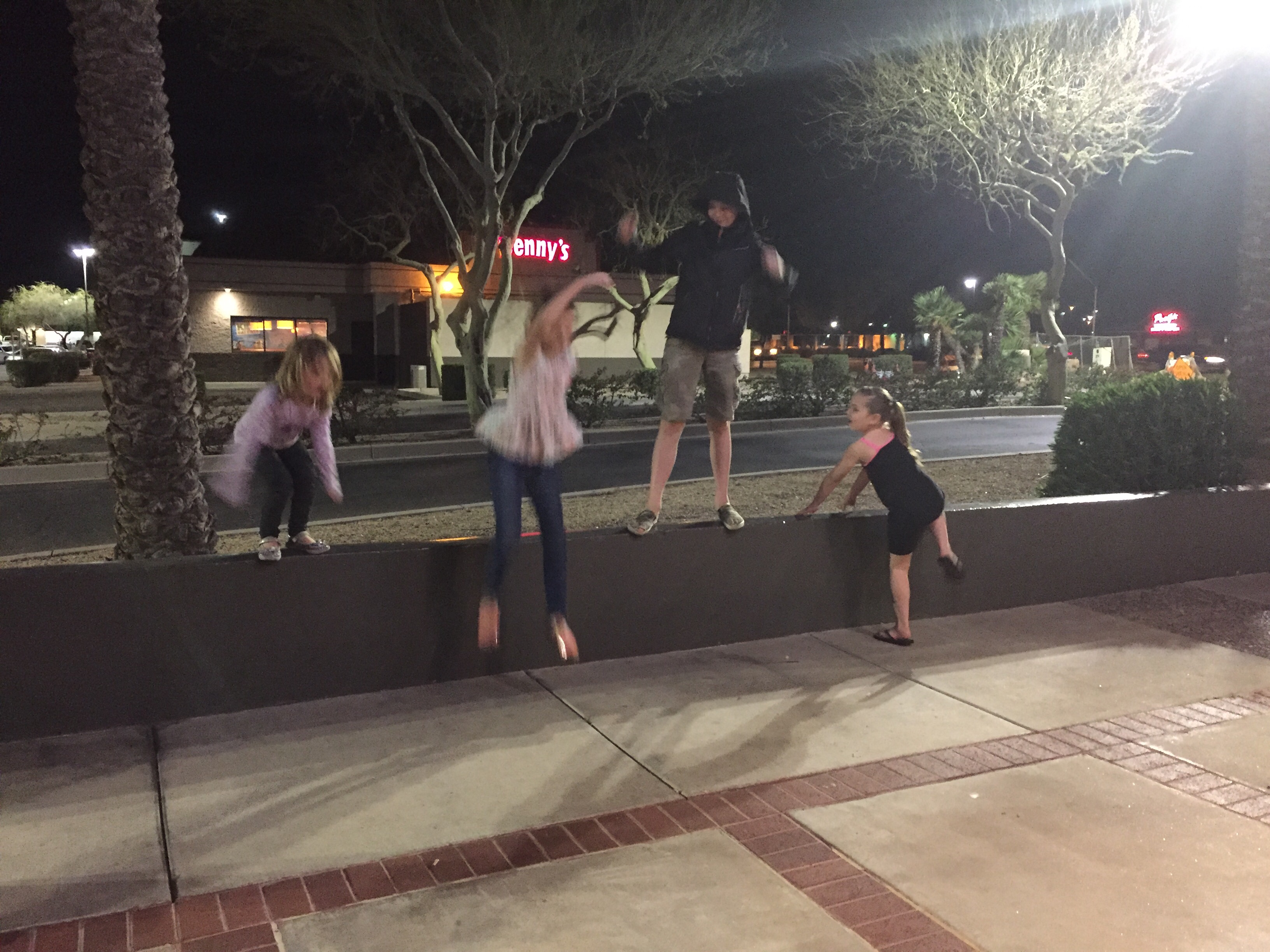 We got into Phoenix at rush hour of course because that is how we roll. But, still we made pretty good time. It is my cousin Heidi Marie’s birthday, we were excited to see them and celebrate together. We loved dinner at Applebees and just happened to be there on their kids $.99 day. Yay. She isn’t a fan of people singing to her so we didn’t do the restaurant singing and bringing cake thing and we were pretty much all too full for dessert. We stood outside and talked while the kids played.