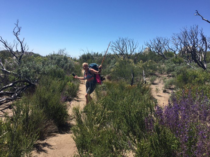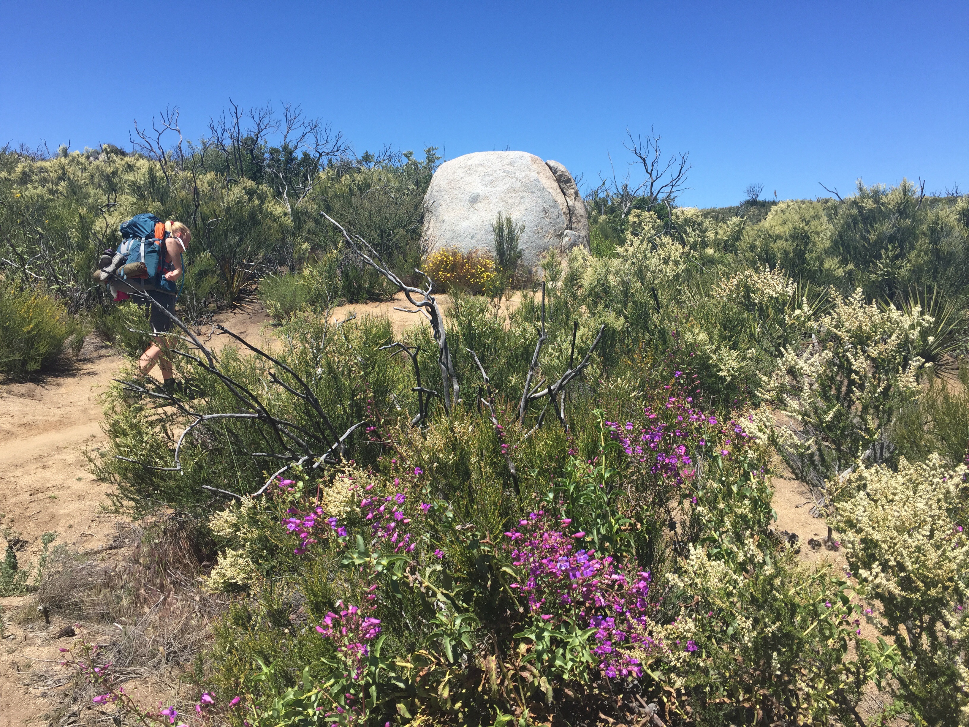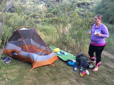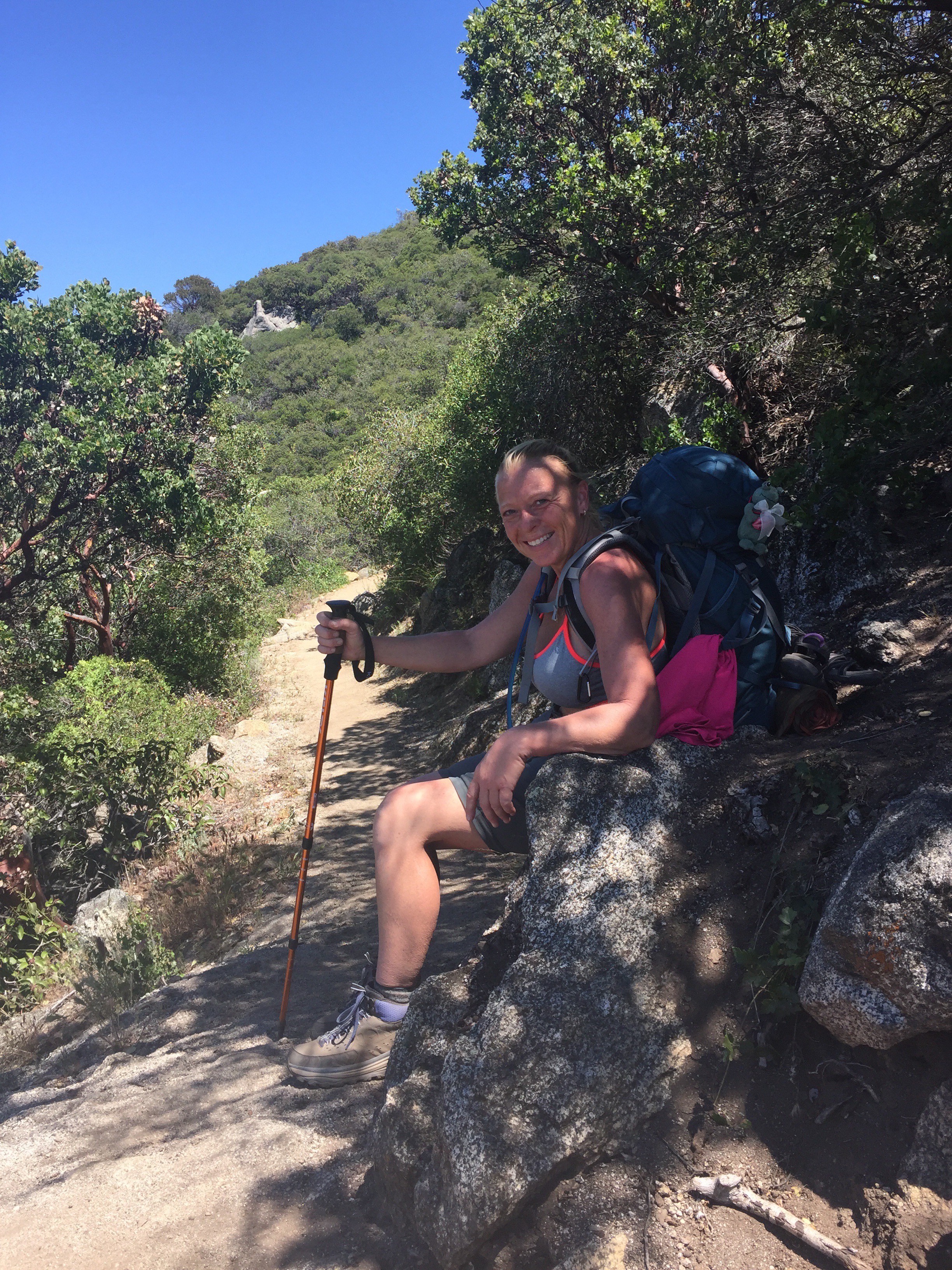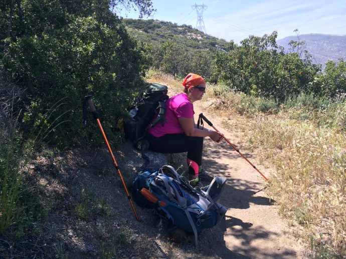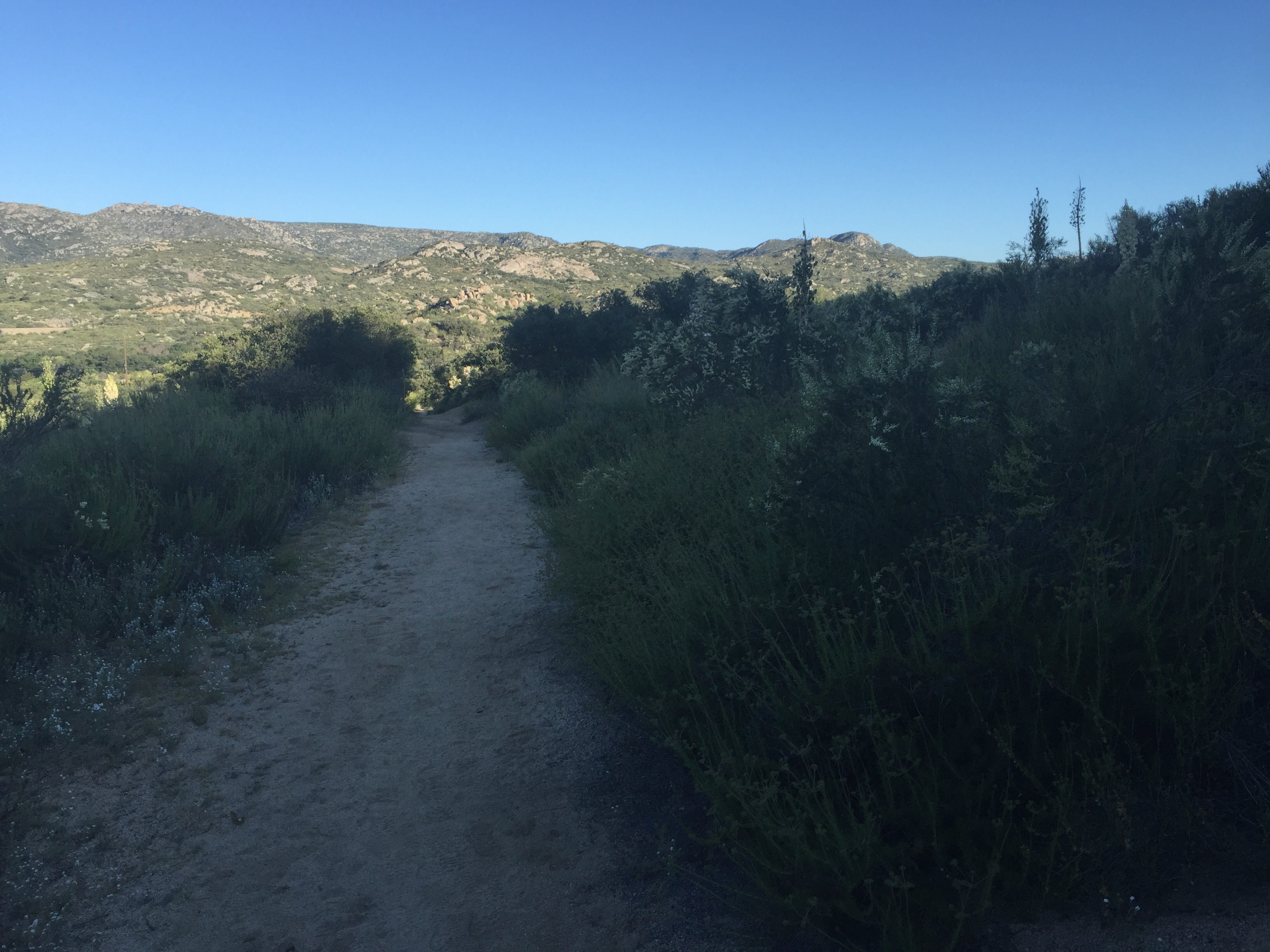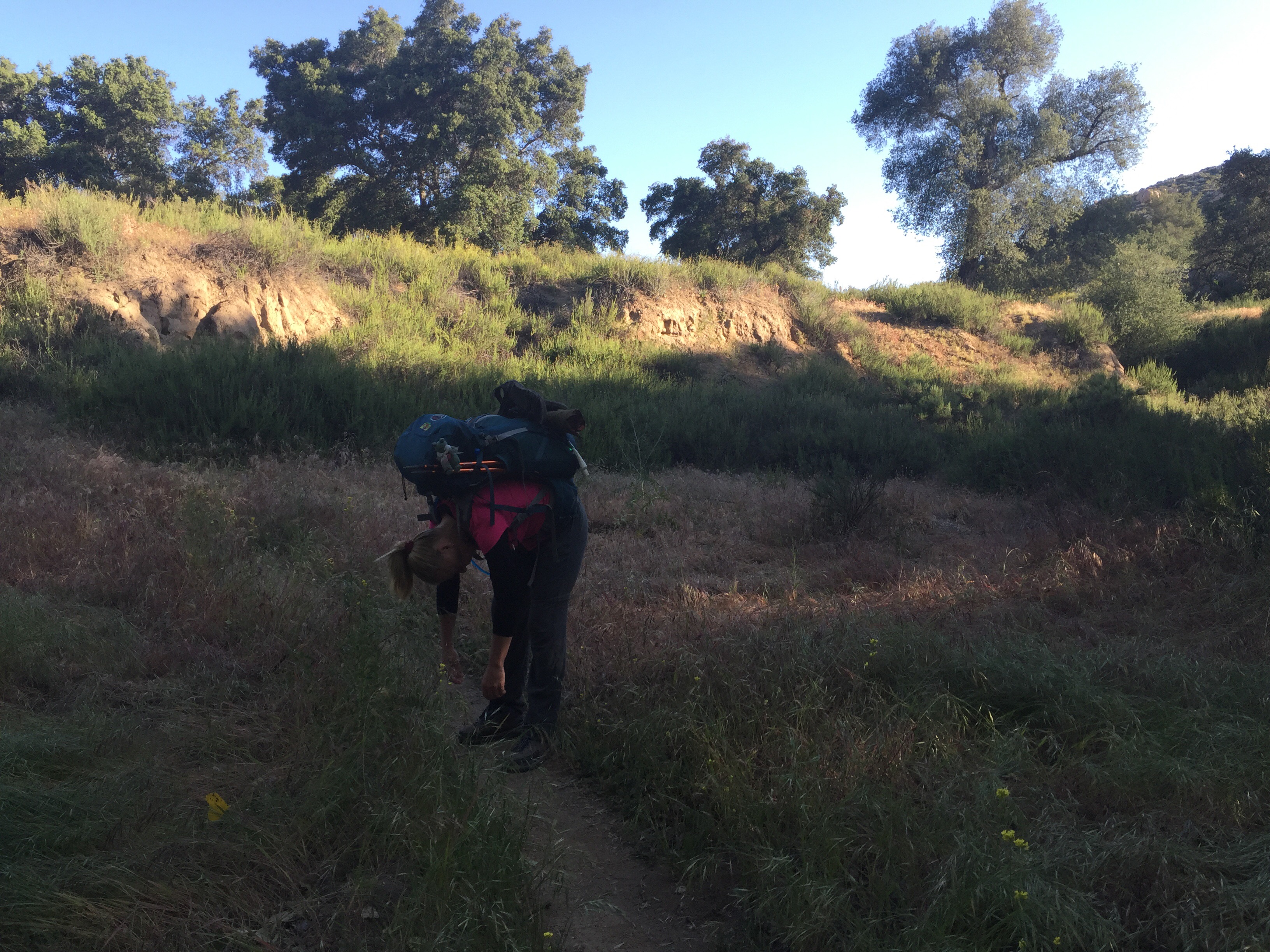 None of these pictures show the steepness of the trail as I wasn’t for pulling my camera out on those parts where I just needed to keep my momentum. I stumbled into camp between 4:00 and 4:30 Tiffany was ahead of me a little ways and I could hear her talking to some of the other hikers. I inflated the new air mattress and practically fell onto it maybe two feet off of the trail. I could not move another muscle. A lot of other hikers came by we estimate maybe 50 people started the PCT with us May 3rd we had no idea it would be so crowded. We felt completely sheepish saying we were stopping in Morena Lake when the rest of them were aiming for Canada. We wanted to through hike it with them so badly. After resting about 30 minutes I decide to try to move and I could not move my arms at all. Severe pain in my shoulders and neck warned me with every slight muscle twitch to not do that again. Tiffany found my predicament hilarious. She kept asking me if I wanted some of the snack foods she was having and for the most part I answered no. Until she got to the Mangoes where I bargained that I would have some if she could throw it right to my hand, because my arms literally could not move. I couldn’t get up, or get anything out of my bag. This must be a common hiker problem because one of the other hikers piped up with, “Oh, you have T-Rex arms” and that is exactly what it felt like. It was so painful but I got them stretched outage well as my shoulders and that crazy pain and stiffness never came back. Still I could not imagine what agony would be felt in the morning when I had to put that pack back on for the 1000′ elevation climb to get out of this Howser Creek bed oases. I took a short little walk to find a good bathroom spot making attempts to keep my muscles moving as to maybe not as sore tomorrow and they seemed to work. This whole pooping in the woods business would take some getting used to. Dinner was tasty we ate kind of early and we’re all zipped in to our tent by 6:30 or 7:00. Ours was probably the nearest to the trail but in a grassy spot there were quite a few campers with in 50 yards of us and we all gathered on the grassy patch for dinner which allowed us to get to know the other hikers we were hiking with. Three of them had recently hiked the AT. Two girls from Portland were hiking the trail with thier corgi so they were doing mostly night hiking. Several were international visitors with strong accents and a group of just post college age boys that all stuck together. We enjoyed the stories from the AT hikers. One of them worked at REI where Tiffany is from in Minisota he was helping the Portland girls learn how to take their packs on and off correctly and how to adjust them after they we on. We listened and watched taking in all of this information. A man brought a couple of two liter bottles of water for people who had underestimated their water needs. He was a “trail angel” one who watches out for hikers in this area as he lived close by. We did use some of the emergency water. We could have made it out with what we had, but we were so thirsty it was hard to save our 1.5 liters (each) that remained for the hike out. One of the AT hikers who had earned the trail name last year of Yoda for often speaking like him asked me if I had Ibuprofen for my stiffness and I had to admit that although I had planned to bring some it didn’t end up making it in my bag from my work lunch bag. She said, “do you have chapstick?”and yes I did have that. I was waiting for some kind of weird soreness hack done with chapstick like I had experienced in cycling with Red Man chewing tobacco, but know she was proposing a trade. Ibuprofen for tonight and tomorrow for use of my chapstick. She had managed to forget hers at the home she stayed in the night before. I told her that I only had 5 more miles to hike she might as well keep the chapstick. She handed me two 200mg tabs for tonight and one 800mg tab for tomorrow morning. Now that, I thought, was brilliant! If I get a chance to through hike I’m getting a prescription for scored 800mg ibuprofen tabs. I don’t generally take them until I really need them and that is a much more compact way to bring soreness/pain management with you.