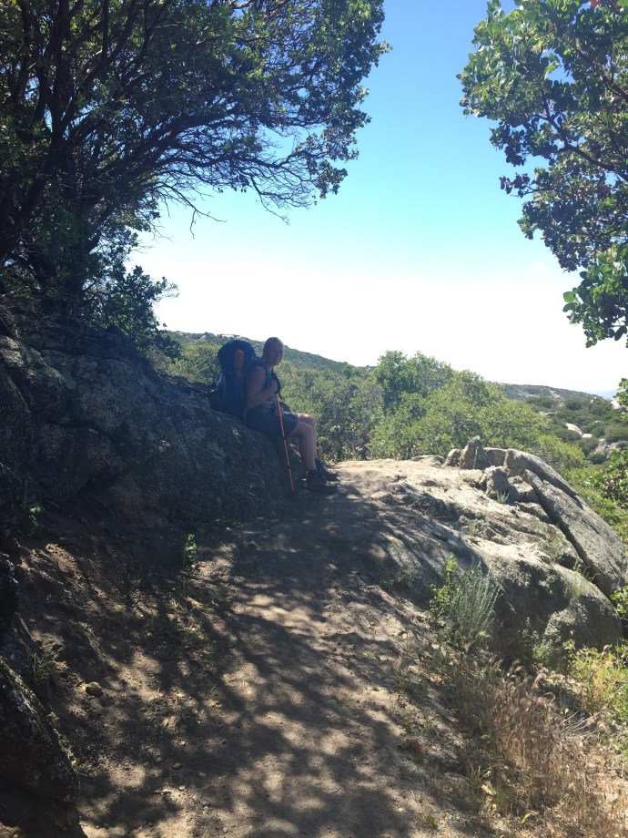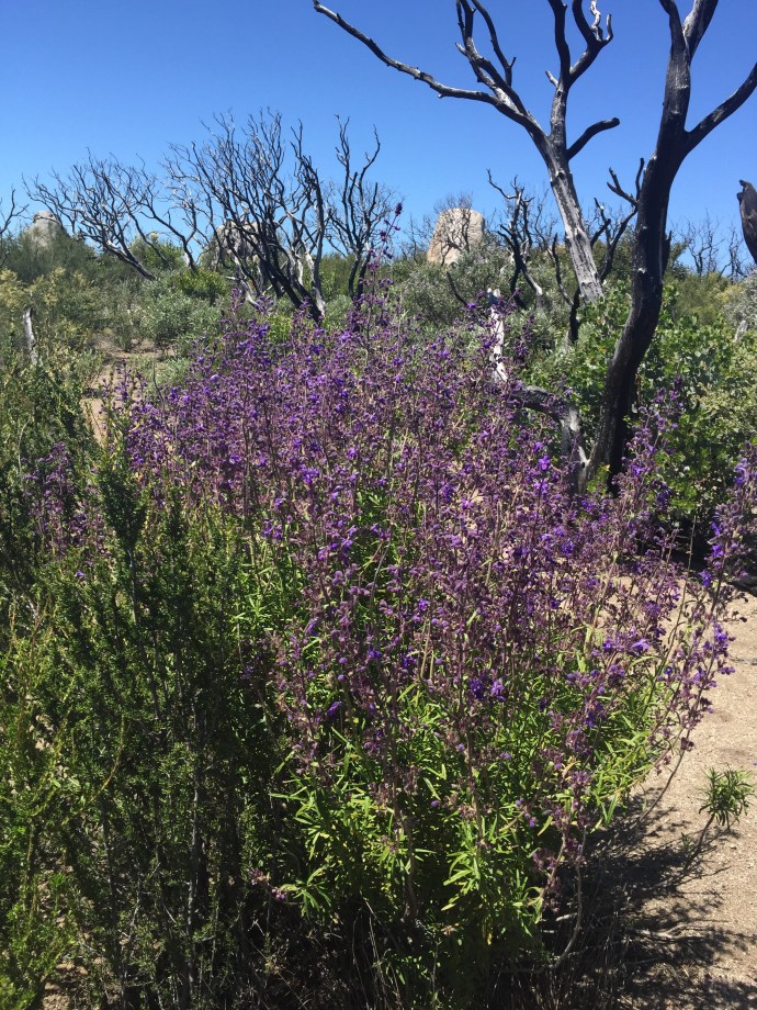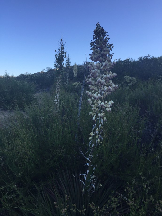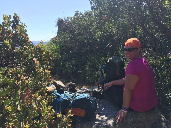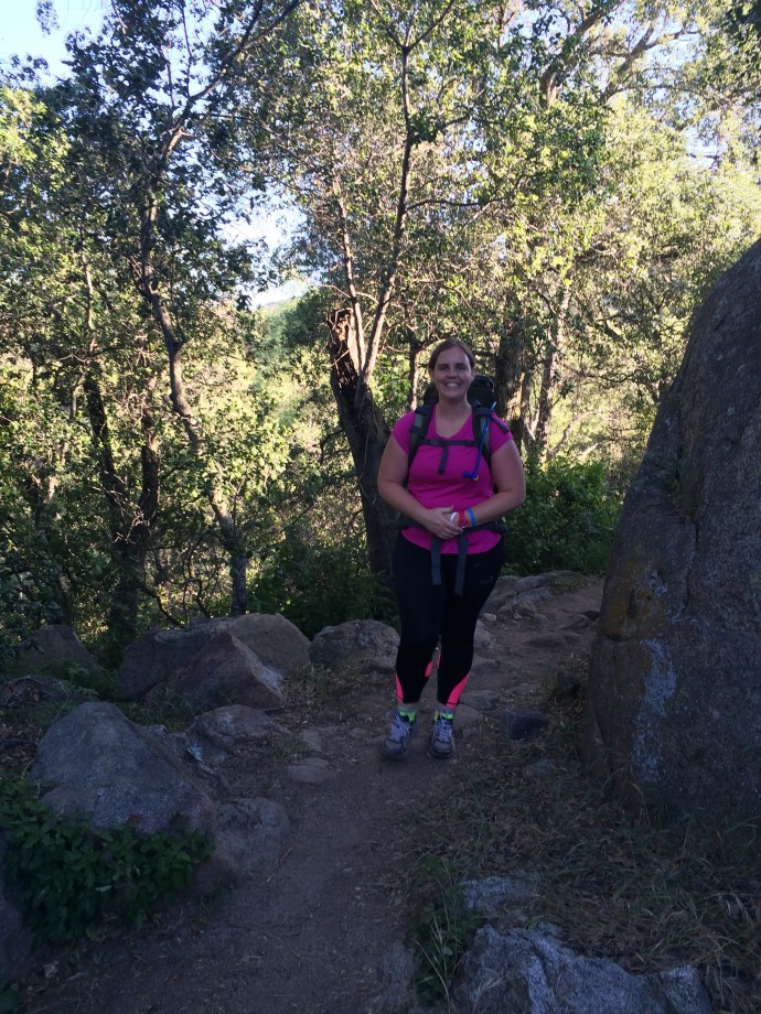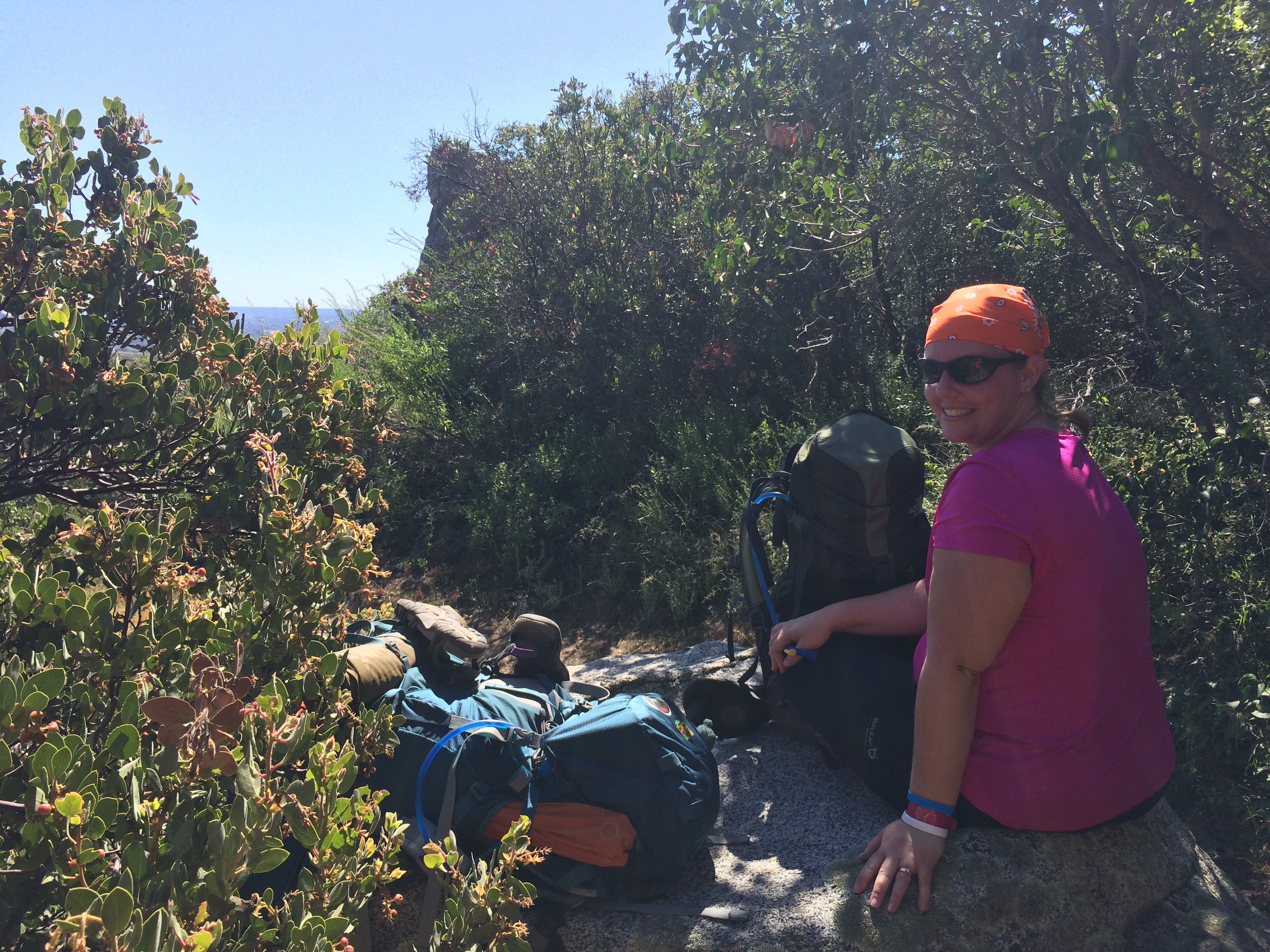 These pictures are going to be completely out of order because today the Blog is deciding on it’s own to put them in what ever order it wants and I don’t really want to fight it. We were so surprised by how much shade and greenery there was. Every plant was green and blooming and completely gorgeous! The shad still helped some in the heat of the day but we still felt every one of the 82-84 degrees in the sun working so hard with heavy packs on our backs. One step at a time. Out of our 5 liters of water (I had 5.5) we needed to save one liter for cooking and two for the second day. We both ran out of our allotted two liters before we hit the 10 mile marker. It was so hot and we were so thirsty. We had heard the best camping place was around mile marker 15 at a place called Howser Creek. (Don’t be fooled there is not water there) we rationalized that since we were going over half way today we could use some of tomorrow’s water. There was for sure water at Morena Lake. My legs were so tiered for the descent into Howser Creek. I was fumbling a bit with each step. Not because o was dehydrated or had heat exhaustion just because we had hiked a long ways with a lot of weight on my unadjusted legs. Causing them to be a bit shakey. I was so thankful for the walking pole that Tiffany gave me to use. I decided that if I ever did get a chance to do a through hike I would need two poles. I just don’t have good enough balance plus the addition of the pack making me top heavy and the tiredness of my legs acting like they may choose to just give out at will made me take tiny slow steps especially on the descent.