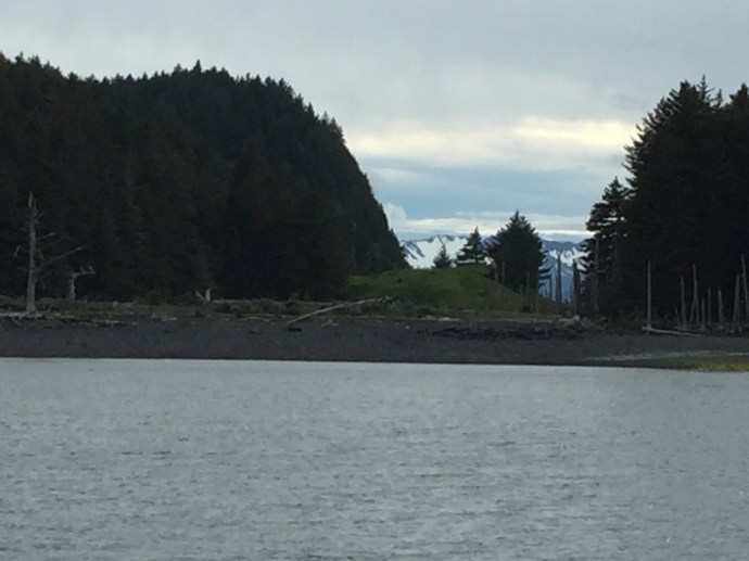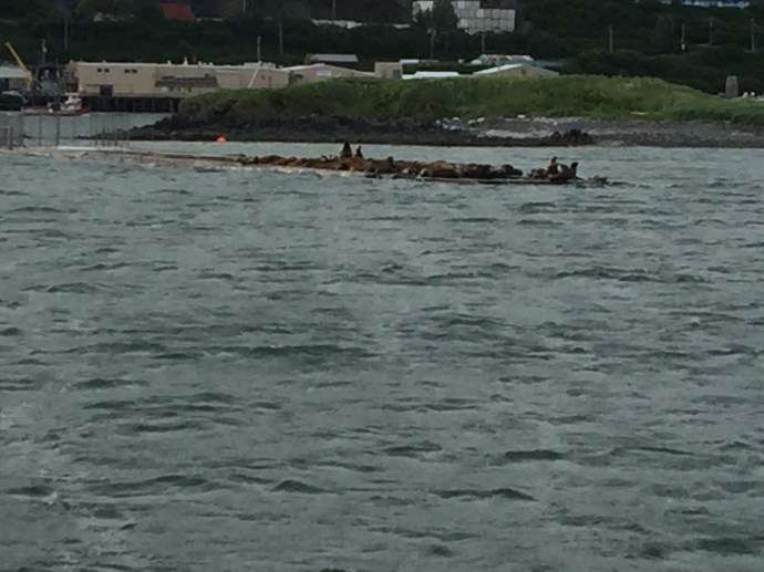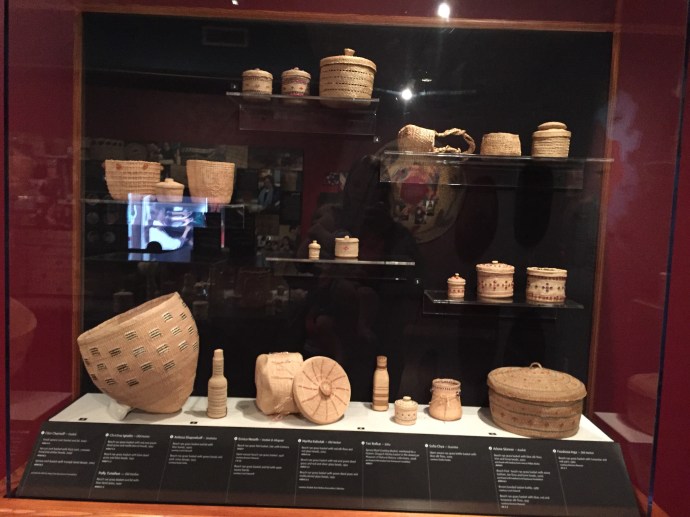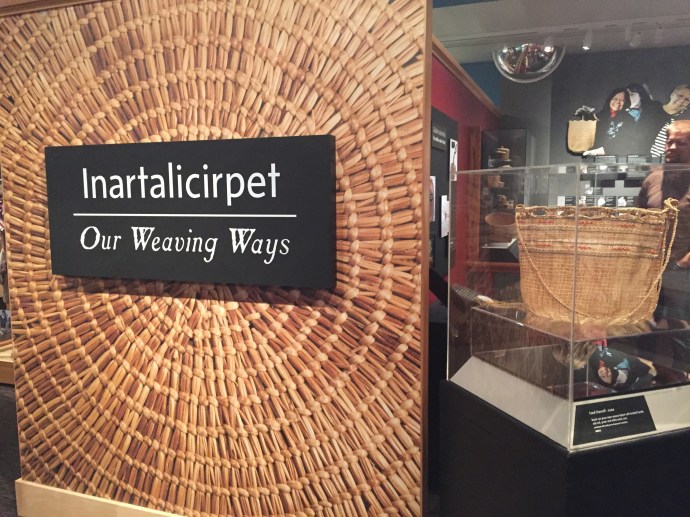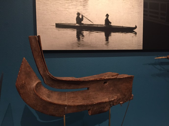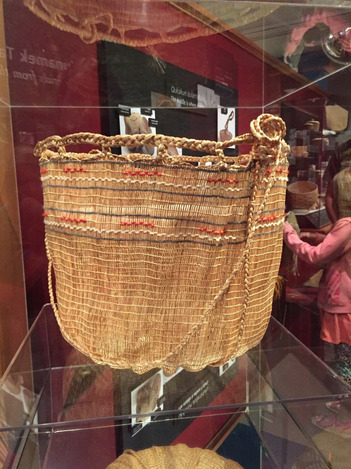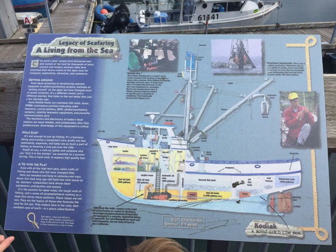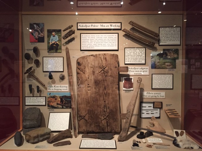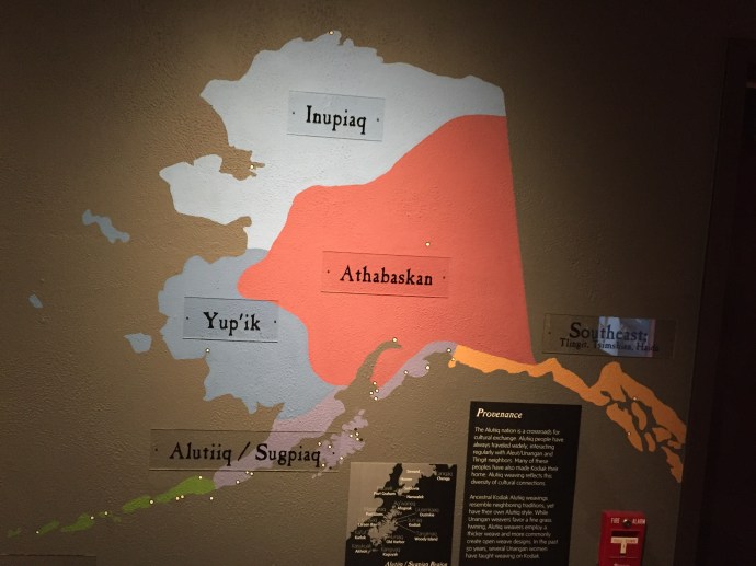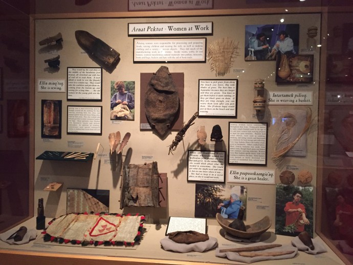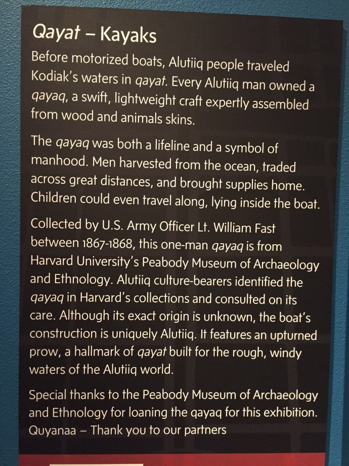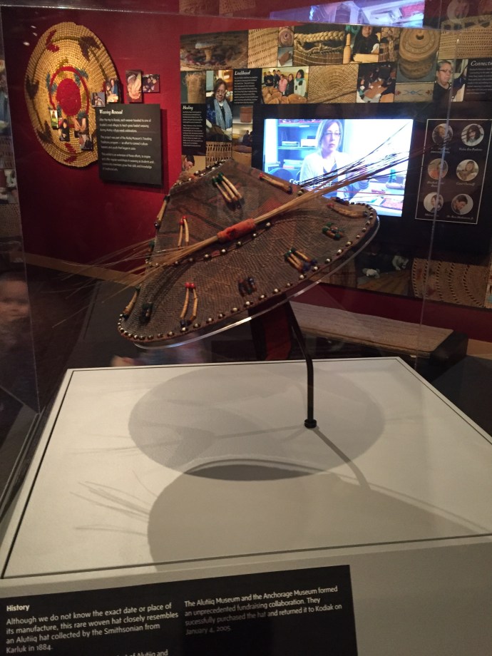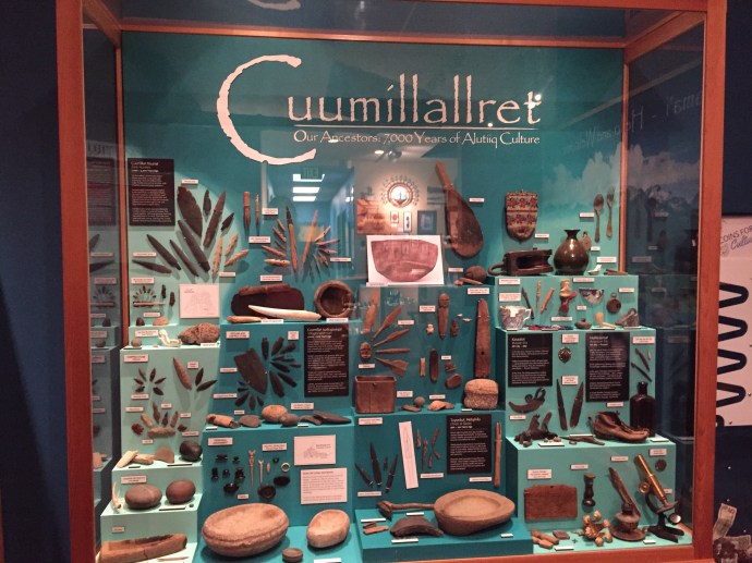 The main body of the regalia is baby caribou, the curly decorative fringe is land otter. The little white puffs are ermine (a little white weasel like critter). The long white wisps were mountain goat and the thick dark brown cuffs and decorative puffs are sea otter. The brown and black is for the land red for the blood line of the people, and white for the snow. The dance regalia that the Alutiiq dancers wear has awesome puffy stripes of white that is really eye catchingly beautiful. Hannah (Sophie’s Hannah) wore this outfit and danced at it’s unveiling here at the museum. Such an amazing project. Caleb’s favorite part was the videos on how to prepare octopus, chiton, seaweed and many other sea provisions for consumption. They would go from start to finish and were quite detailed and below the display was recipe cards it is too bad that there is a health warning on shell fish in this area right now and it is not advised to eat local mussels, clams, or chiton at this time.