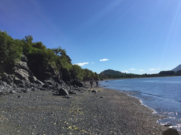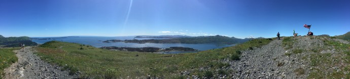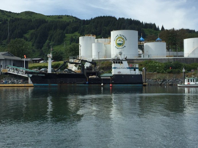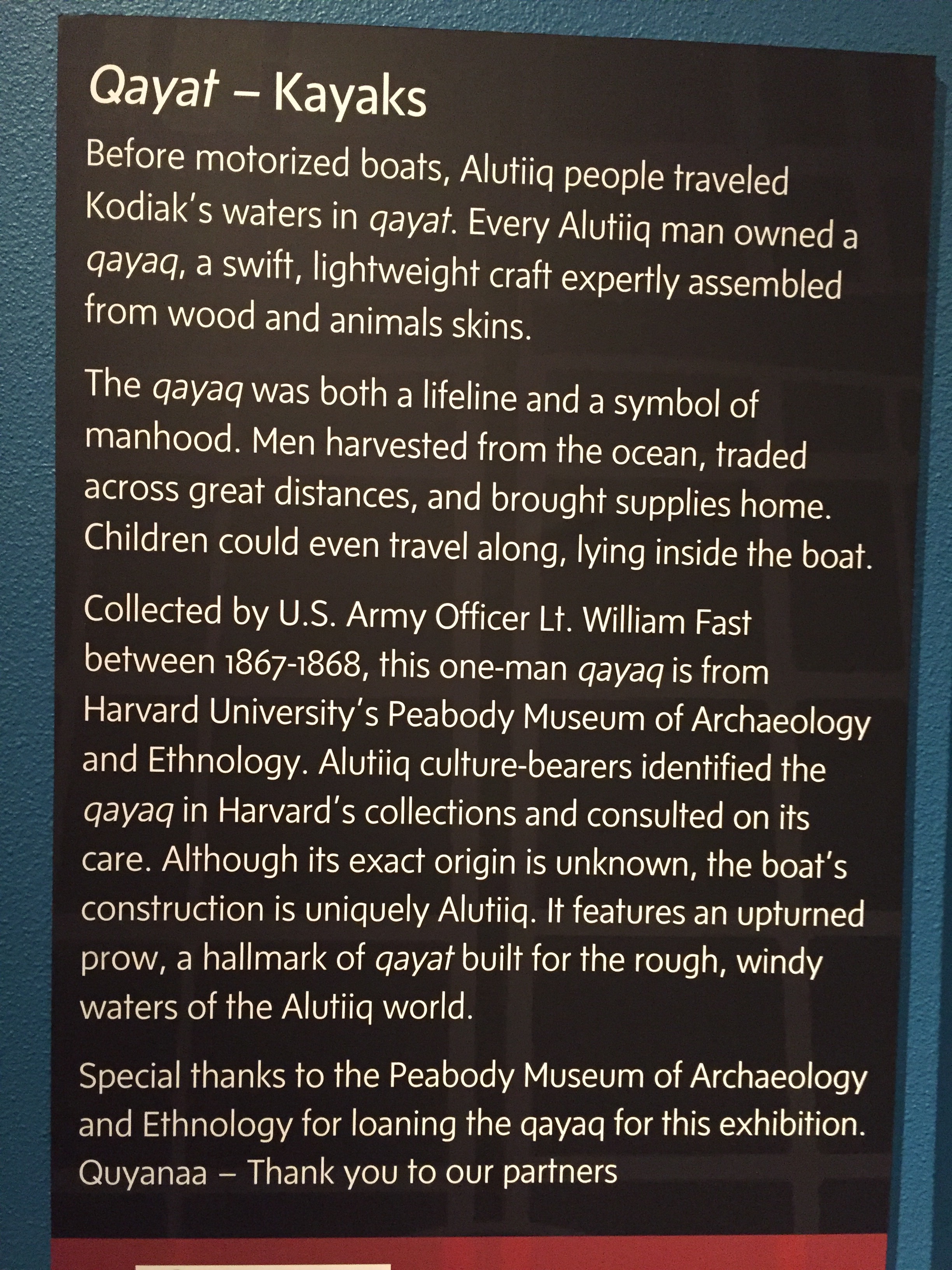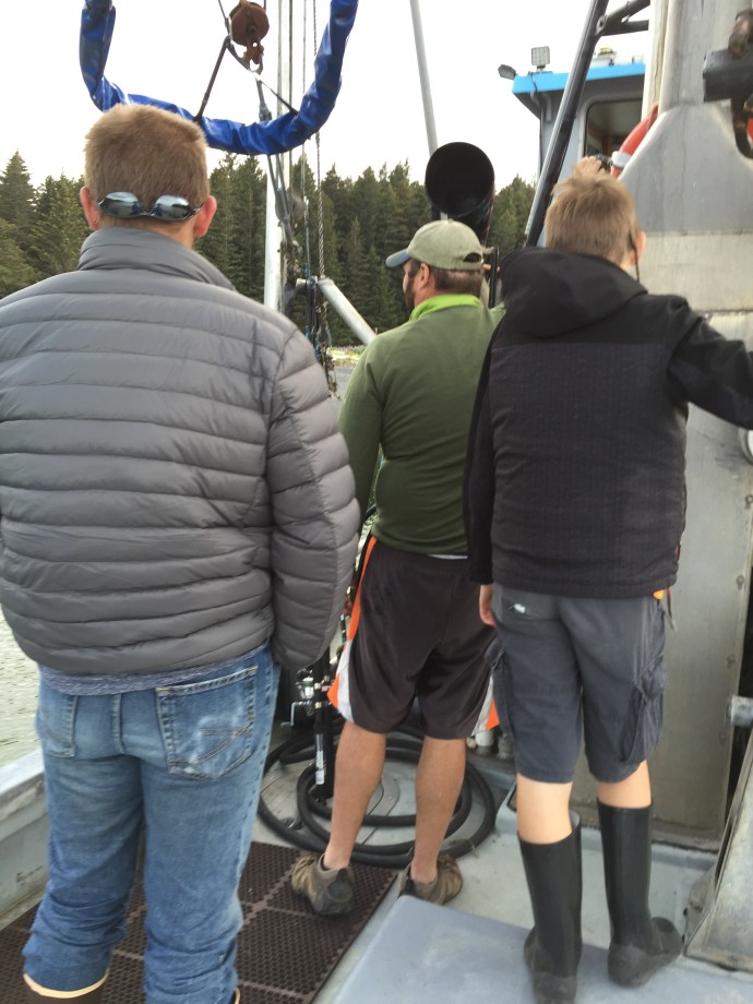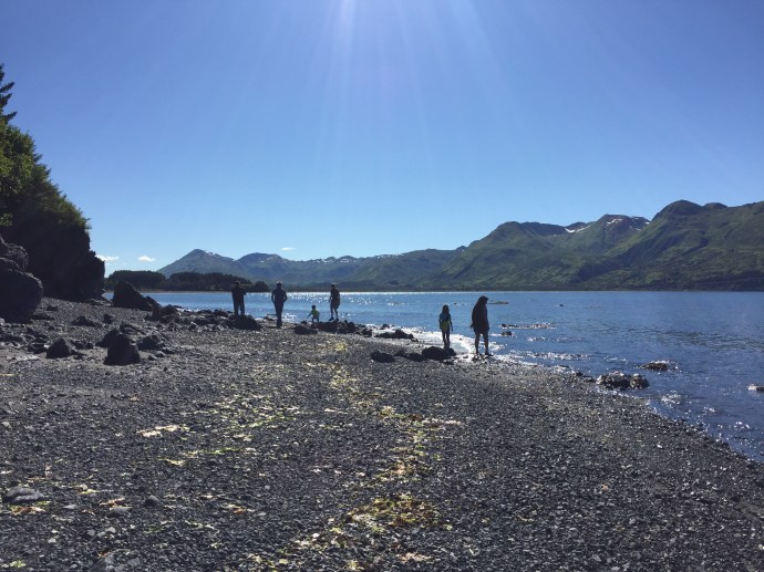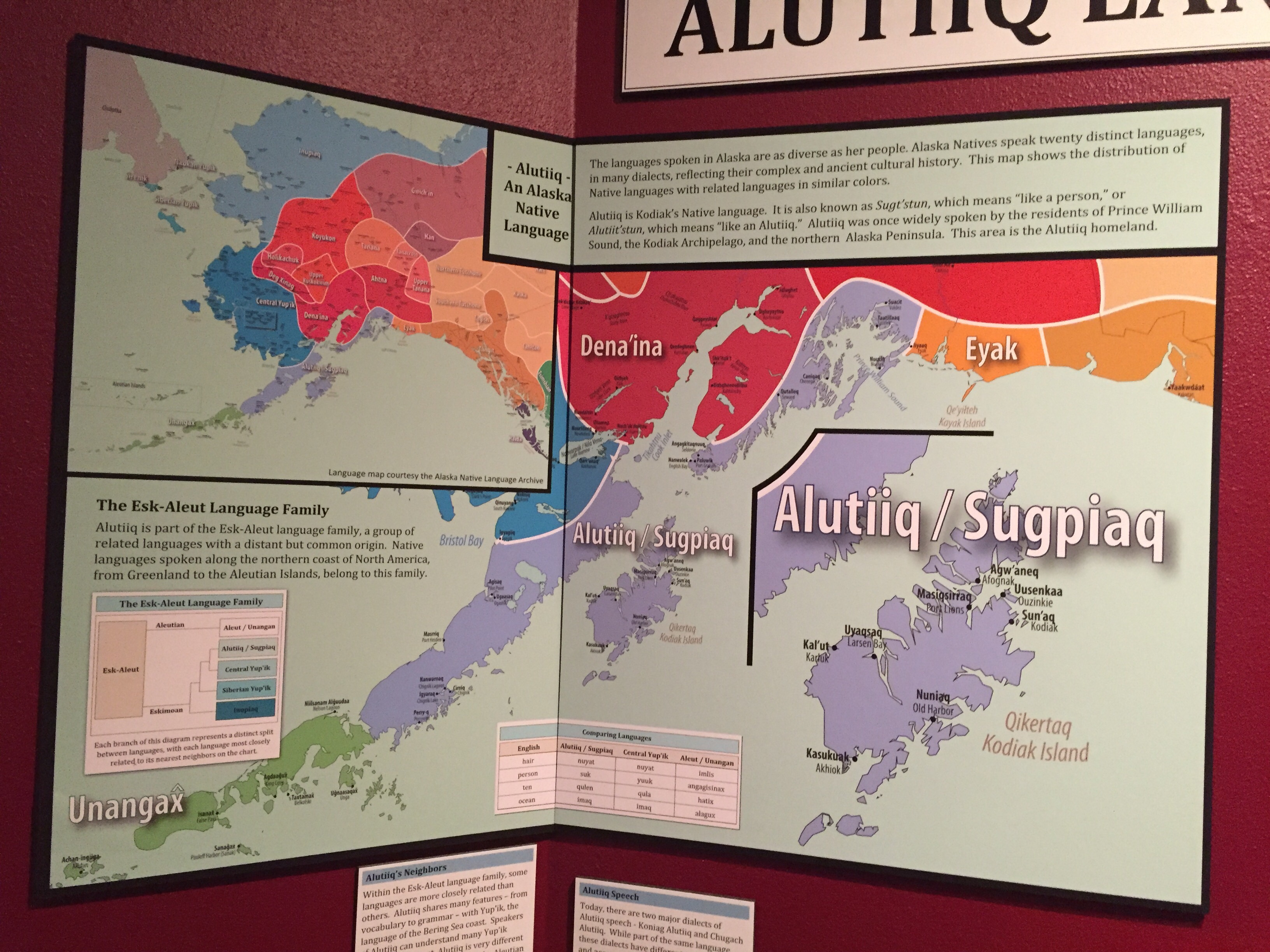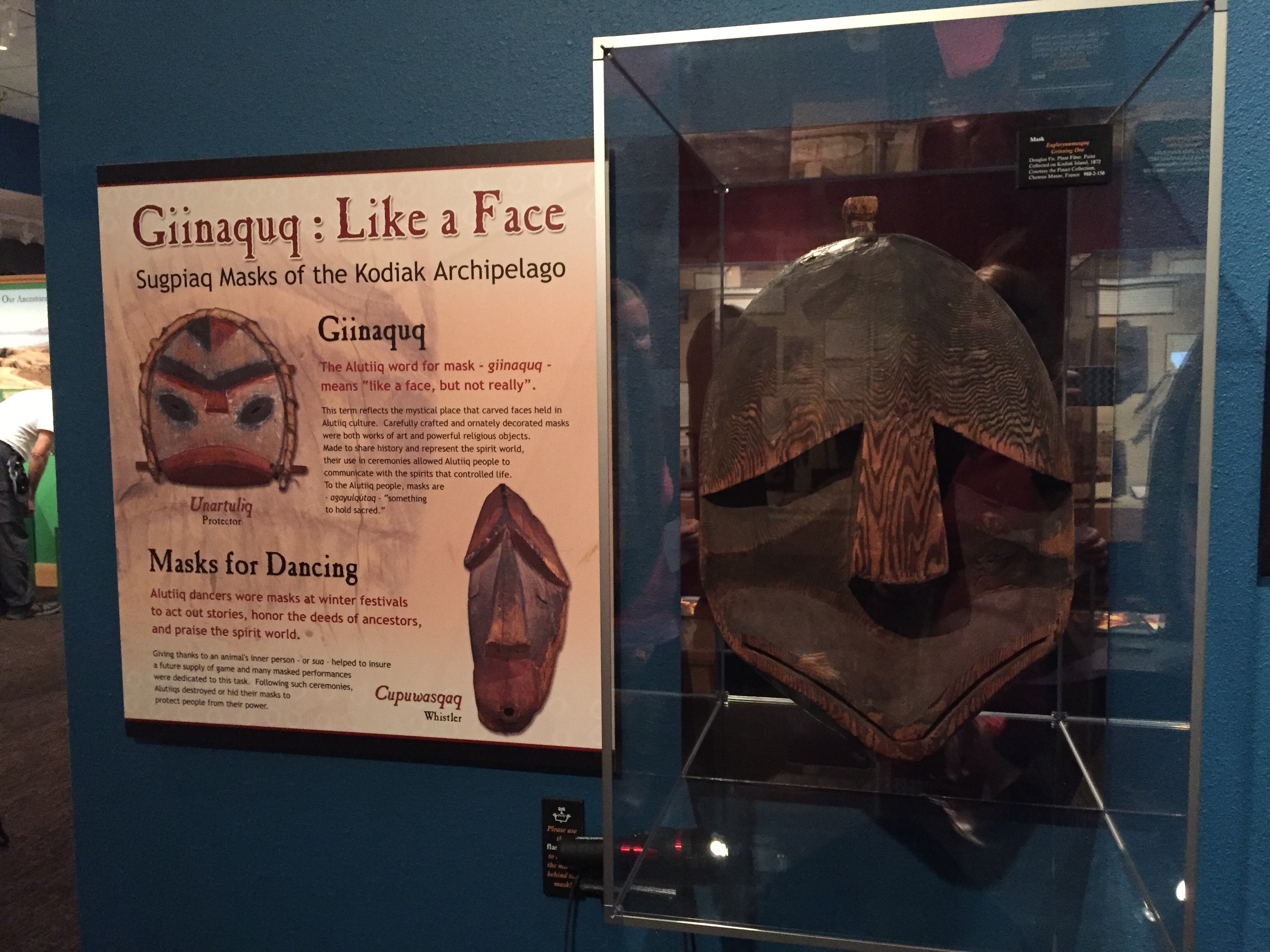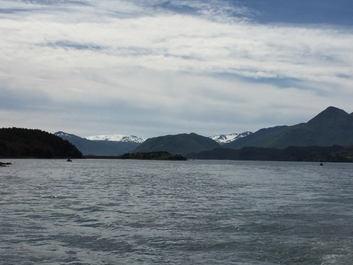 The main body of the regalia is baby caribou, the curly decorative fringe is land otter. The little white puffs are ermine (a little white weasel like critter). The long white wisps were mountain goat and the thick dark brown cuffs and decorative puffs are sea otter. The brown and black is for the land red for the blood line of the people, and white for the snow. The dance regalia that the Alutiiq dancers wear has awesome puffy stripes of white that is really eye catchingly beautiful. Hannah (Sophie’s Hannah) wore this outfit and danced at it’s unveiling here at the museum. Such an amazing project. Caleb’s favorite part was the videos on how to prepare octopus, chiton, seaweed and many other sea provisions for consumption. They would go from start to finish and were quite detailed and below the display was recipe cards it is too bad that there is a health warning on shell fish in this area right now and it is not advised to eat local mussels, clams, or chiton at this time.
