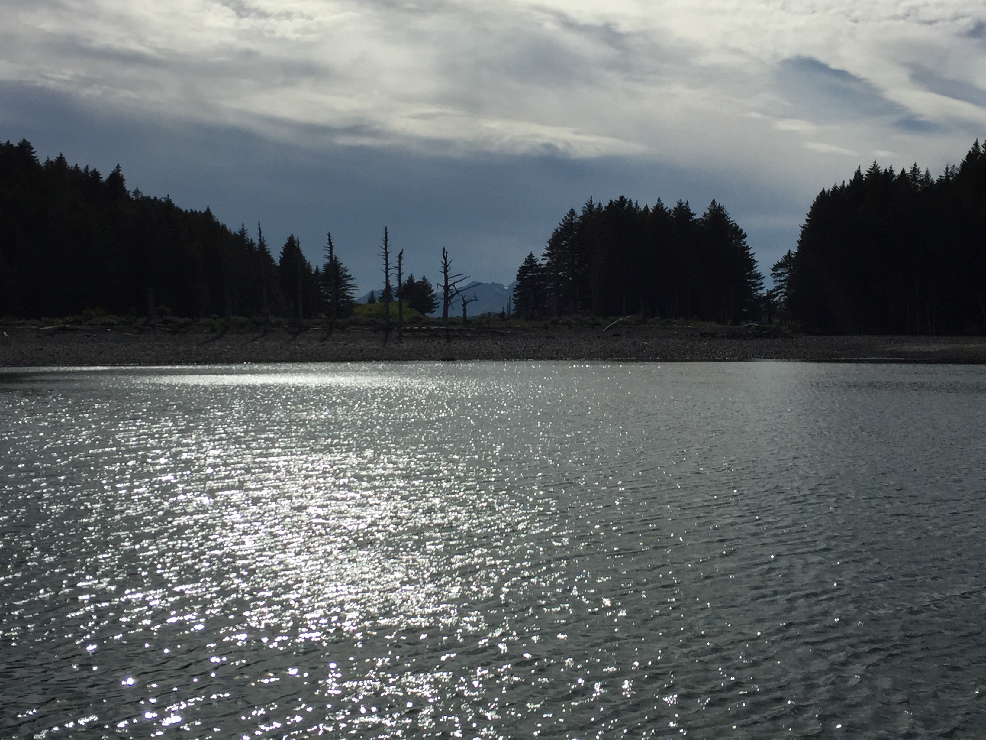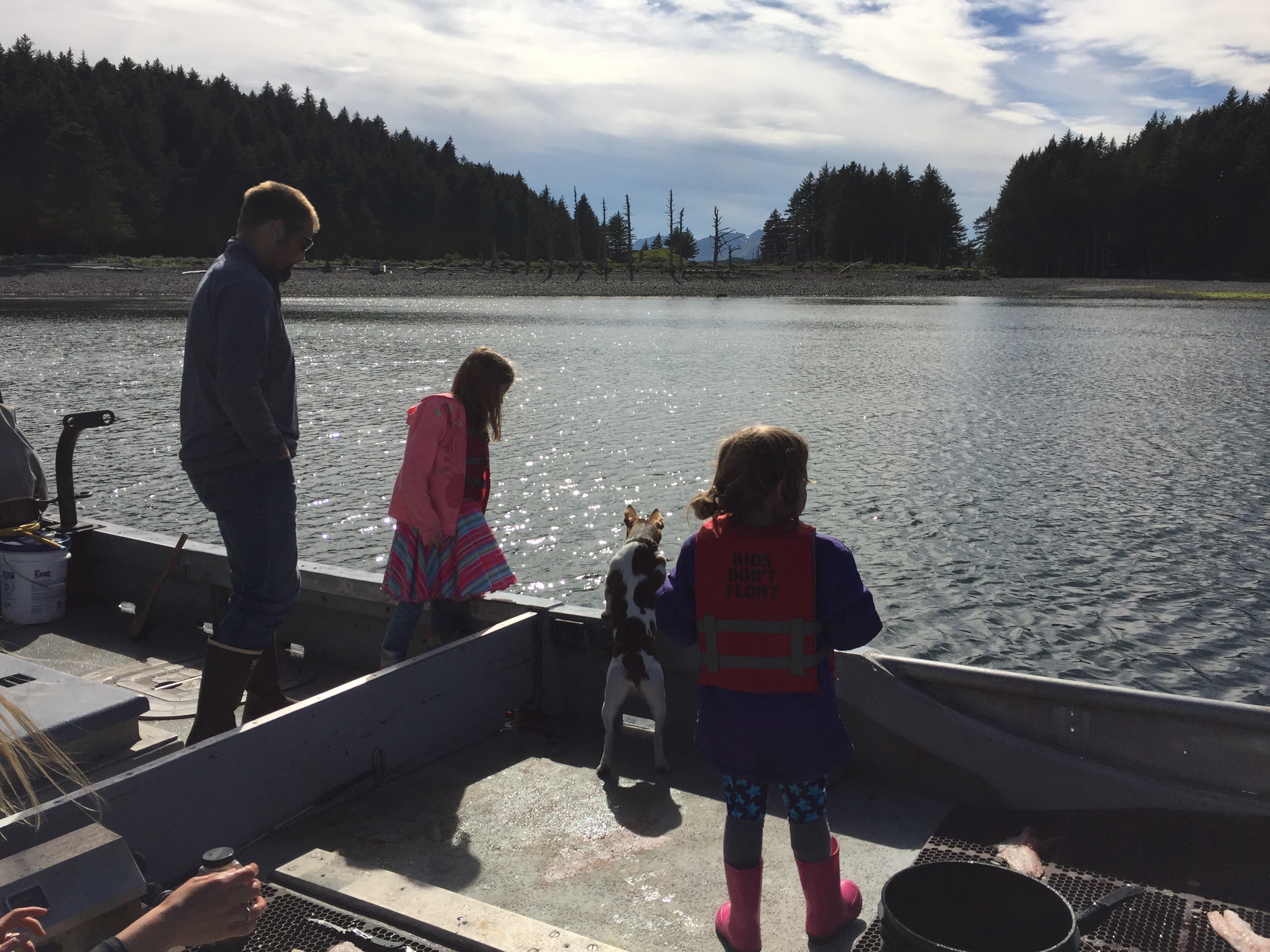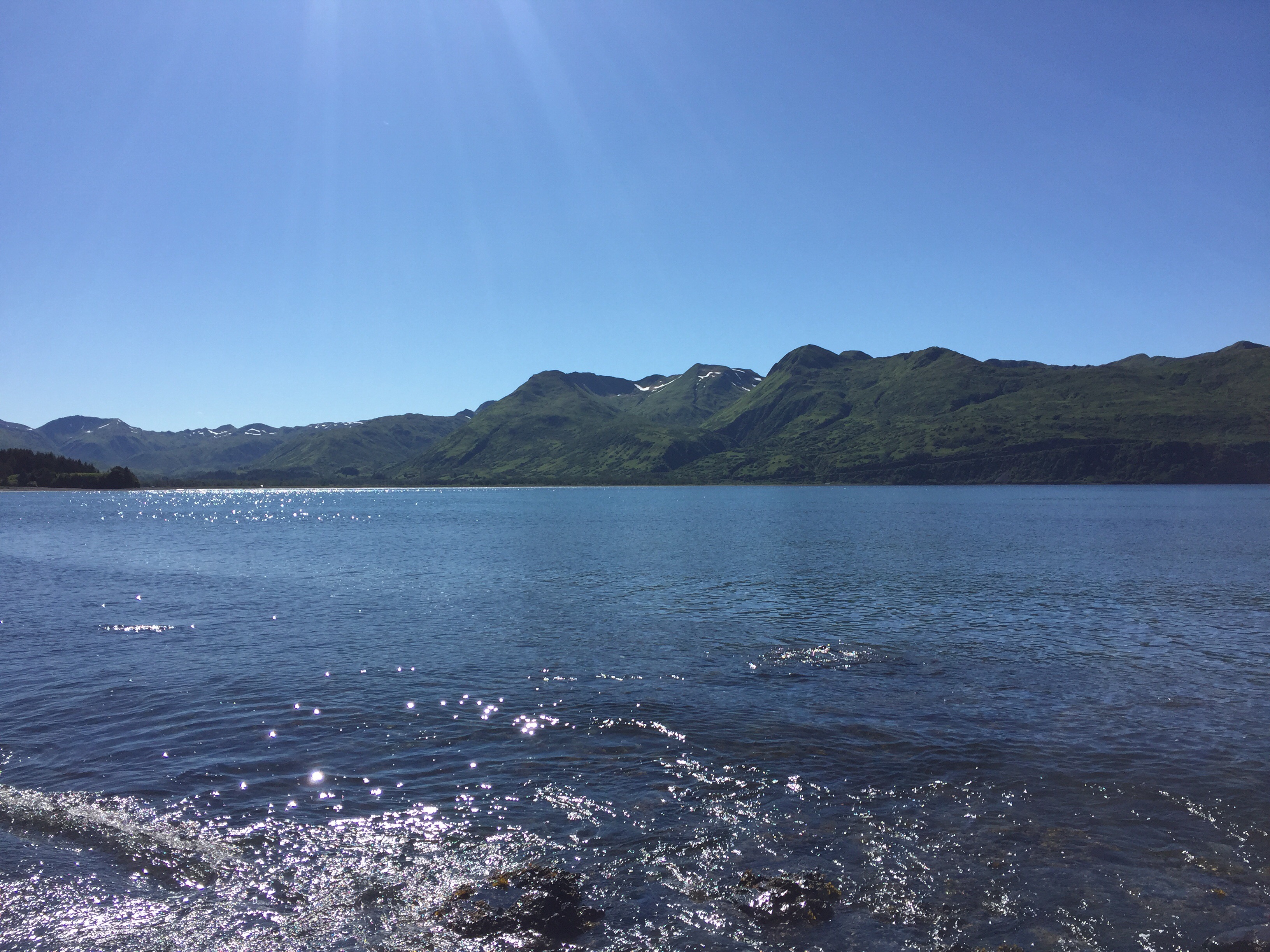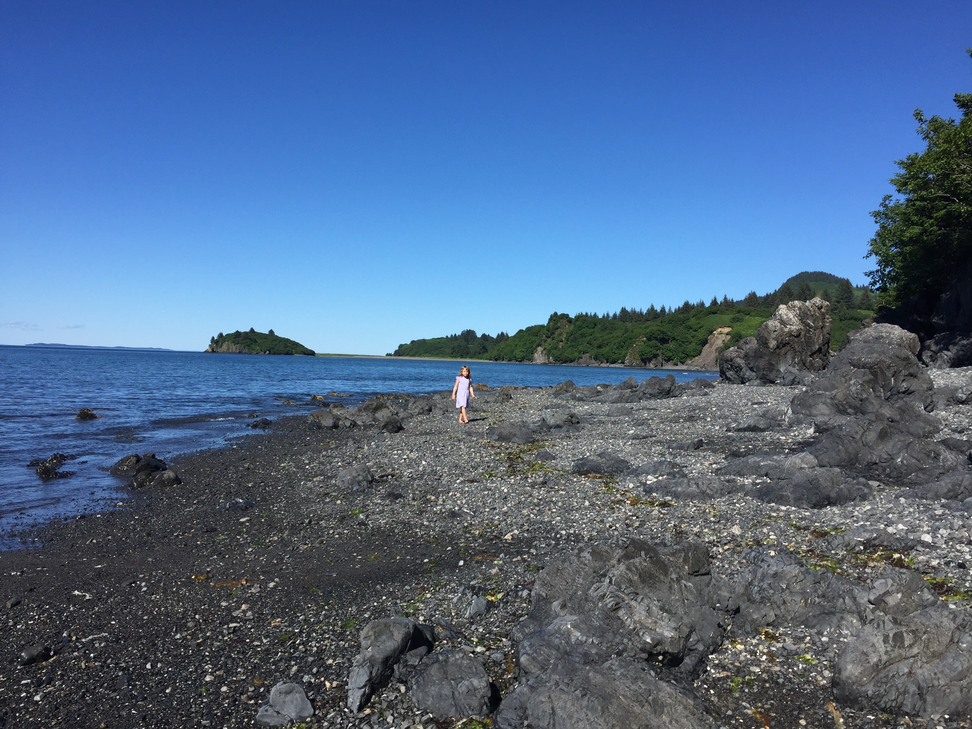The kids were playing really well together with their favorite activity being jumping off the stumps around camp into the tall grass. Around 8:15pm in eagerness Logan gave Eve a push off the stump before she was quite ready and she landed wrong. She was crying pretty hard, but her arm was still pretty straight so we iced her arm and gave her some ibuprofen. She sat in my lap and after a bit of crying fell asleep. She woke up before we left and was for the most part ok as long as there were no position changes, but if there was a change in position or anything touched her arm she would scream. At that point we knew we would be making a very late night trip to the ER. The sky on our way back to Kodiak (1hr drive). Taken about 11:45pm.