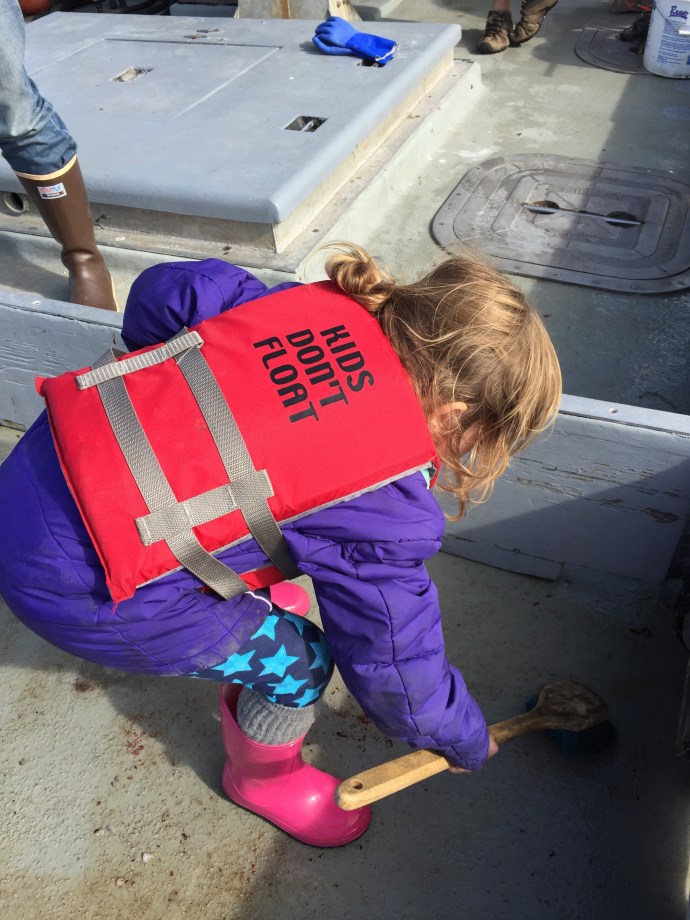 Eve working hard scrubbing the blood off the deck of the boat.