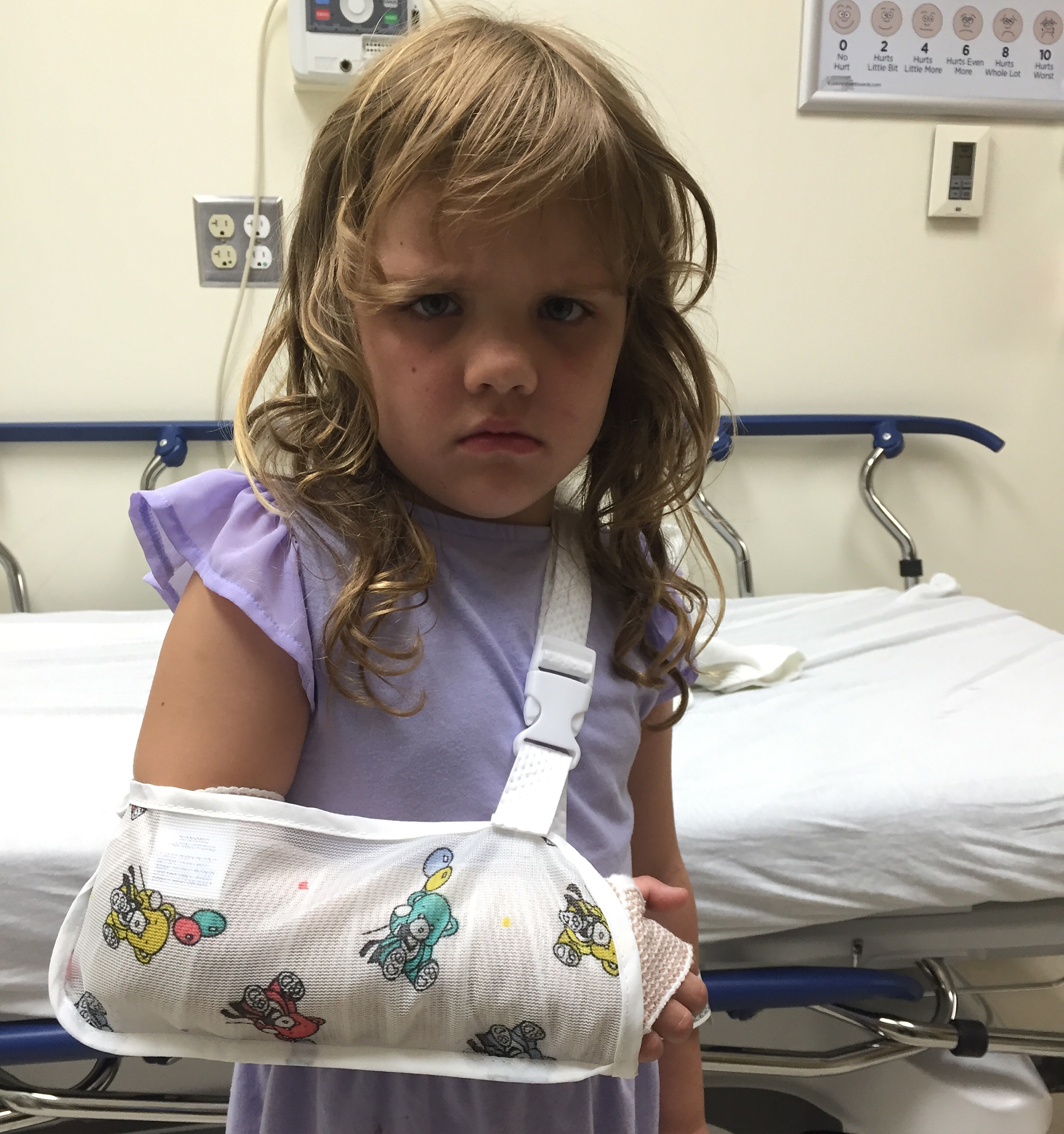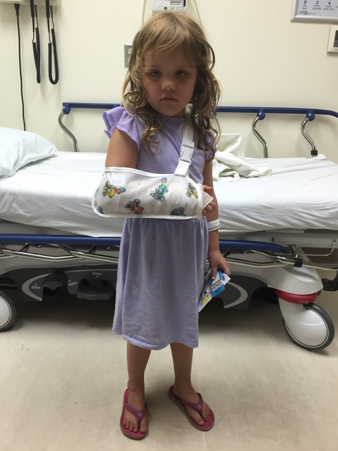 Sure enough her arm was broken. The right radius had a buckle fracture that would require immobilization and possibly casting for at least four weeks. She was a trooper answering all the Dr. and nurses questions by herself with us only having to add a few things. We discharged home at 12:20 AM.