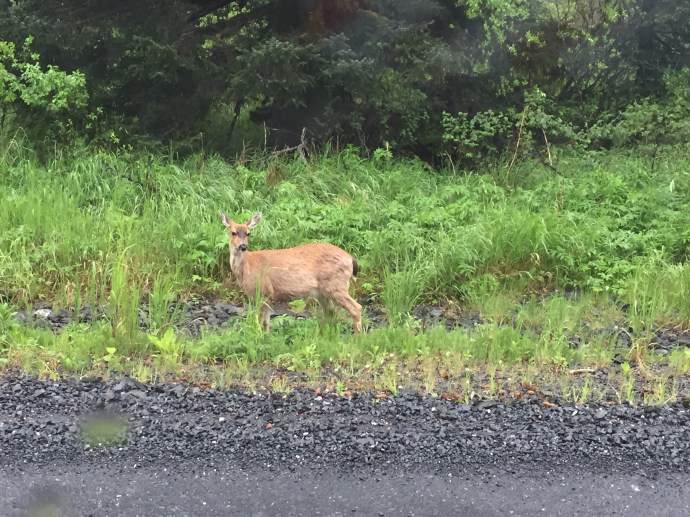 In the evening near dark 7:30-9:30pm of course it wasn’t really dark, but it was overcast and so it felt like late evening. There were animals out and we made it to the end of the public road past Chiniak. We saw four deer, bald eagles one who was pretty close to us, otters playing in the surf, brush moving from a animal who moved quickly from the road at the sound of the car coming, an old WWII runway, and miles of green rich forest and coastline, but no bears. Still, so fun.