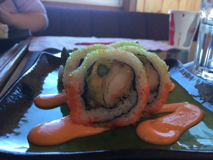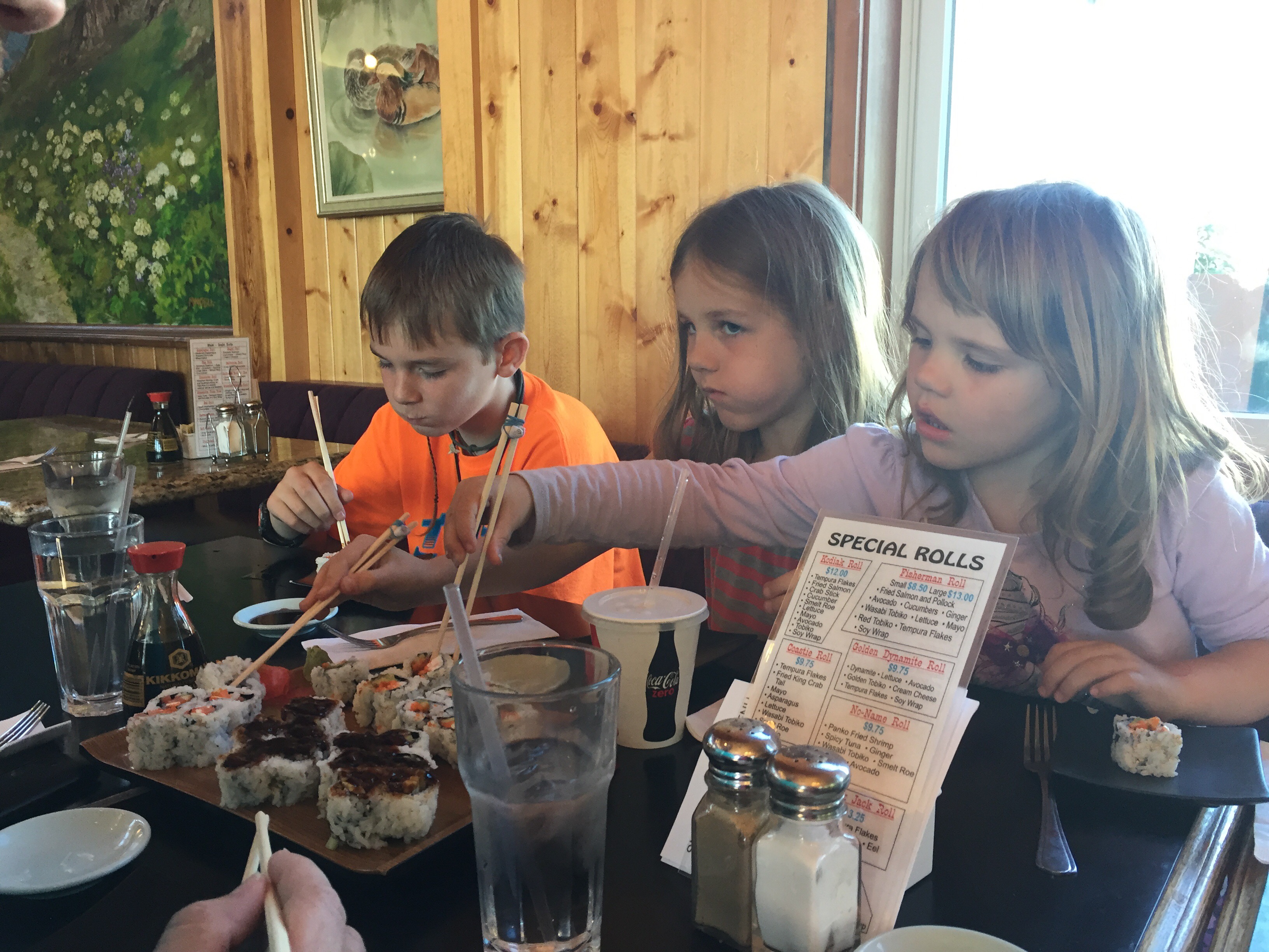 I had good intentions to stay up longer but I fell asleep on the couch waking up just before noon with all three of the kids sitting on me so I move to my bed and didn’t wake up until after three still sleepy and sluggish. At dinner time we ventured out and celebrated our birthday boy again over sushi dinner at The Power House. Below is the Costie (coast gaurd) roll. You can see the kids were completely enjoying. It was so much better than the Happy Sushi Time truck.