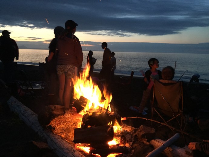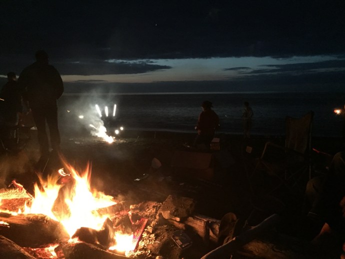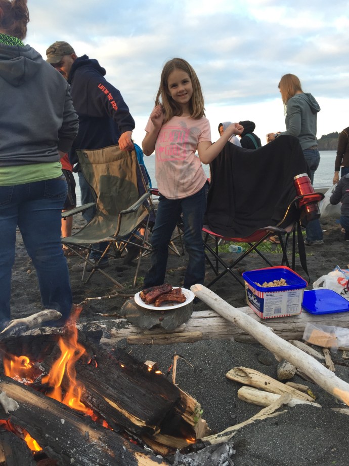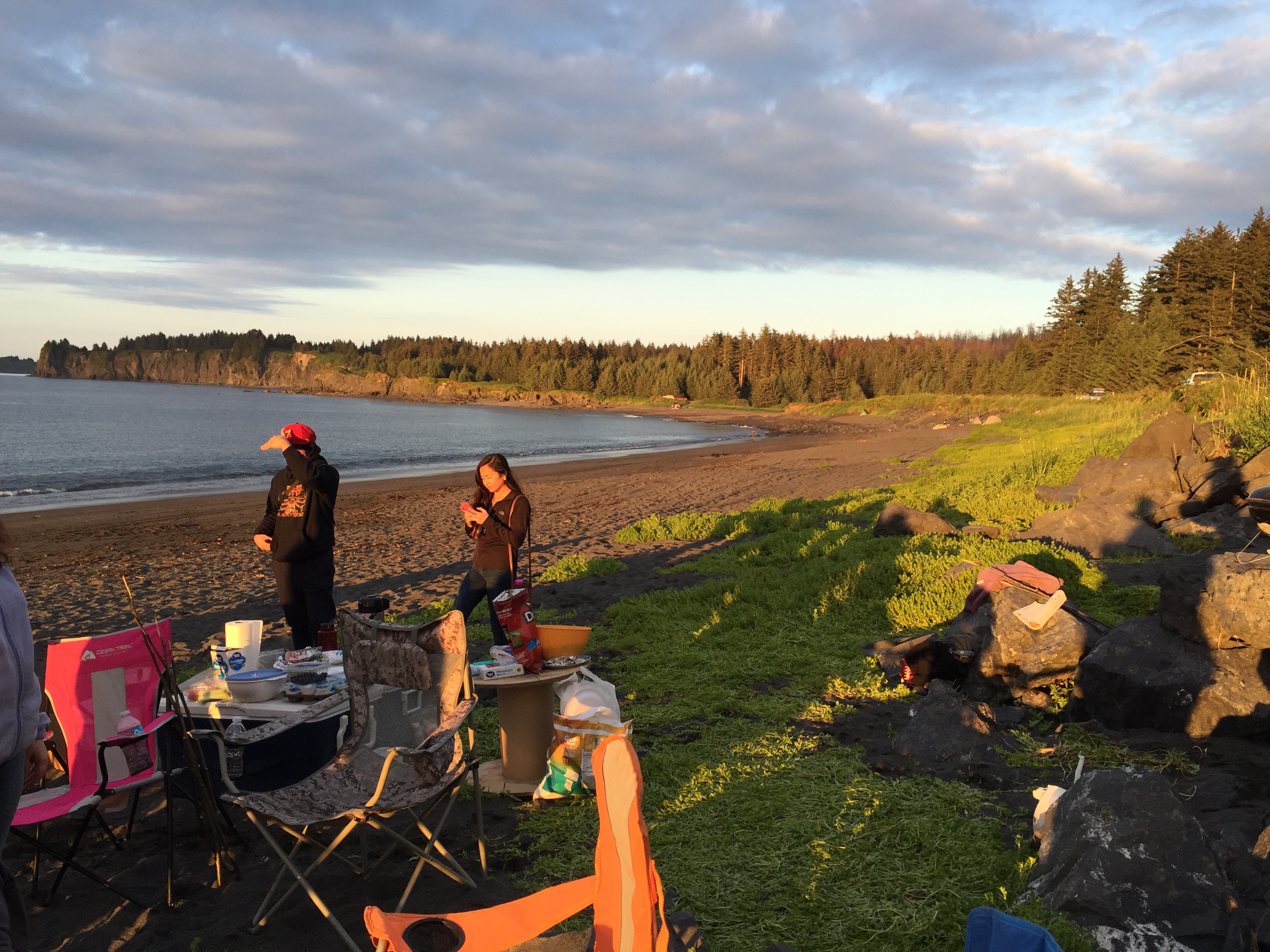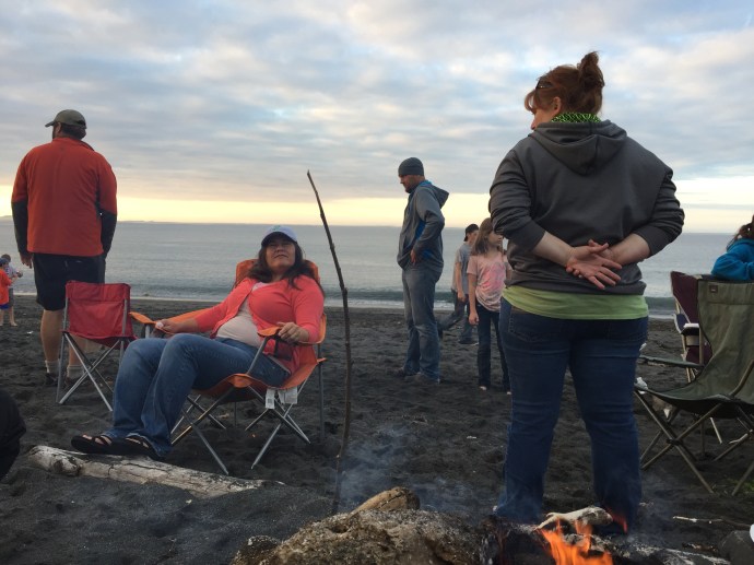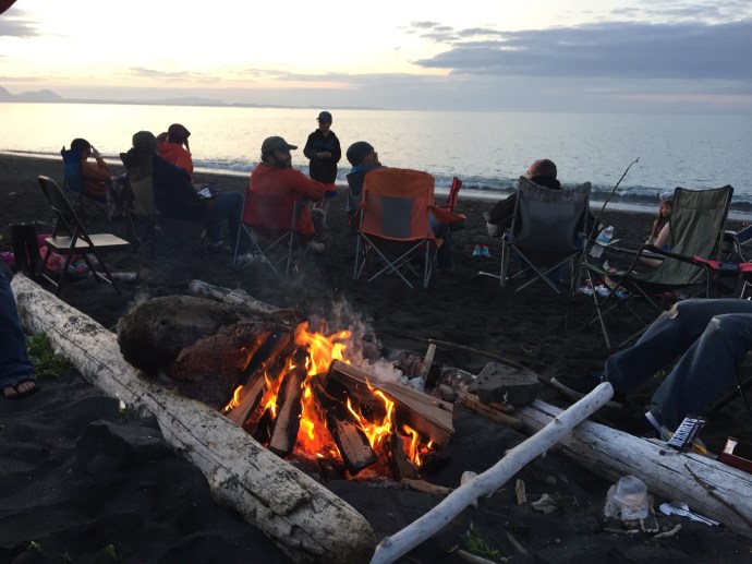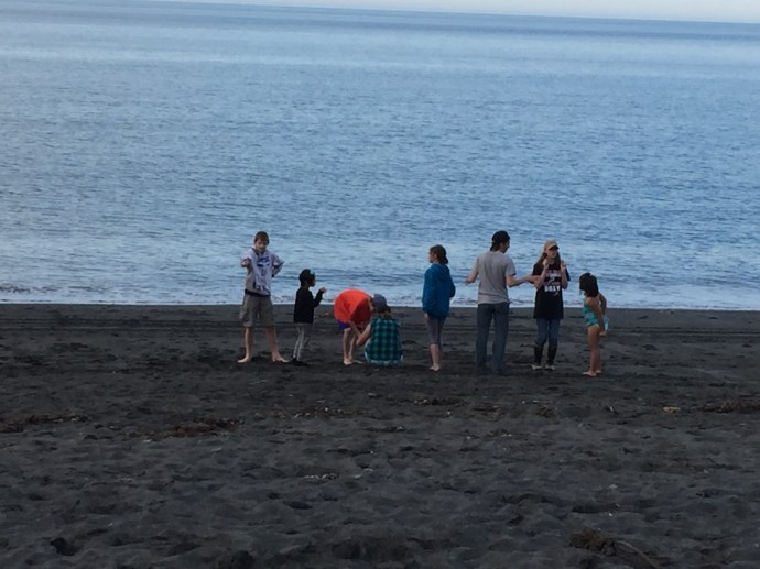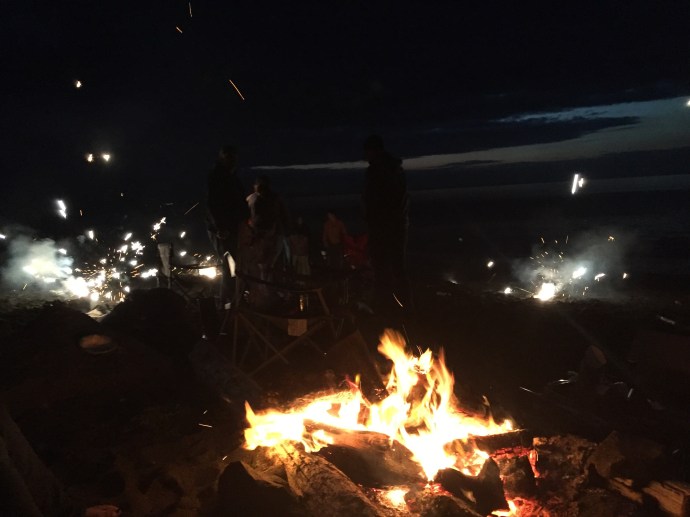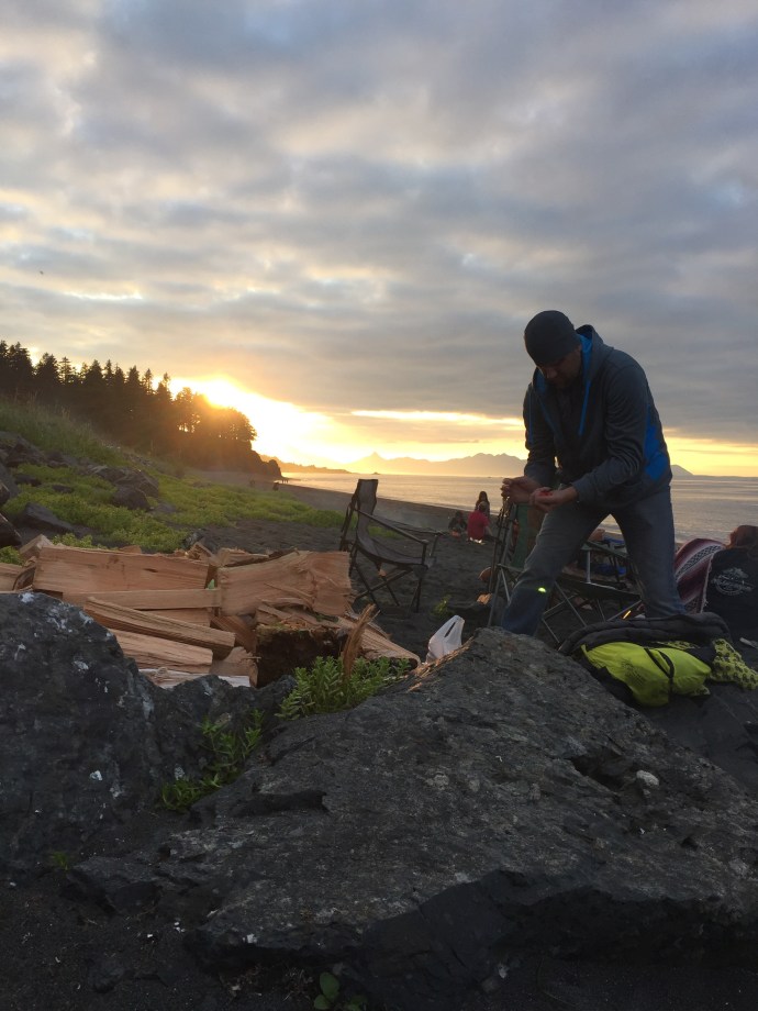 although we caught three fish total none of them were big enough to keep. The best place to catch a fish was at the edge of the lilies, because of that several times we ended up snagging our lines in the tree or amongst the lily pads. Sandra who was in shorts and water shoes was good enough to rescue the line. I wish I had taken a picture because especially the line stuck in the tree made for a very precarious rescue. After fishing we headed to Island Freeze a new frozen yogurt place that just opened up in town. We stopped on the way there for Chad to run into the fireworks stand to scope it out. Soon he came running out to grab a little extra cash disappearing with a promise to be back in two minutes. Sure enough he came trotting back it with a couple of bags of fireworks. We were going to be so late, thank goodness our friends were so forgiving. Island freeze was good, a little expensive for what it is, but there was a lot of combination options which made it extra fun with the kids. We bought one bowl of yogurt and all five shared it. We finished up there around 4:30pm. We ran home and had the kids change their clothes, Hannah must have grabbed her swimming suite because she had it when we made it to the beach. We then stopped and picked up a large package of hot dogs then headed towards Chiniak. It is a long drive out there so I reclined my seat and covered my head in hopes of getting in a short nap. It took us a little while to find out group and one of the beaches we checked out there was a minke whale about 50 yards out into the water we noticed it right away has it breached the water flopping down on it’s side. Then it preceded to come up and show it’s back blow its air and Bob along the surface parallel to the beach. Wow! So crazy. So weird to have it so close to shore. I hope it is not swimming in that close because it is sick. We continued up whale bone hill finding our group on the other side. We arived around 7:15pm. It may as well have been 4:00pm the kids took off with their friends playing. We enjoyed watching them while visiting. I was short on memory so I didn’t take many pictures. The plan was to wait until dark then light the fire works, although the sparklers, bunker busters, and bottle rockets got a head start. The kids (and Chad) have been looking forward to the fireworks here in Alaska all of the fireworks and firecrackers for that matter, that are illegal in the lower 48 easpecially Oregon are legal here. With supervision by Chad and Richard Caleb was lighting off mortars and gave us quite a show.