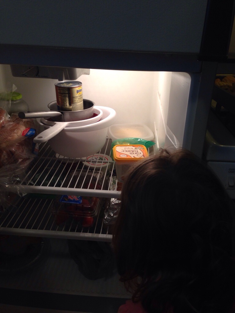 After several hours we took the curds down and put them in the refrigerator, in the bag, in the strainer with some heavy cans on it to add weight and pull out even more moisture.
