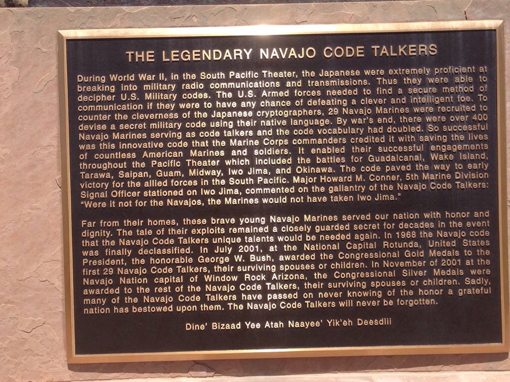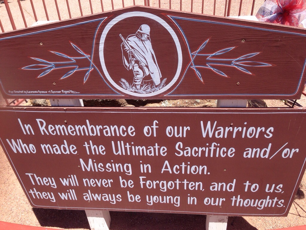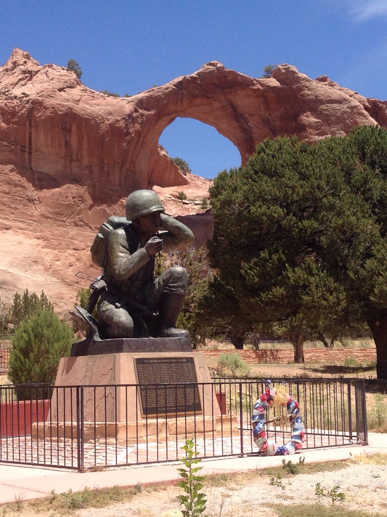 Gallup was bigger and cuter than I thought it would be. There appears to be a mall and Home Depo as well as other big chain stores, then you get down town and you can just see the age on the buildings, but they don’t look rundown at all, just dated. And in this case dated was good. My next stop was only slightly out of my way and that is Window Rock and the Code Talker Memorial. I met a Native gentleman there selling pots who grew up in Salem living with his grandfather. It is a small world.