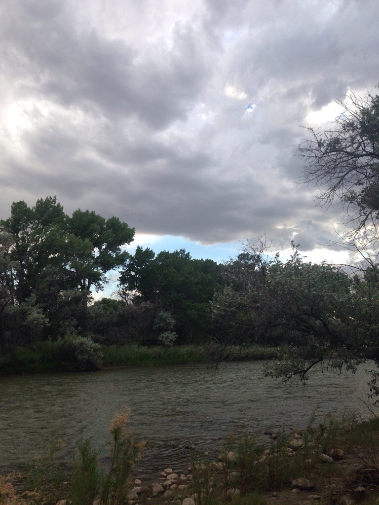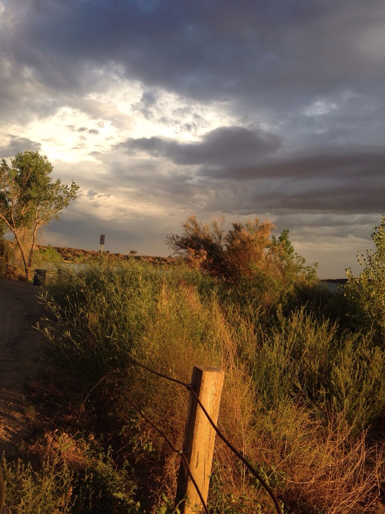 Monsoon Season here in New Mexico is July, August and September. Monsoons are very heavy rains that last only a short time and frequently cause flash flooding. New Mexico and Arizona both get the majority of their years worth of water via the summer monsoons. We have been warned by lots of people that they are coming and today on our greenbelt walk I thought we (Myra and I) might be in for our first monsoon. But no, we were in for a different kind of experience, dry rain. That is where it rains, but because it is so dry and hot the rain doesn’t actually make it to the ground before it evaporates. It made for a cooler walk but I was secretly hoping to get dumped on.