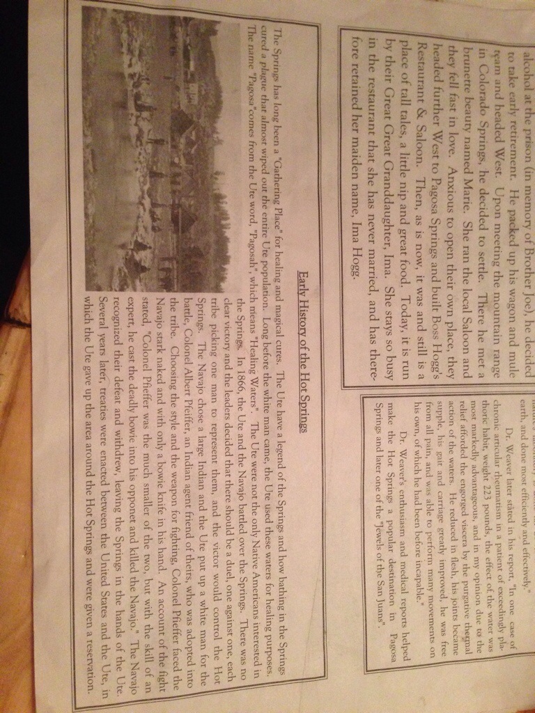 It was definitely lunch time when we pulled into Pagosa Springs. Our stomaches were insistent on that. We picked a cute little restaurant called “Hoggs Breath” named after Boss Hogg, the founder of the establishment, originally called Boss Hoggs Restaurant and Tavern. We enjoyed reading the history of this little place as well as of the town and the hot springs in their newspaper like menu.