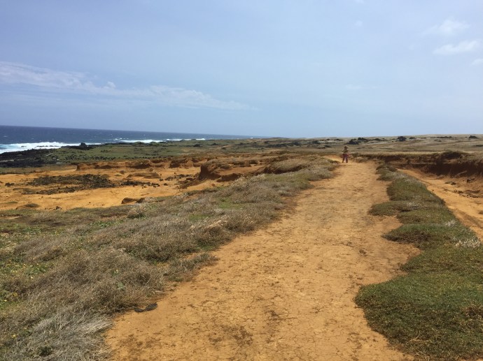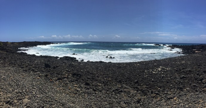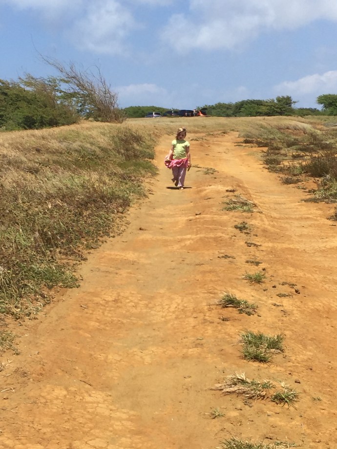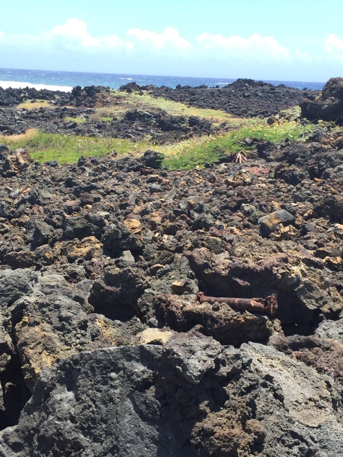 There are only four green sand beaches in the world. It I s supposedly colored by a precious stone called Olivite created somehow under the perfect volcanic induced circumstances the crushed by the strong waves. It’s particles mixed in with the black sand from the lava rocks pulverized by the same strong waves make for a dark green color to the sand. We couldn’t wait to see it for ourselves, that and it was just time for a long hike. The wind greeted us as we got out of our cars at south point. That and several other locals asking if we wanted rides out to the beach for $75 for the five of us. It was a three mile hike in the sun, but the hike was part of the experience. The breeze was perfect and kept us from feeling like we were baking in the sun. The path was rough and we were slow. It took us about two and a half hours to get the whole crew that far. Several people stopped and asked us if we wanted a ride, we thanked them but declined. We stopped and ate lunch as it was around 1:30 and the kids were hot, hungry and tired.