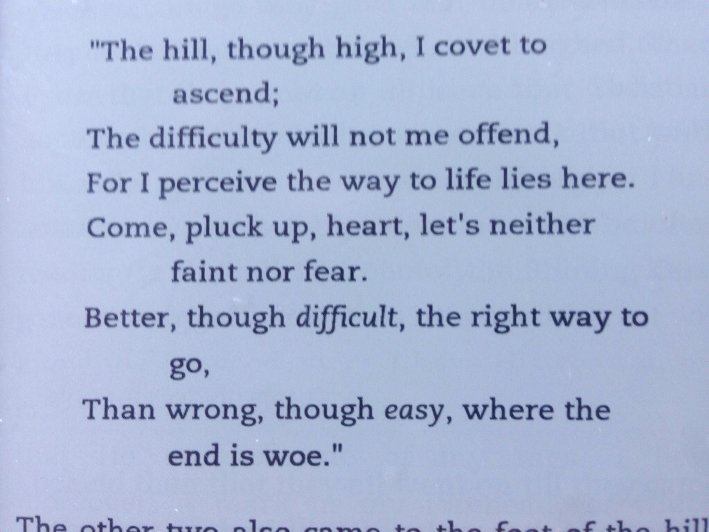 Out of our reading from “Pilgrims Progress” today. I know this is true and may I take it to heart and remember it when I am making little decisions all day, big decisions, when I am going through hard places, and when I am tempted to take the easy way out.
