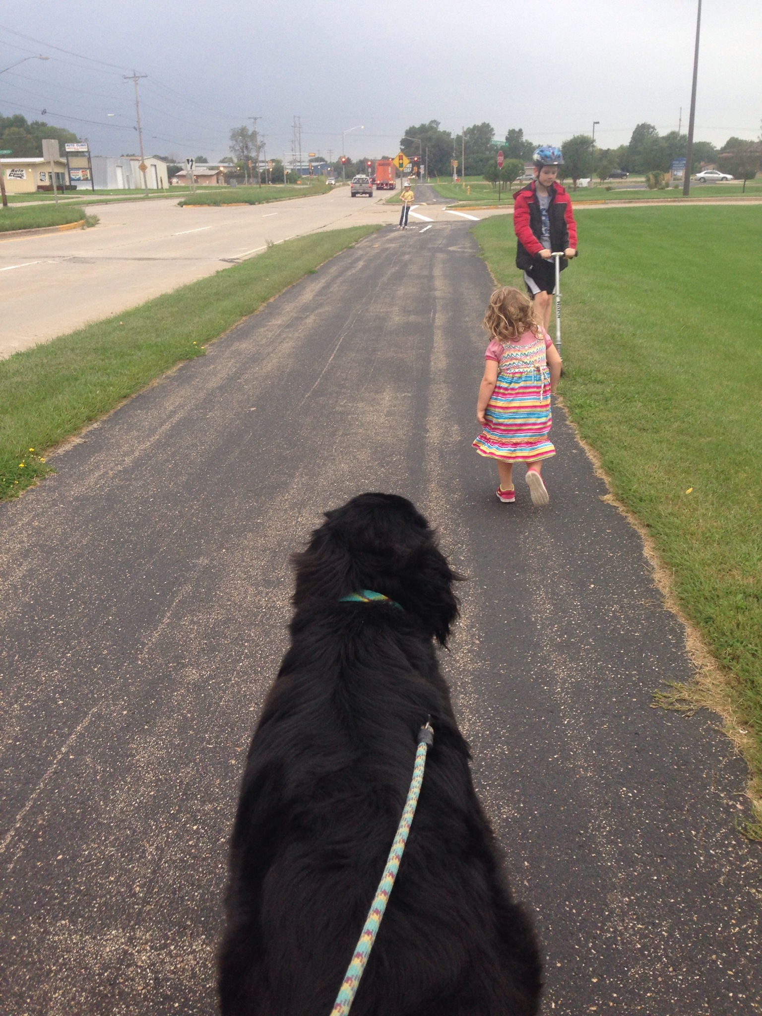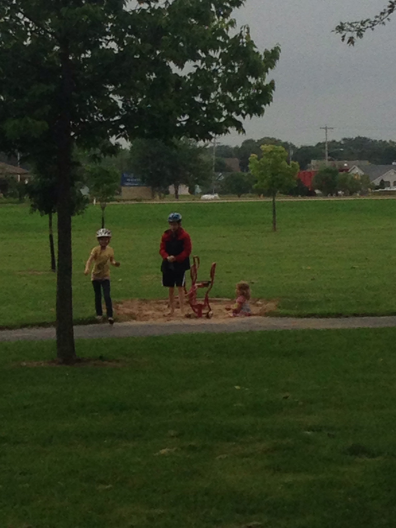 There are no dogs allowed at the actual park so Myra and I paced up and down the road while the kids played. It was misting/sprinkling and we could hear the thunder and watch the storm clouds coming through, but we figured it was the end of the day if we get soaking wet who cares…it’ll be just part of the fun.